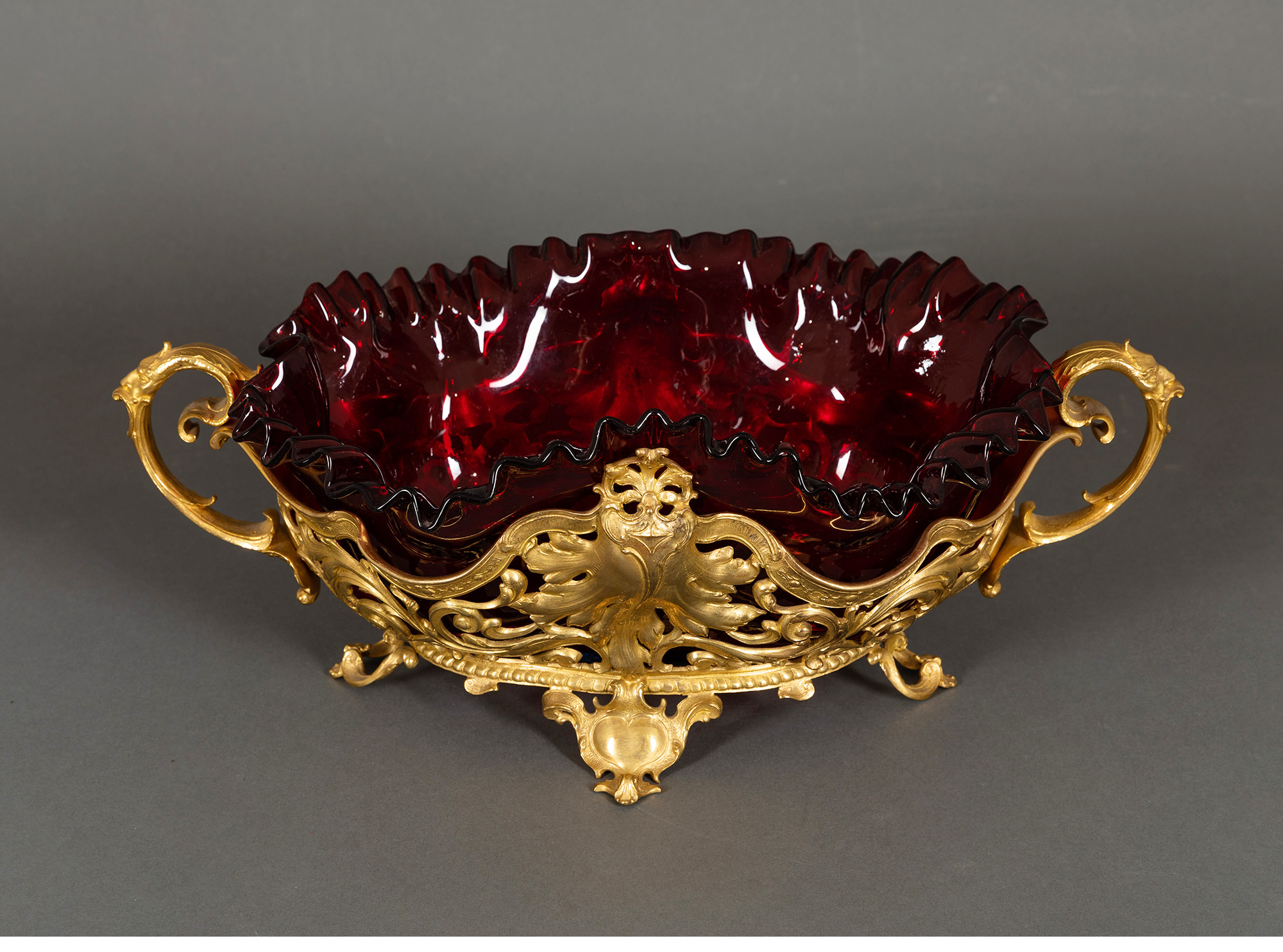 独角鹿西洋古董法国路易十五风格铜鎏金镂空雕花修饰红色水晶果盘