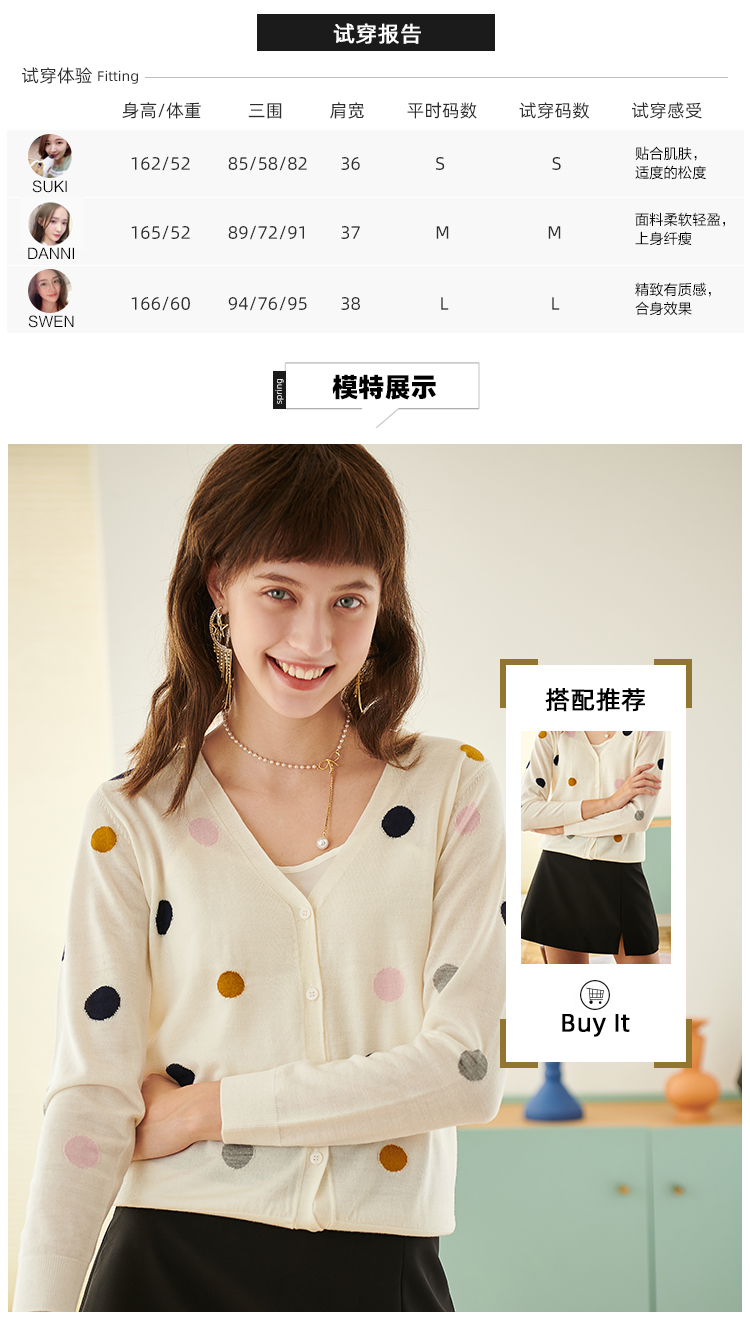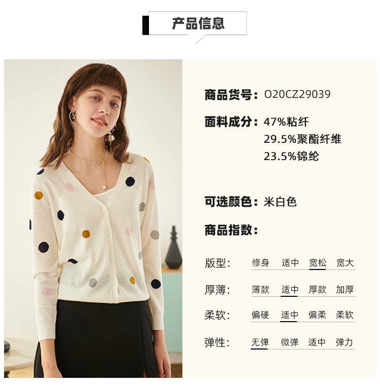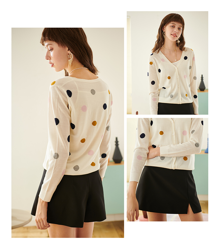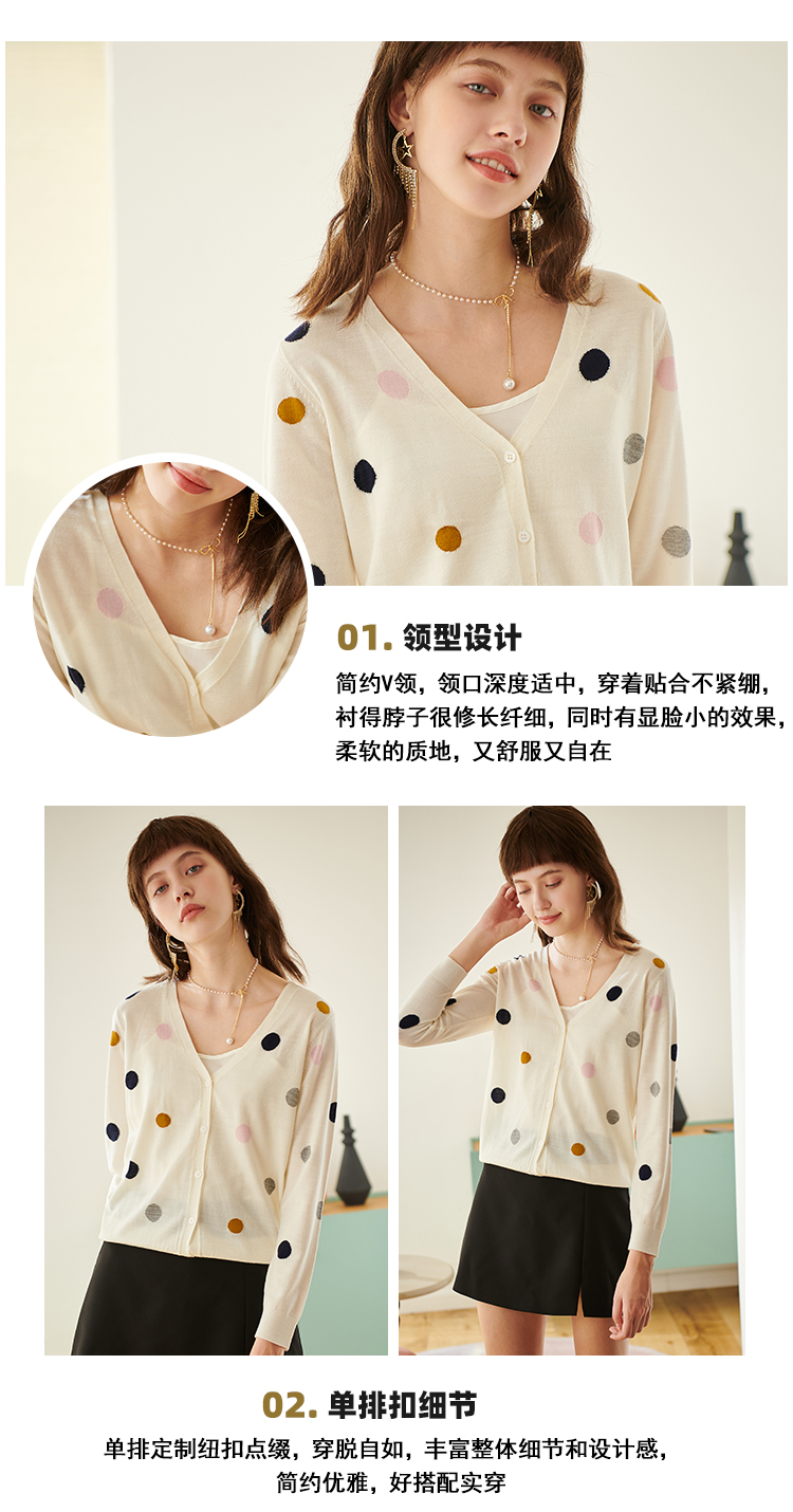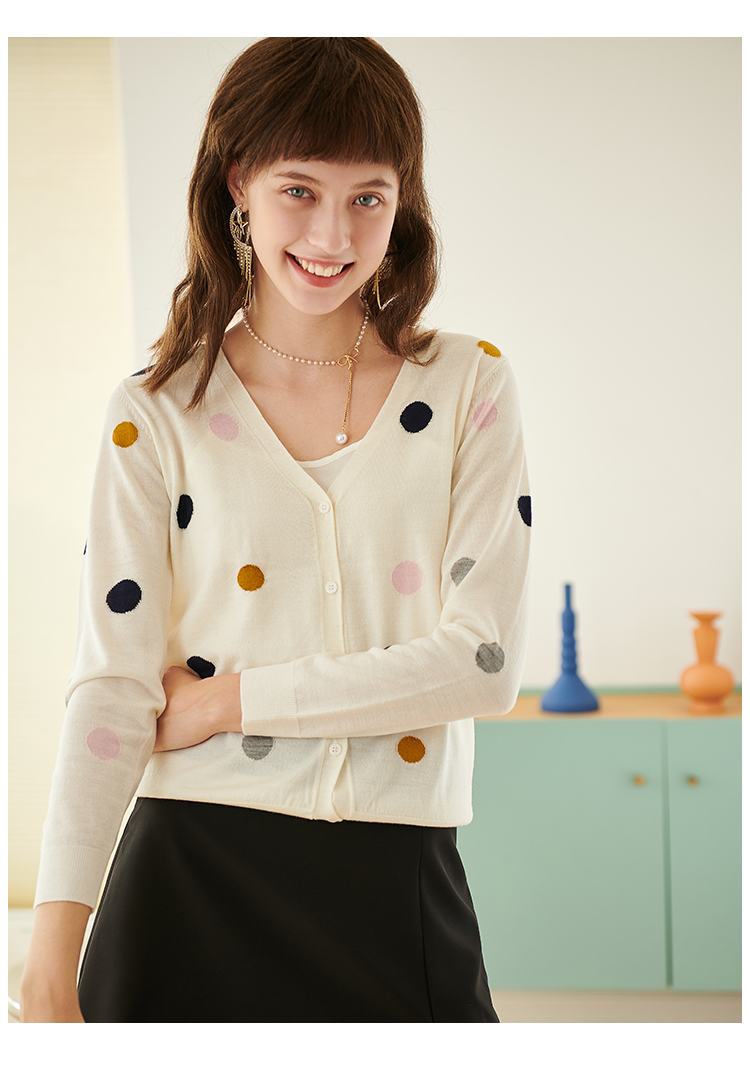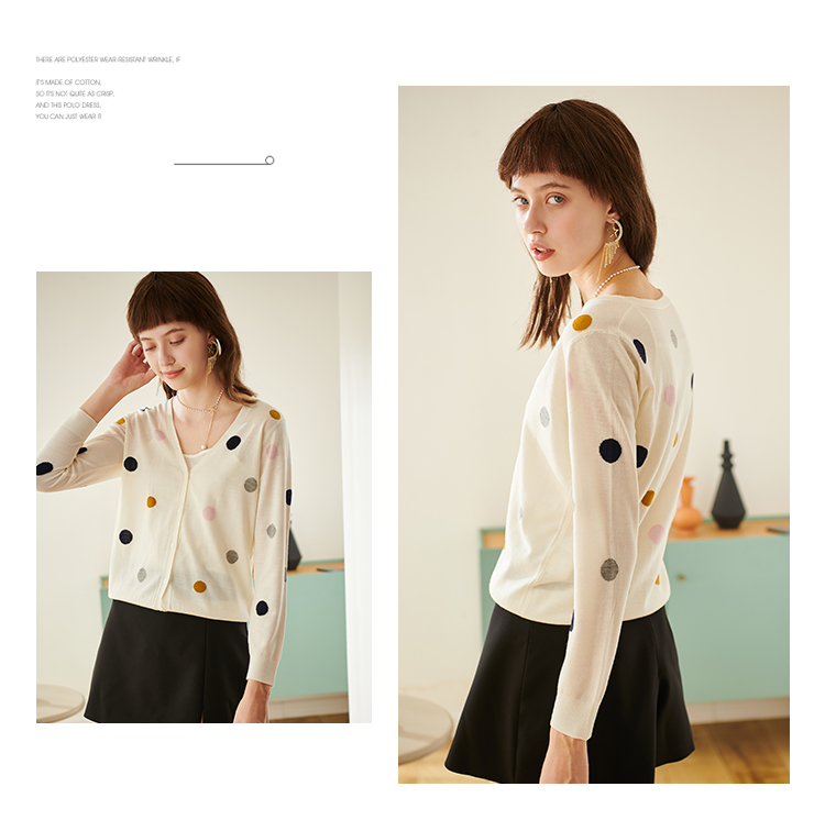欧芮儿春新款长袖V领开衫毛衣女气质内搭打底波点针织衫