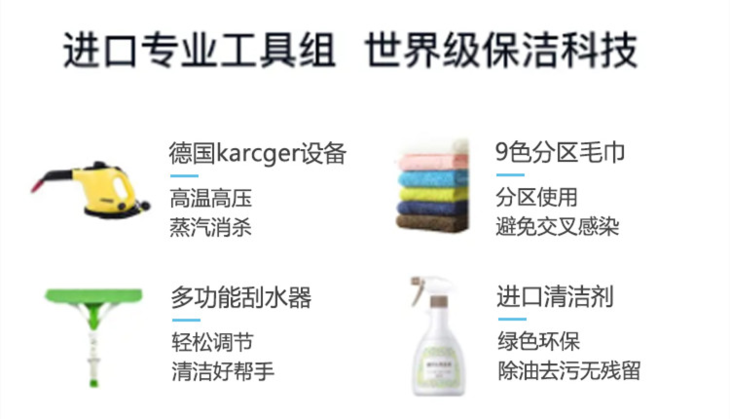 11、保洁人员经过专业培训,上门时均自带保洁工具、清洁剂、水桶、保洁毛巾、垃圾袋等。如需使用自有工具及清洁剂,请提前告知保洁师;