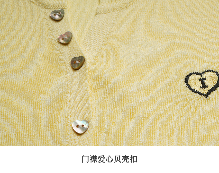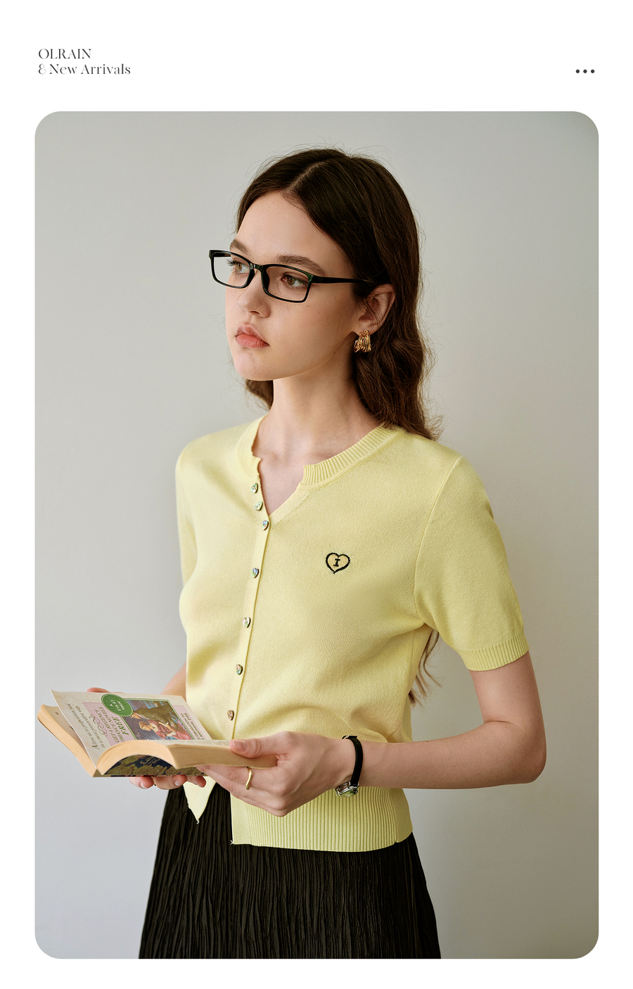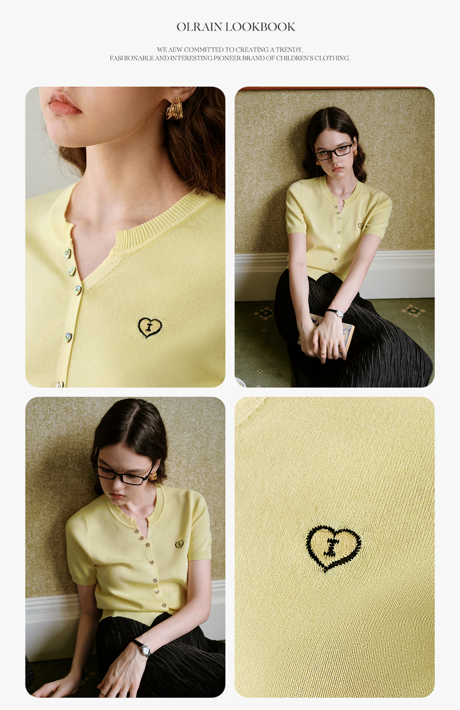 OLrain欧芮儿黄色刺绣毛针织开衫女夏季2025新款V领简约短袖上衣