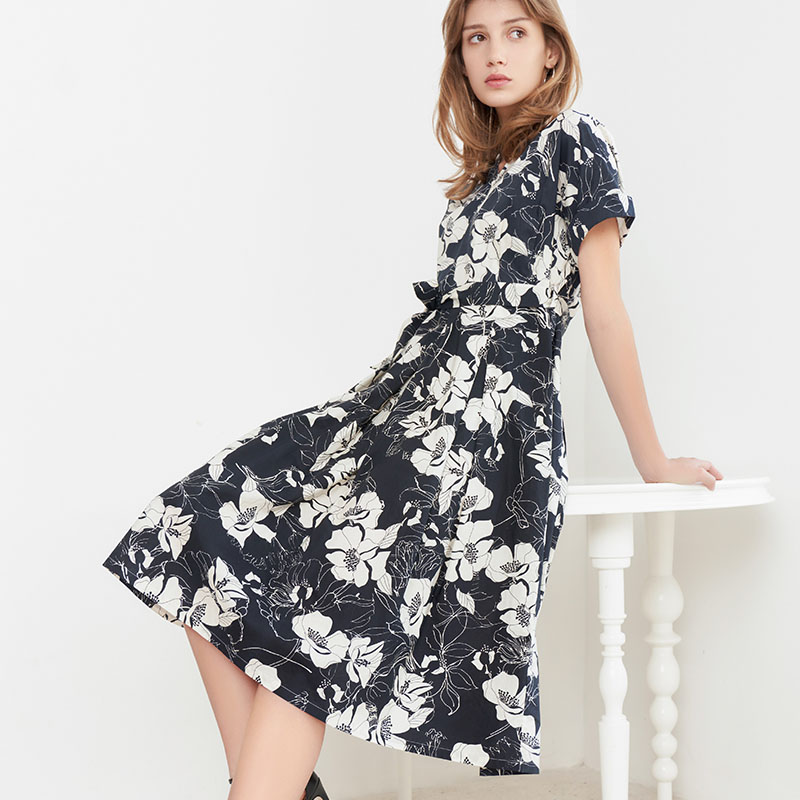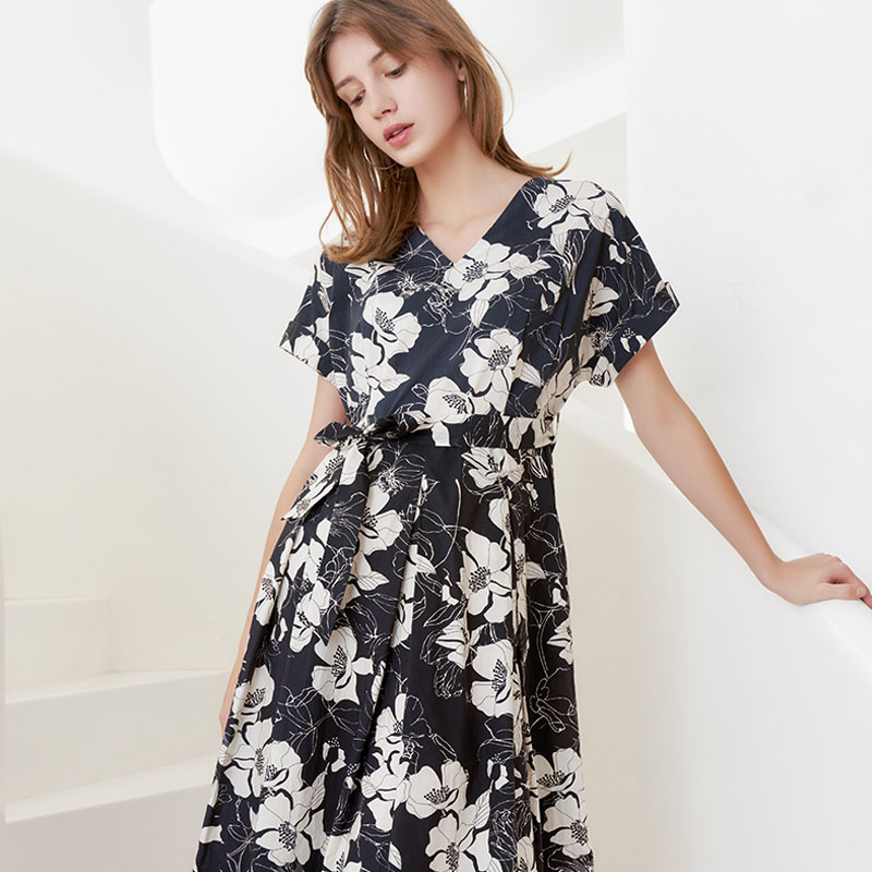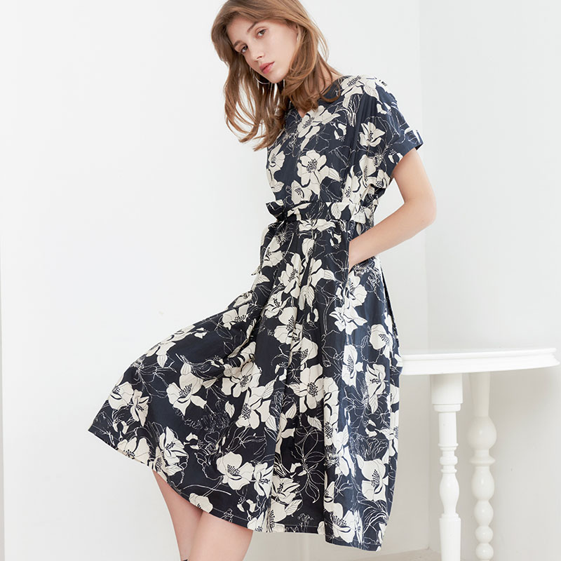 【纯棉印花连衣裙】23年春夏新品女士中长款连衣裙时尚V领系带裙子