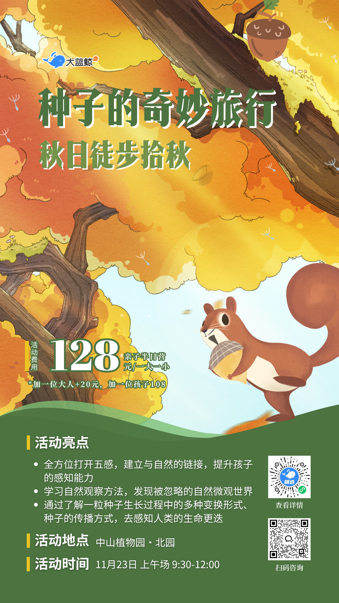大蓝鲸爱研学|【亲子半日营】亲子趣玩,走进秋日的大自然,跟着种子去旅行,捡秋拾秋,一起探究种子的一生!