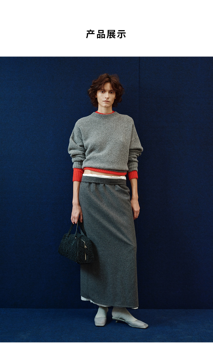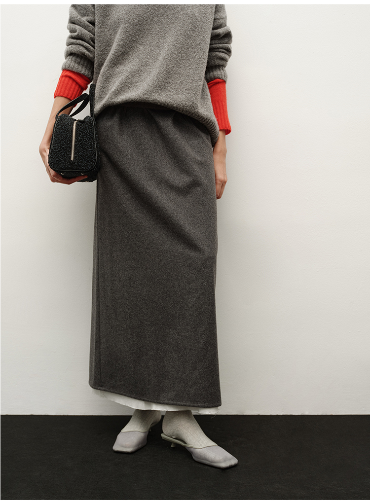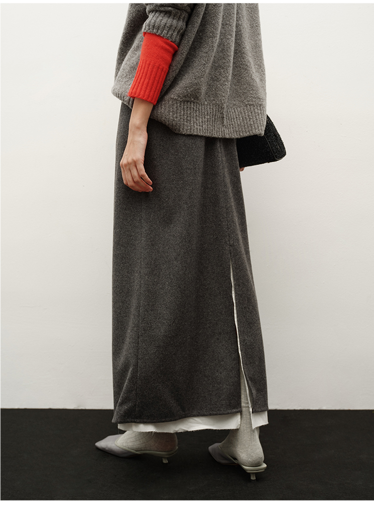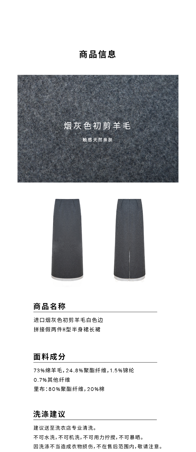 HIDEMI 进口烟灰色初剪羊毛白色边拼接假两件H型半身裙长裙