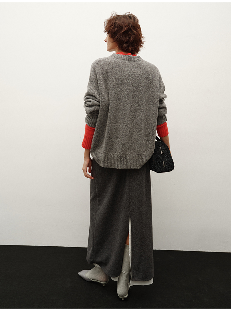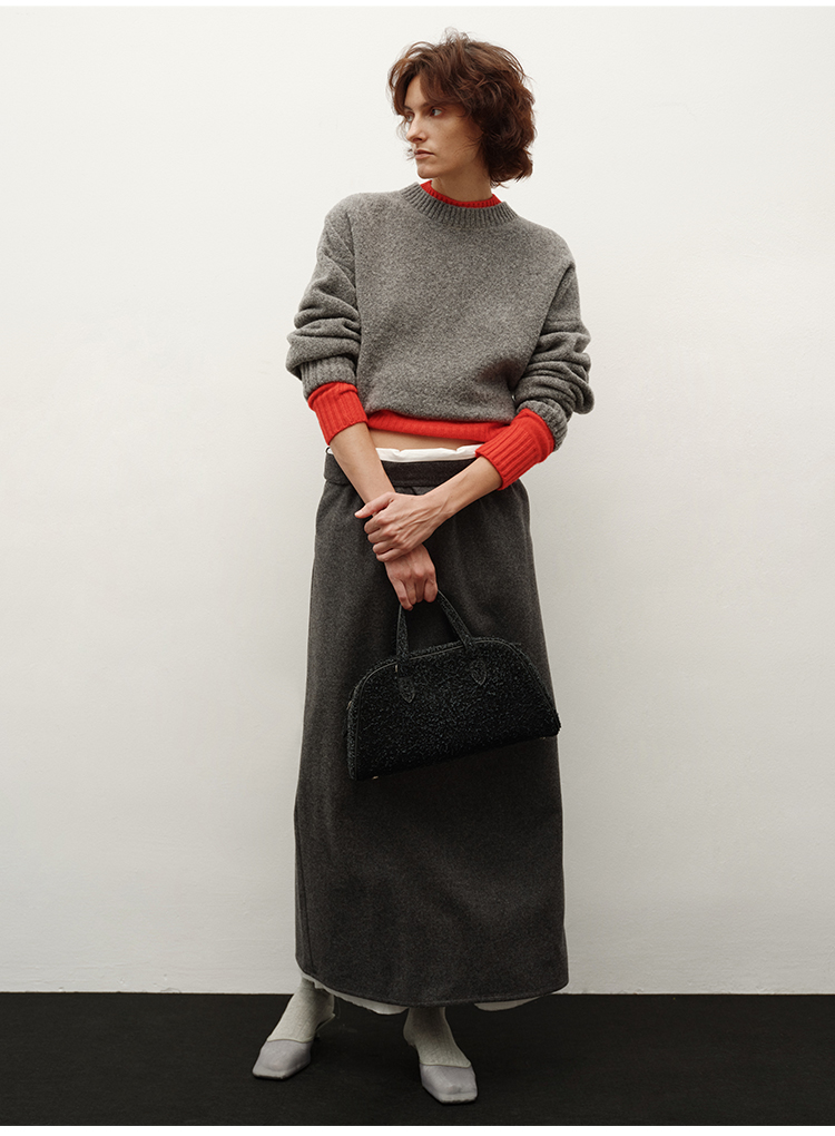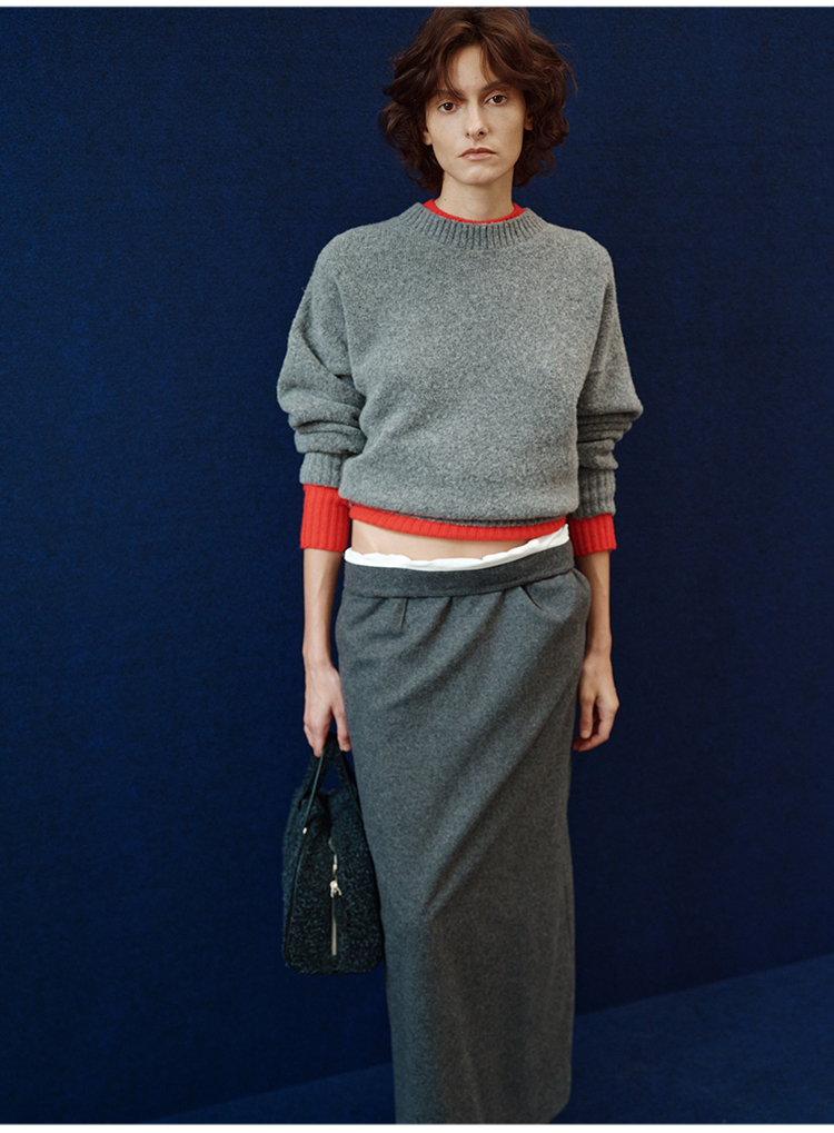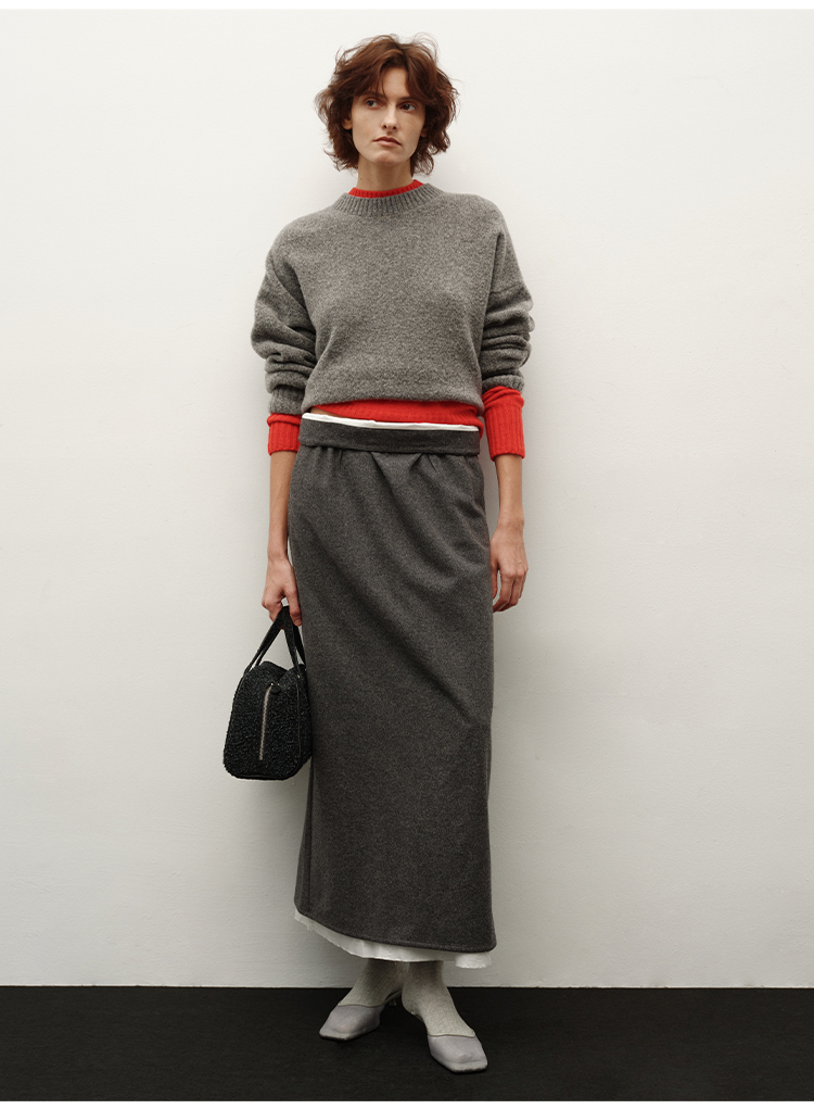 HIDEMI 进口烟灰色初剪羊毛白色边拼接假两件H型半身裙长裙