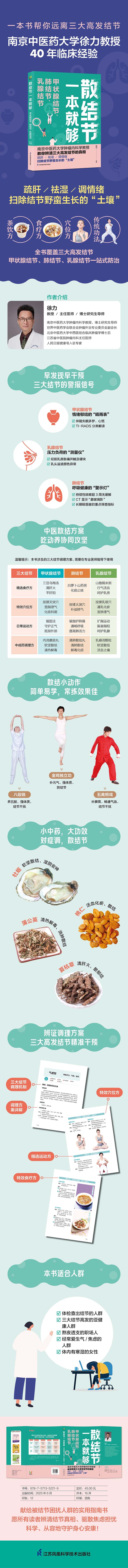 这是中医肿瘤内科专家徐力教授写给结节高发人群的健康科普书。随着生活节奏加快,越来越多的人出现肝气郁结的表现。痰浊血瘀随着“肝经”循行到喉咙,聚结于颈就形成了甲状腺结节;聚于乳络,就是乳腺结节;痰湿互结,聚于肺络,就是肺结节。在多年的临床实践中,徐教授认为肺结节、甲状腺结节、乳腺结节这三种高发疾病,是“一根藤上的三个瓜”,并顺藤摸瓜,从源头上挖掘疾病的形成深因是肝郁气滞,而疏肝解郁是化解三大结节的“撒手锏”。书中针对三种结节给出相应的辨证施治方法,如肺结节,重在疏肝理肺;甲状腺结节,重在疏肝健脾;乳腺结节,宜疏肝活血,并分别从中医验方、药膳、食疗、经络、功法等方面帮助读者根除结节滋生的土壤。