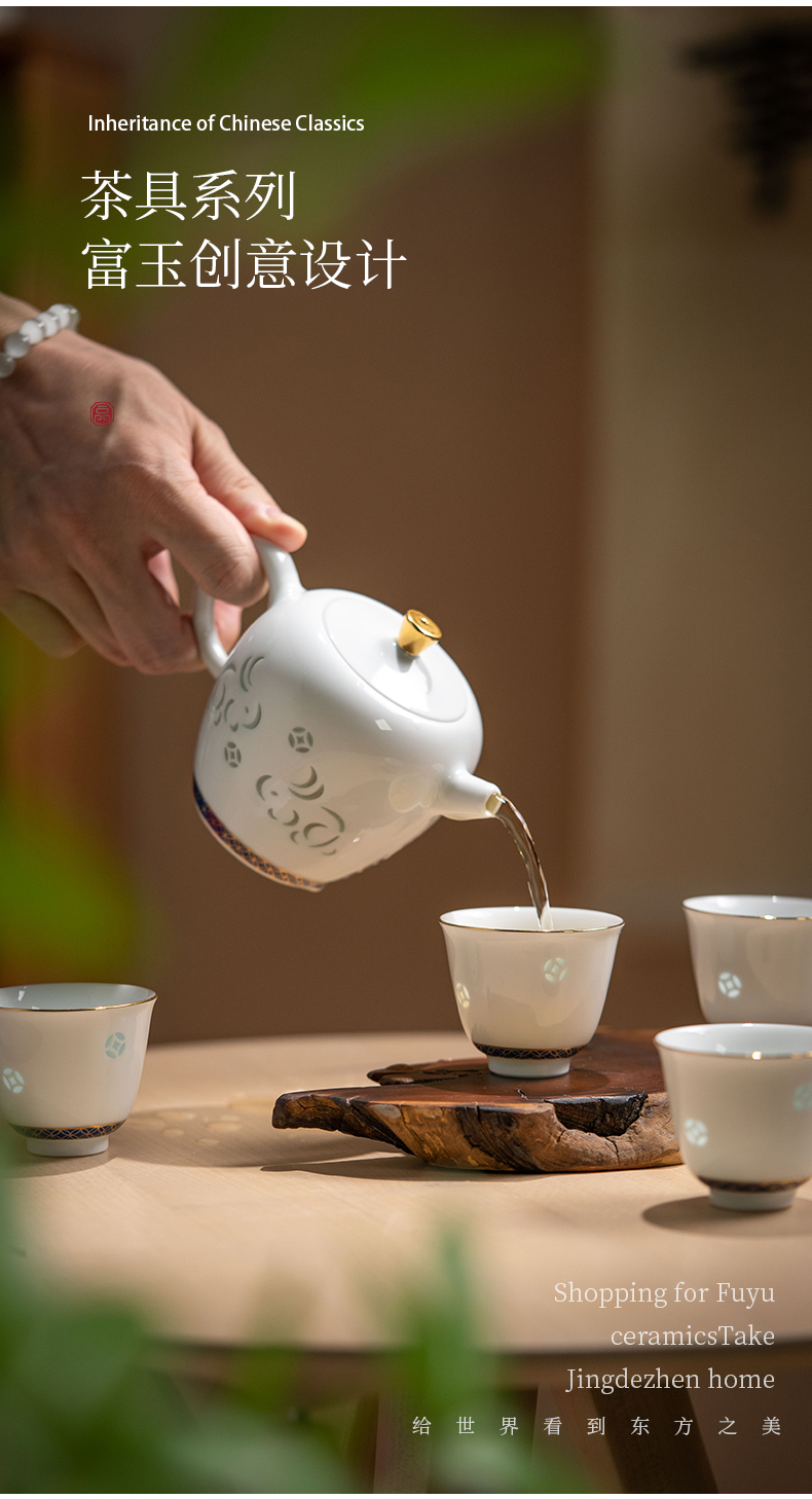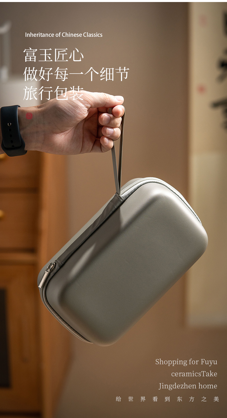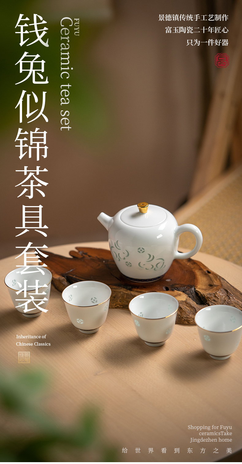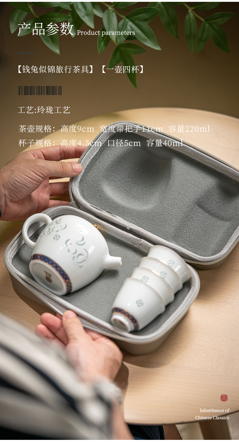 富玉 景德镇玲珑陶瓷茶具旅行户外便携茶具钱兔似锦一壶四杯