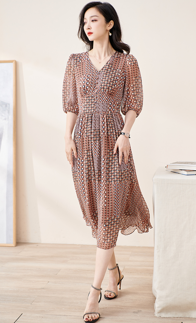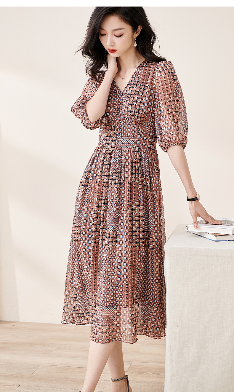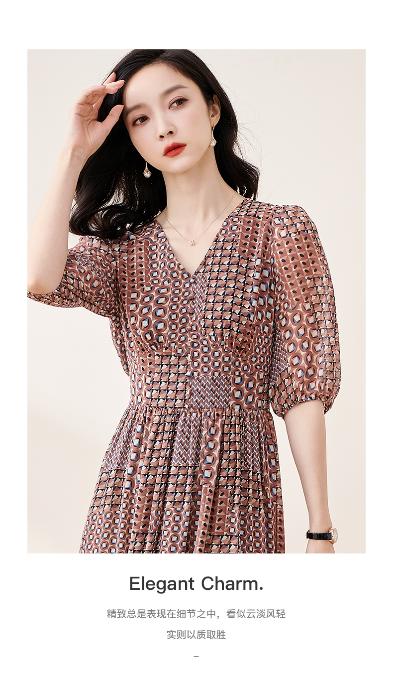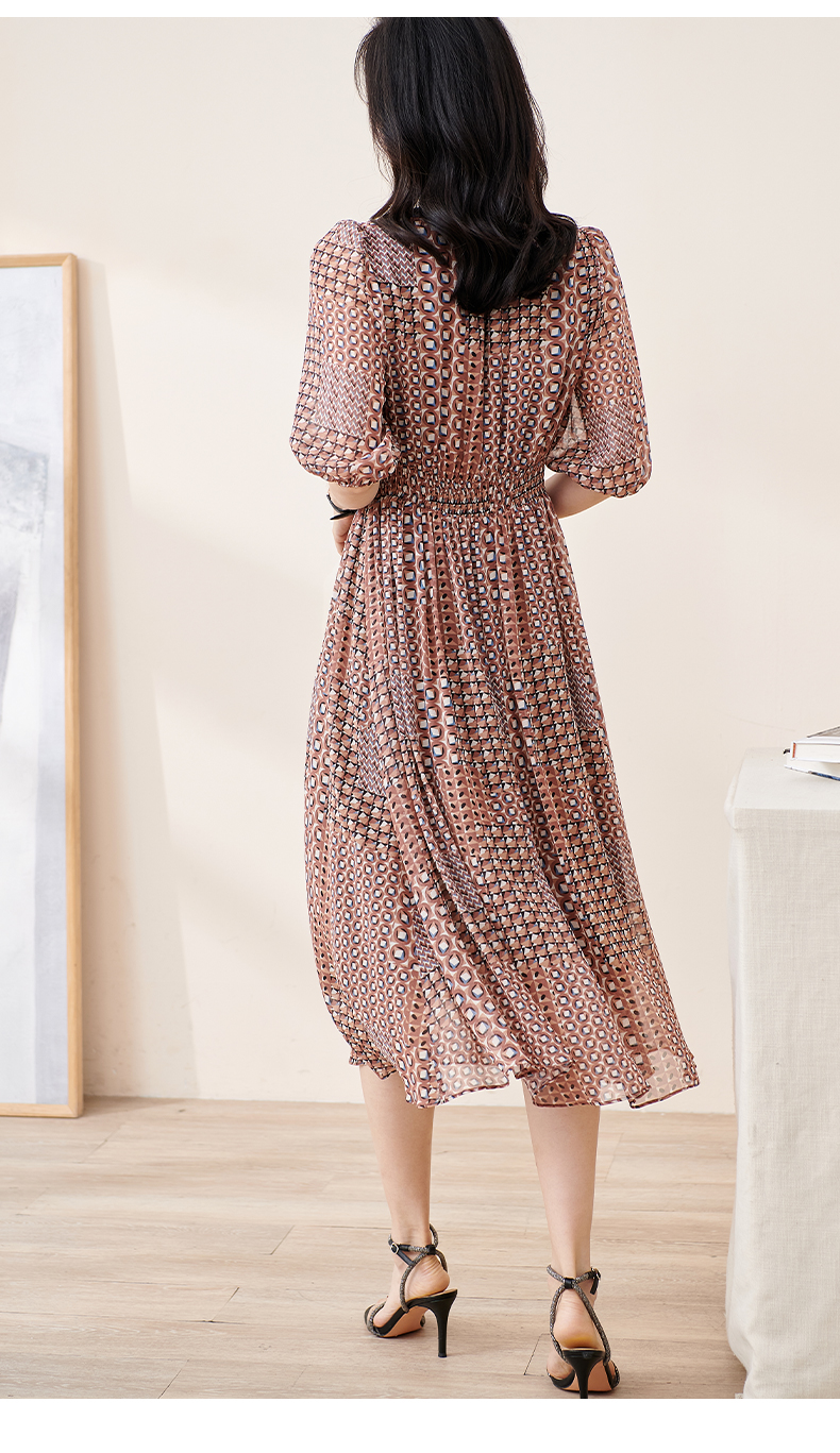 剩S/M/L 米思阳2025夏季新款知性复古印花灯笼袖连衣裙收腰大摆雪纺裙1899