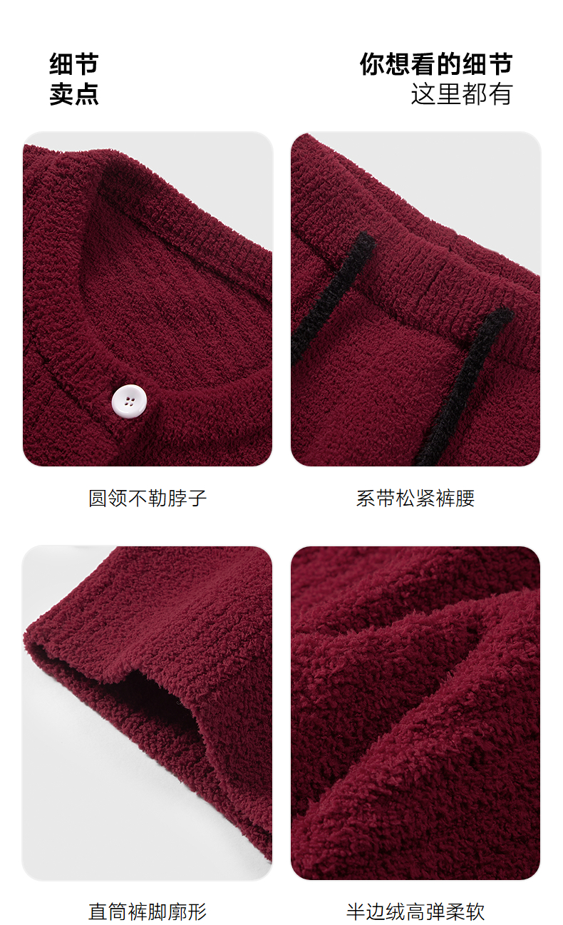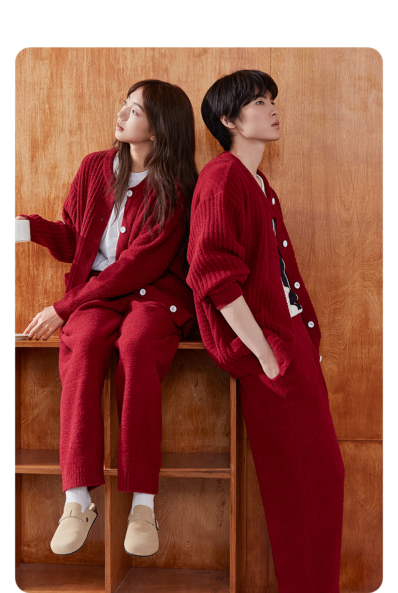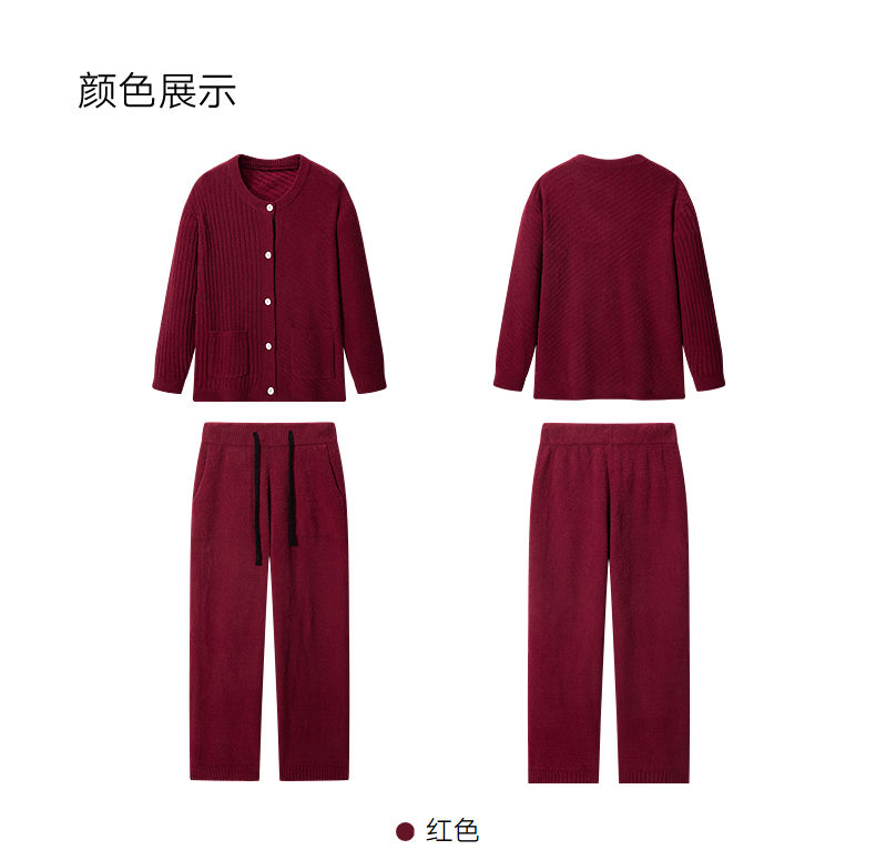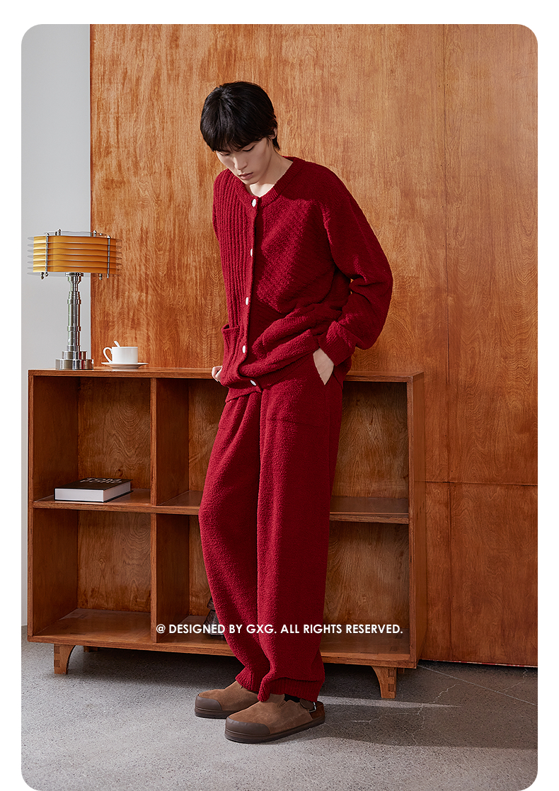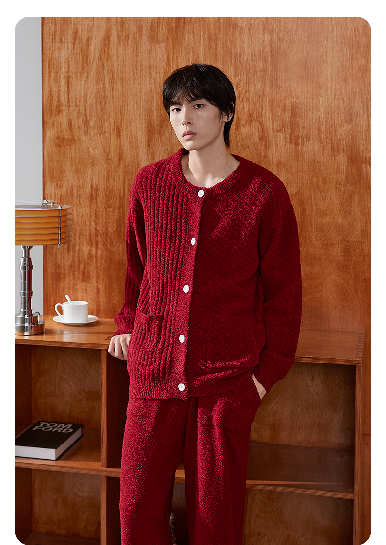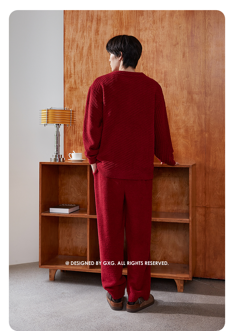 GXG男士家居服 红色肌理圆领开衫长袖保暖舒适睡衣套装冬季款