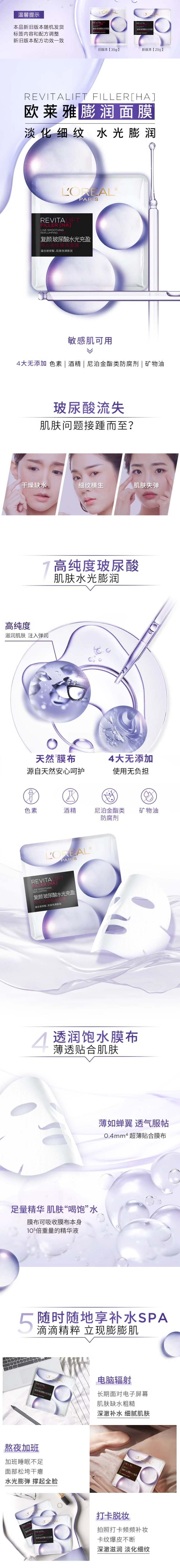 【57元会员福利】欧莱雅复颜玻尿酸水光充盈导入淡纹膨润面膜29g*5片 淡纹膨润精华面膜