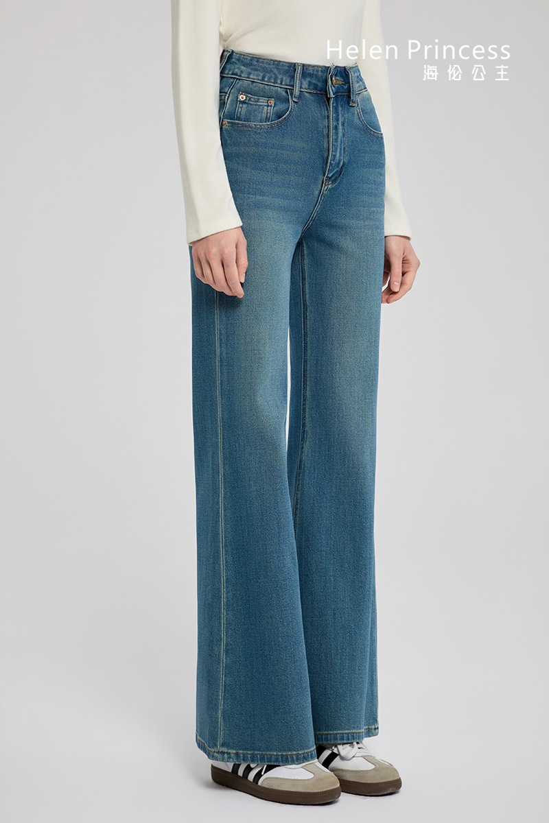 经典水洗蓝牛仔面料,柔软透气且富有质感,呈现自然做旧效果,复古韵味十足。宽松喇叭裤型高腰设计贴合腰线,拉长身材比例,视觉显高显瘦。