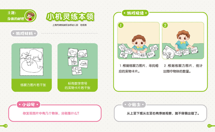 同样与教师用书相对应,幼儿用书也是按主题有多个小游戏和小实验。但幼儿用书的配图更加儿童化,游戏玩法也是用卡通图来表示,让幼儿可以看得懂。并且产生兴趣。让孩子带着问题玩游戏,并在游戏后能解释该游戏所蕴含的科学原理。