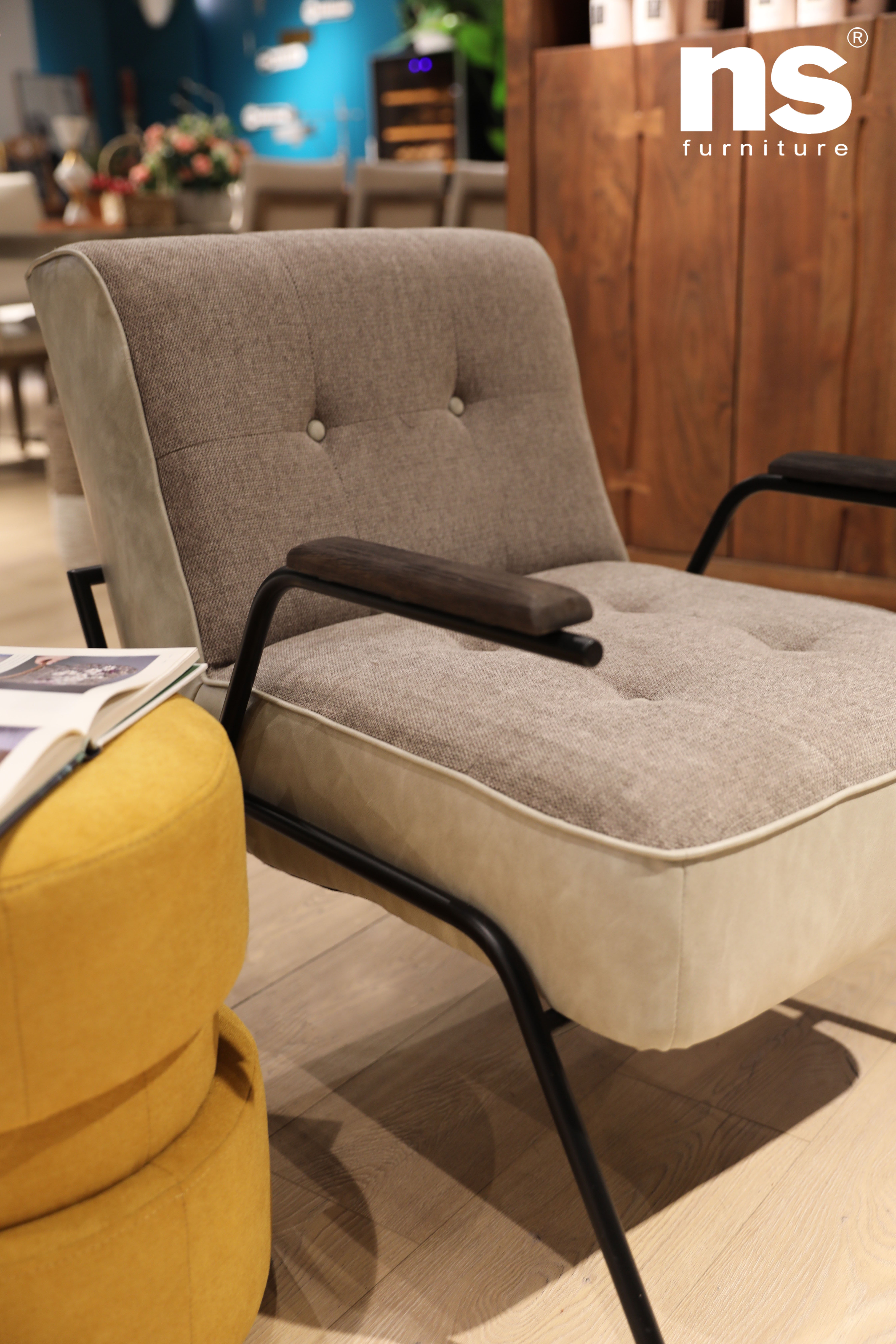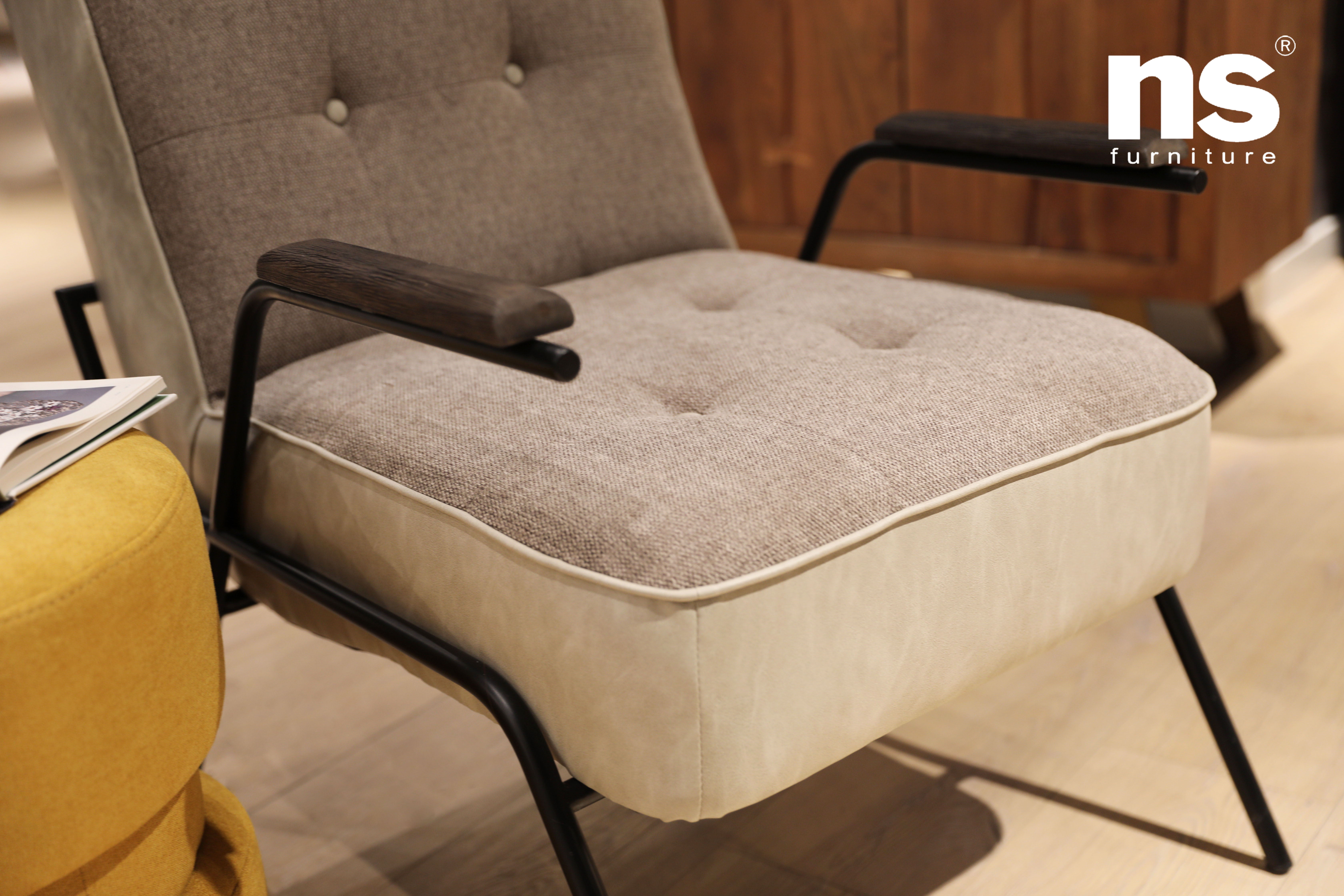 | 品名 | NS家居 nsfurniture软包布艺PU拼接金属扶手椅单人沙发休闲椅 |