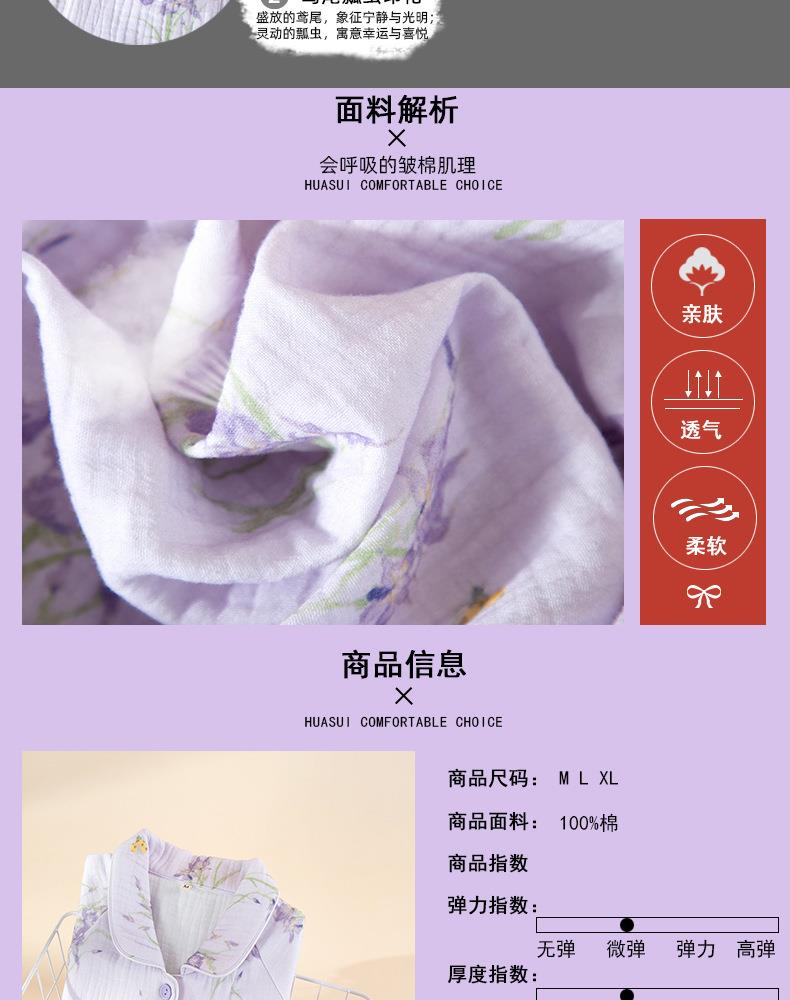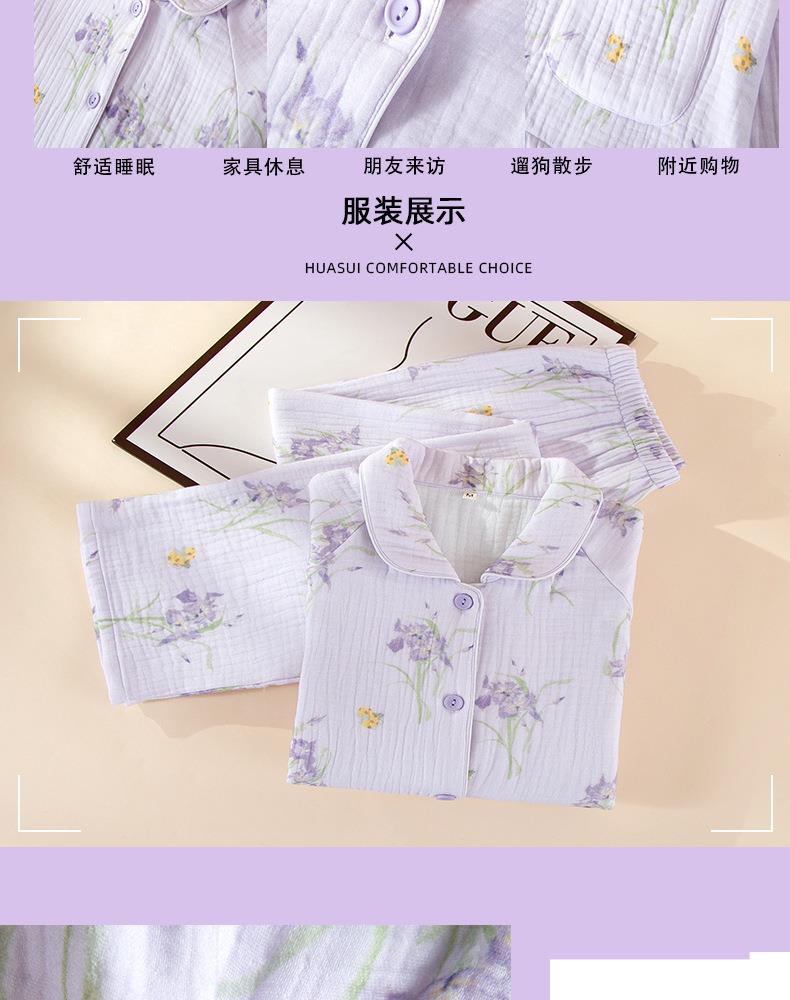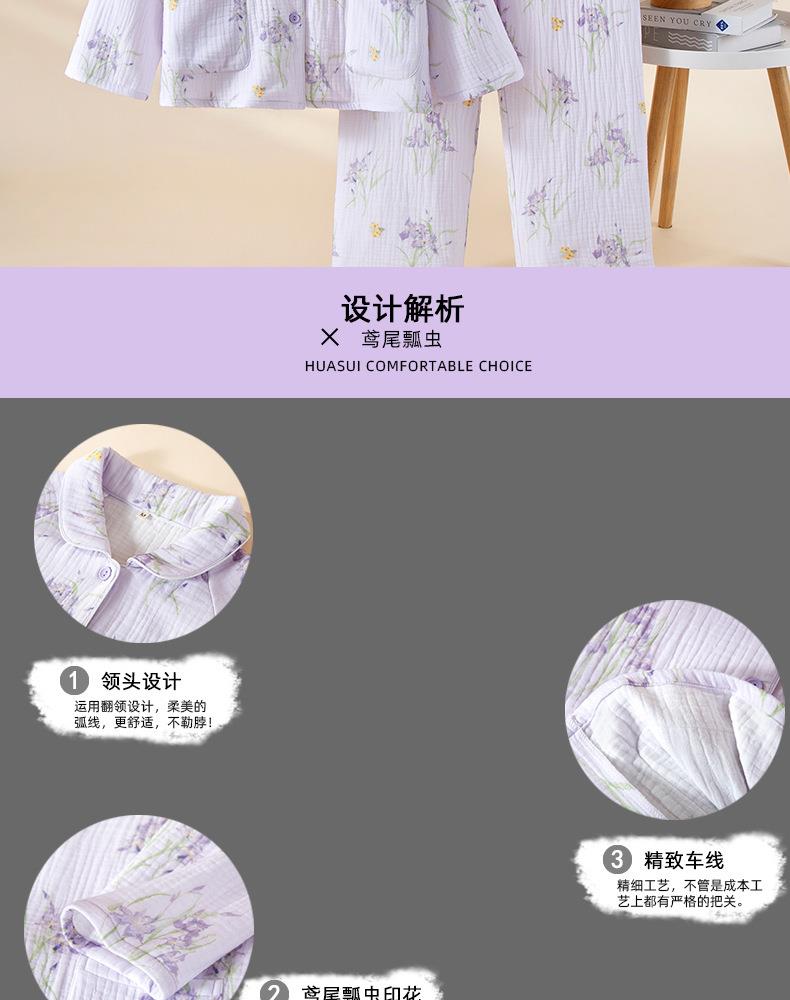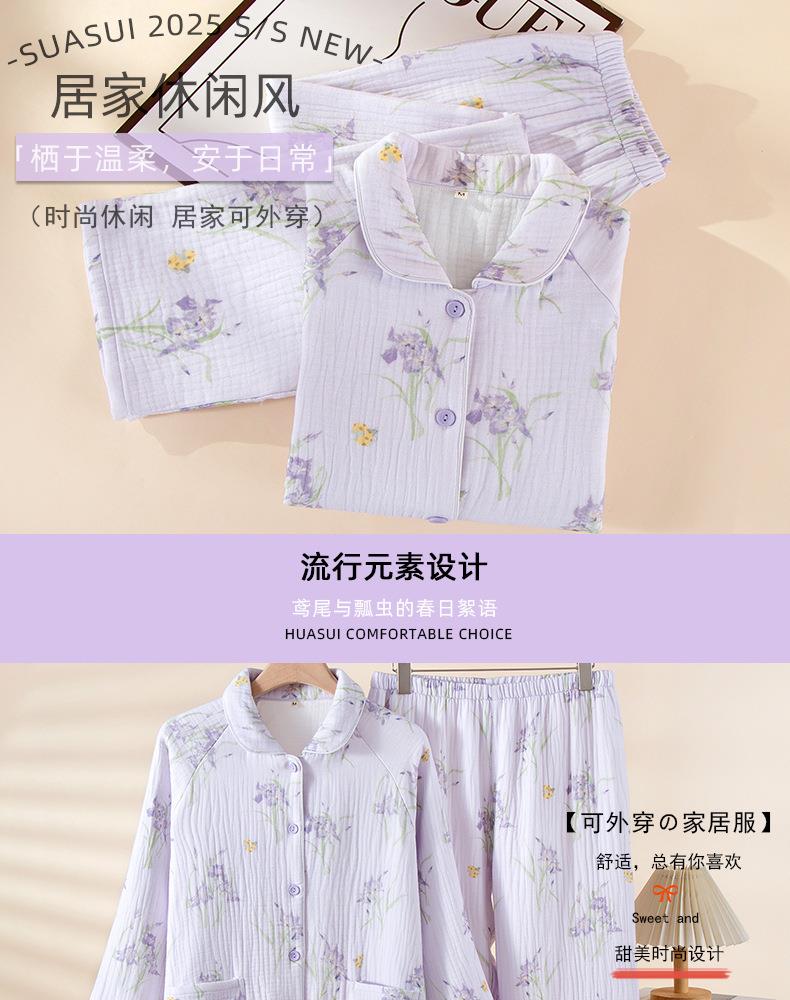 A类纯棉四层皱纱睡衣女春秋冬季鸢尾瓢虫翻领常规家居服套可外穿