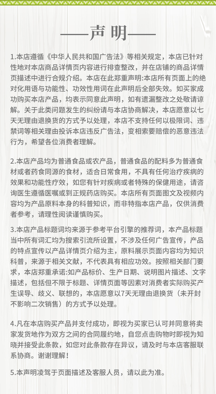 1、本品植物粉制品为特殊食品,食品关系到每个人的健康安全,根据《中华人民共和国消费者权益保护法》及相关规定,食品经营企业必须严格把控食品安全与卫生,食品一经拆封(如撕开密封包装、打开瓶盖等)无法保证食品安全,且不能二次销售,所以开封后的产品恕不接受无理由退换货。请您理性购买!收到包裹后请仔细确认商品信息与包装完整性,谨慎拆封。谢谢配合!