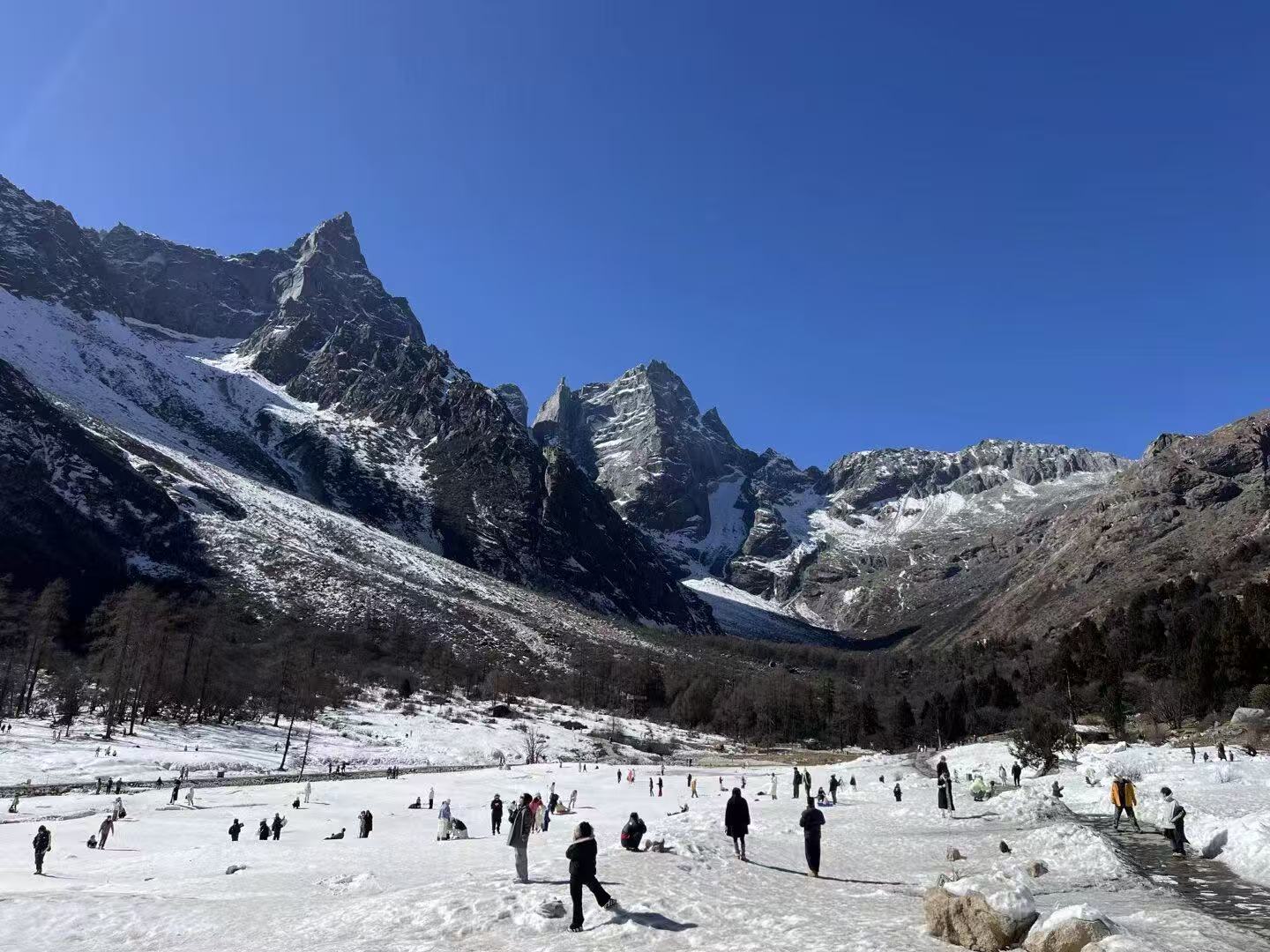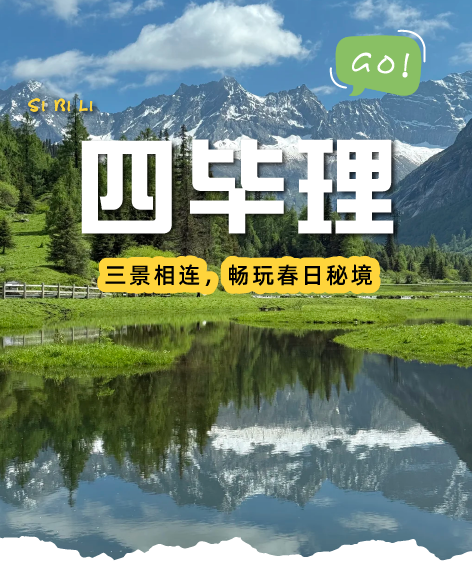 这里依旧矗立着金字塔般的雪山群,终年积雪的山峰在春日暖阳下熠熠生辉,少了几分凛冽,多了一抹温柔。先到达龙王海,冬日薄冰渐渐消融,湖水漾开通透的翡翠色,岸边新生的绿树将影子投在水面,像一幅晕染开的春日水墨画。