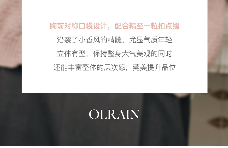 “精致”是欧芮儿olrain品牌文化的核心,欧芮儿认为,精致的女人,不但要外在动人,更要内在迷人,内外兼修,有魅力、有气质、有内涵,自信而不自傲,优雅而不矫揉,自有万种风情而不轻浮,更不故作矜持。