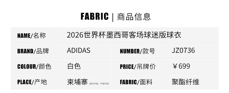 SFS正品 Adidas阿迪达斯2026世界杯墨西哥客场球迷版球衣JZ0736