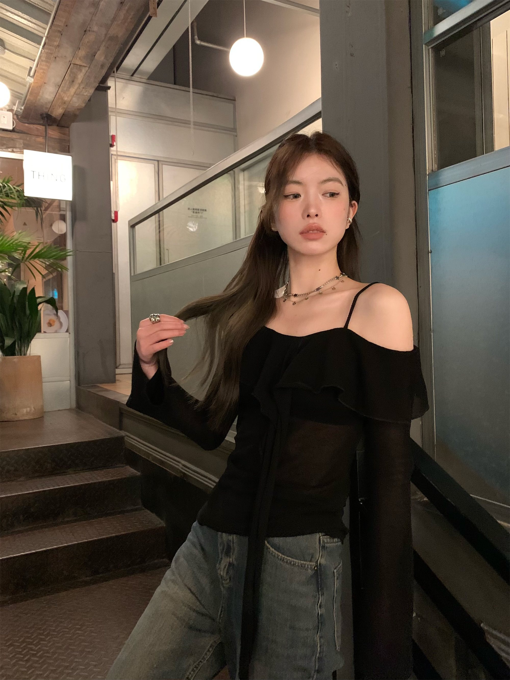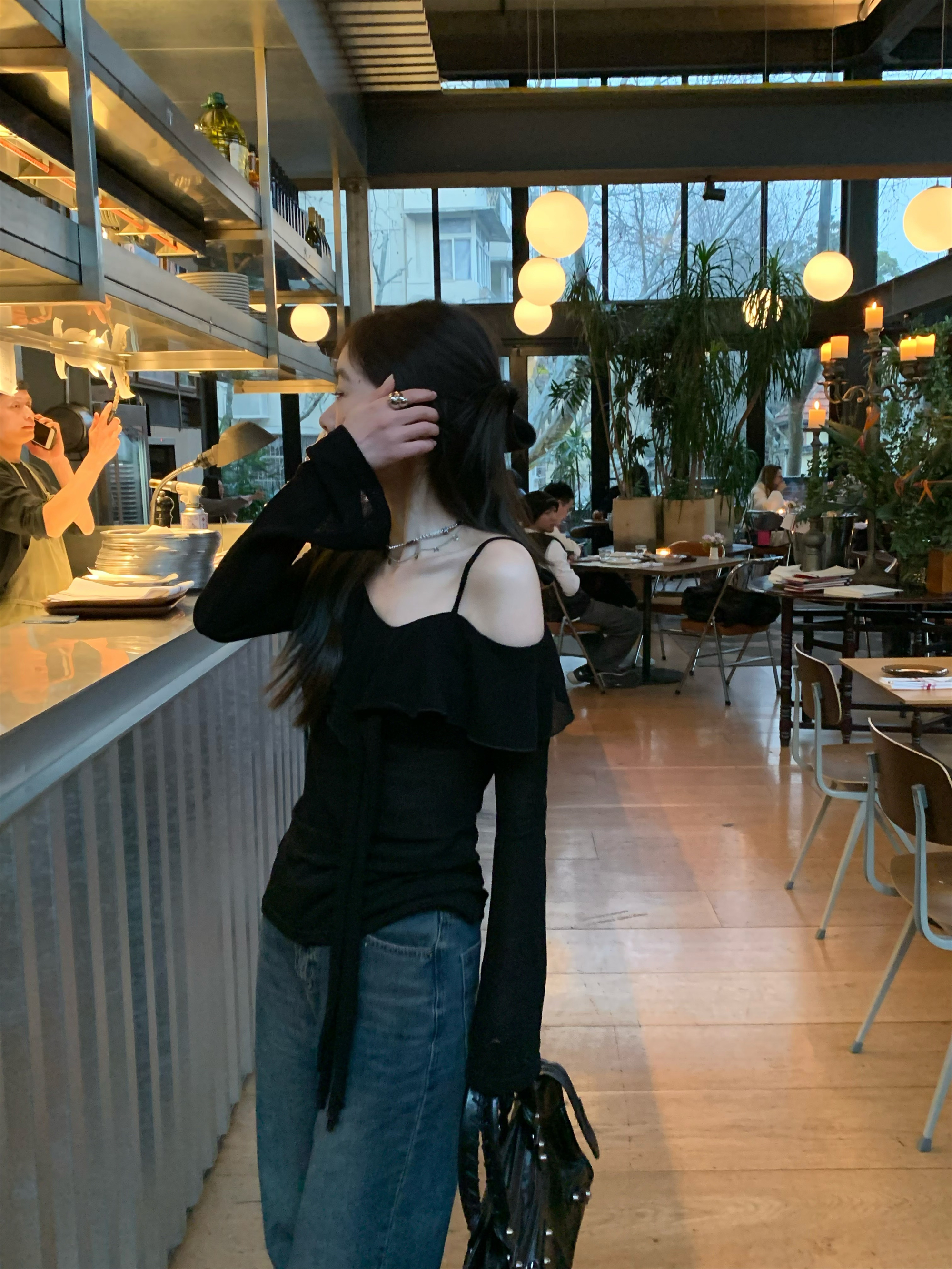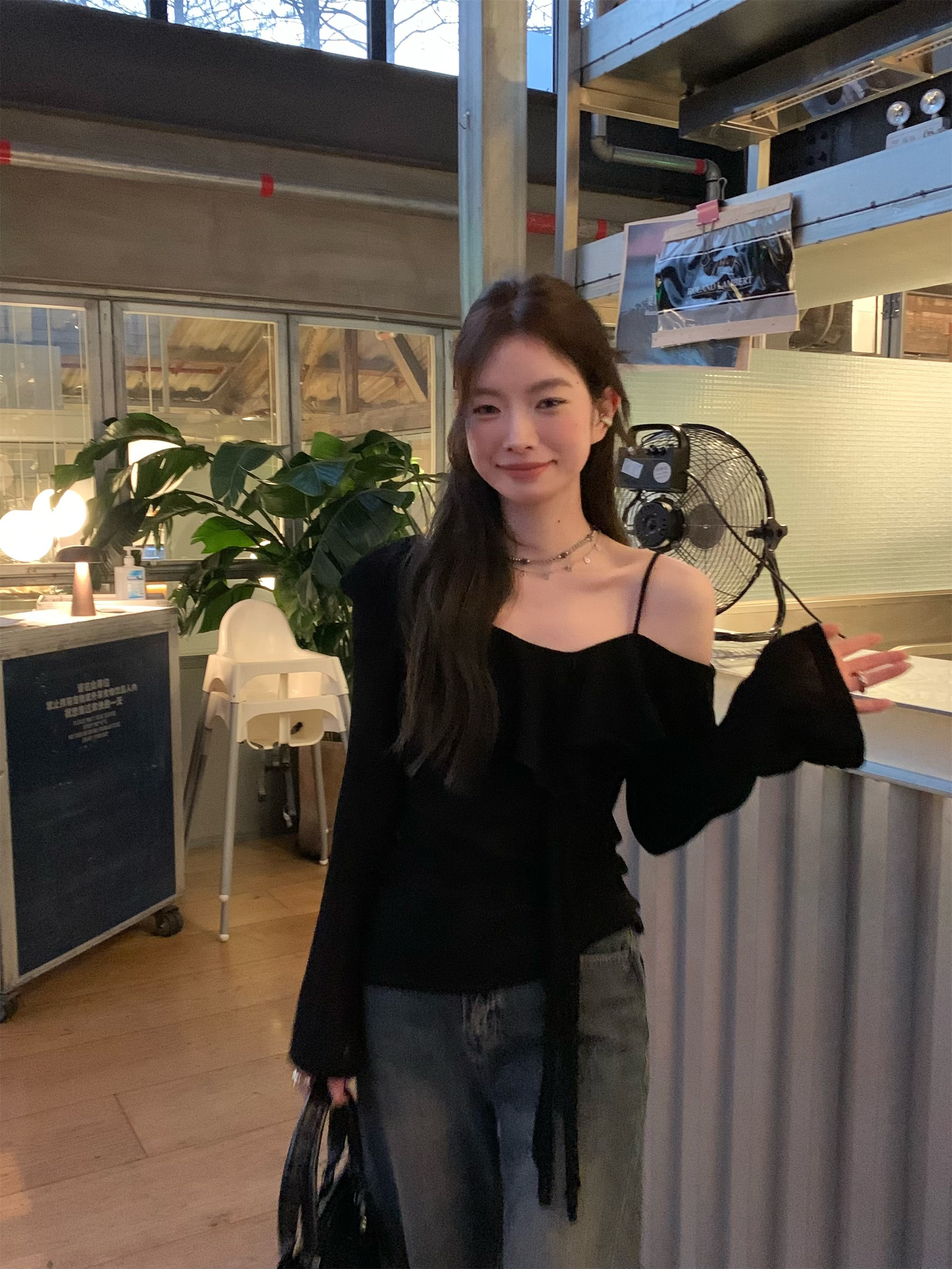 西遇长袖针织衫女春夏新款黑色露肩微喇袖口设计吊带上衣SS150309