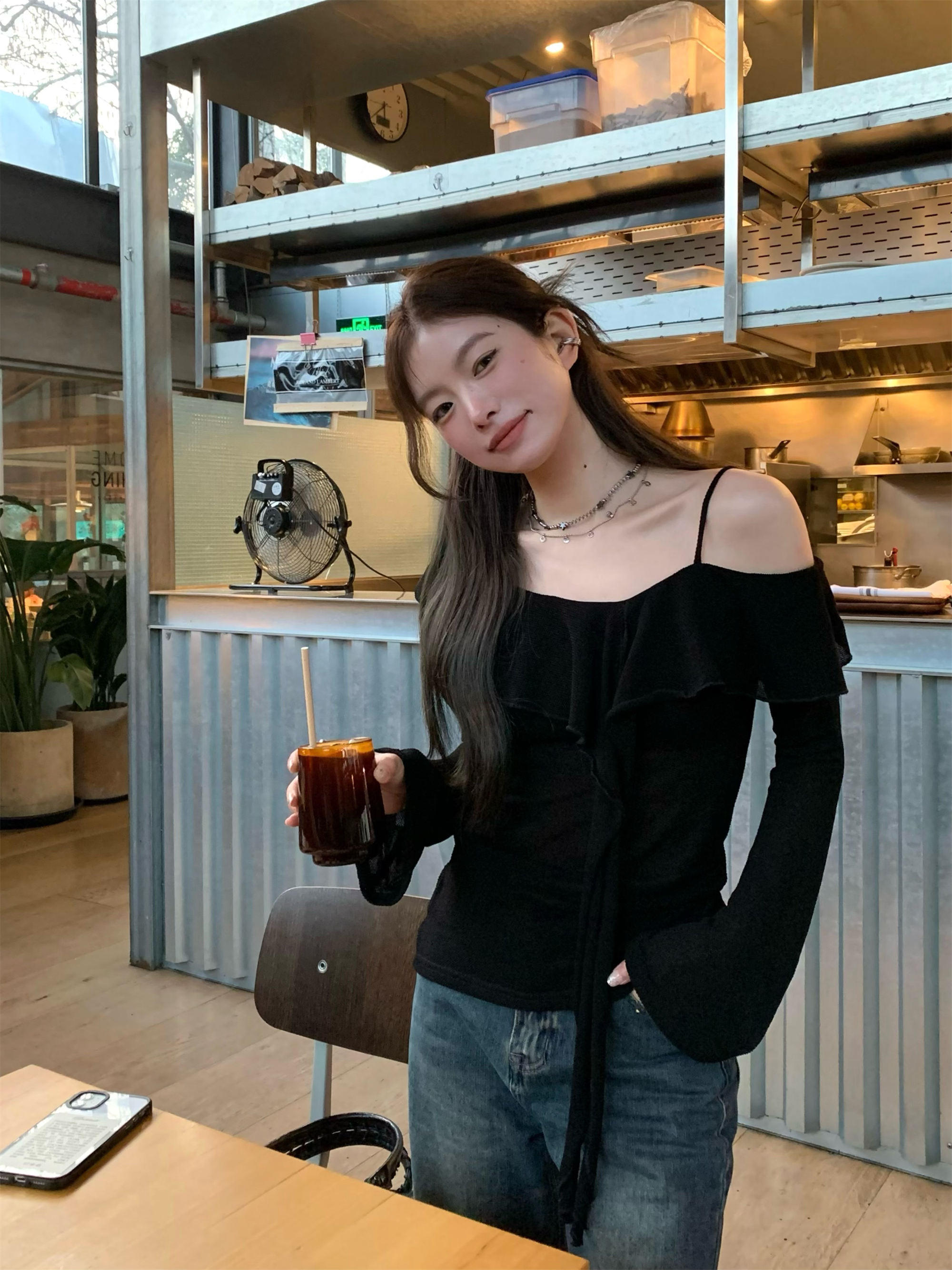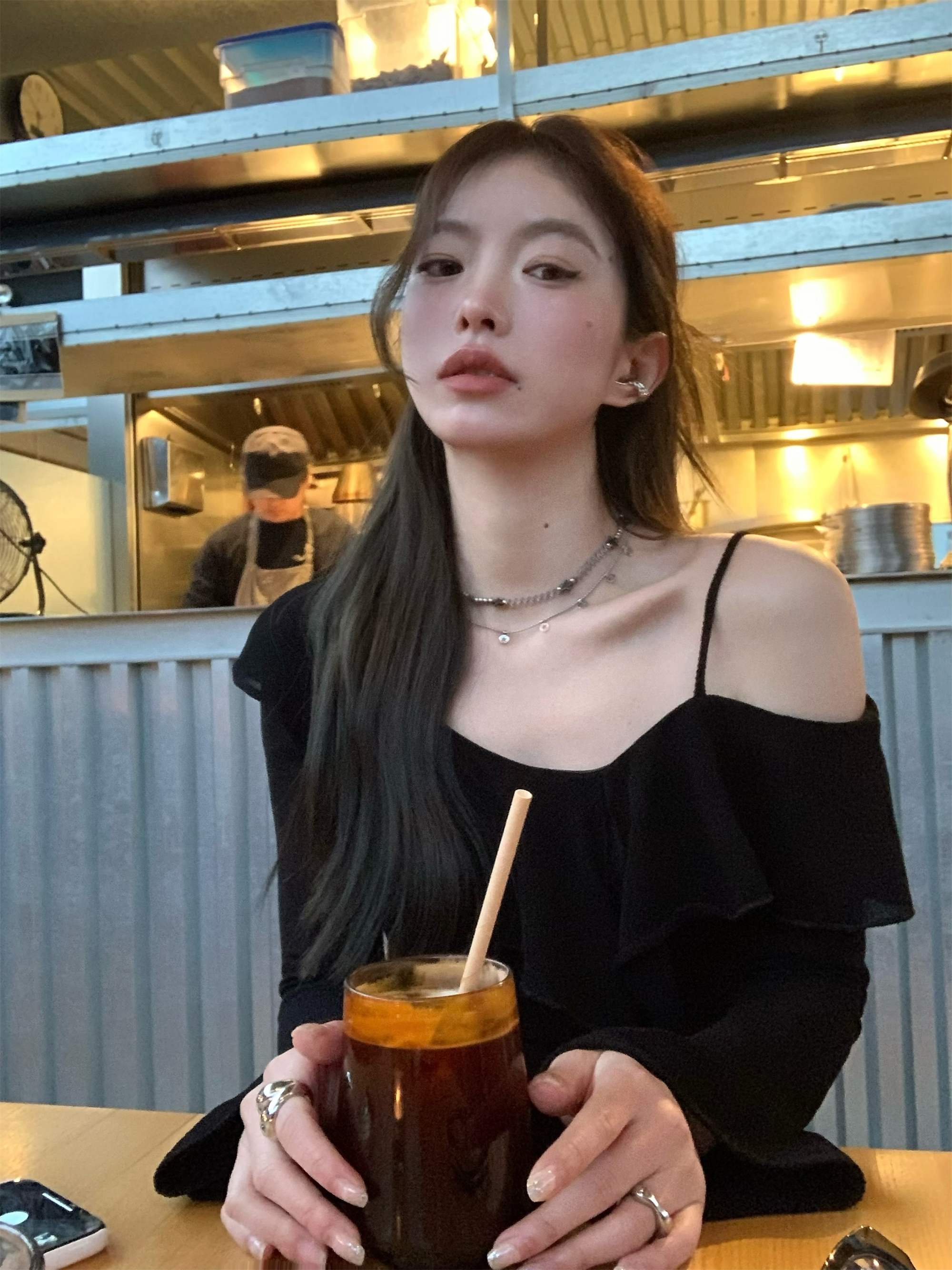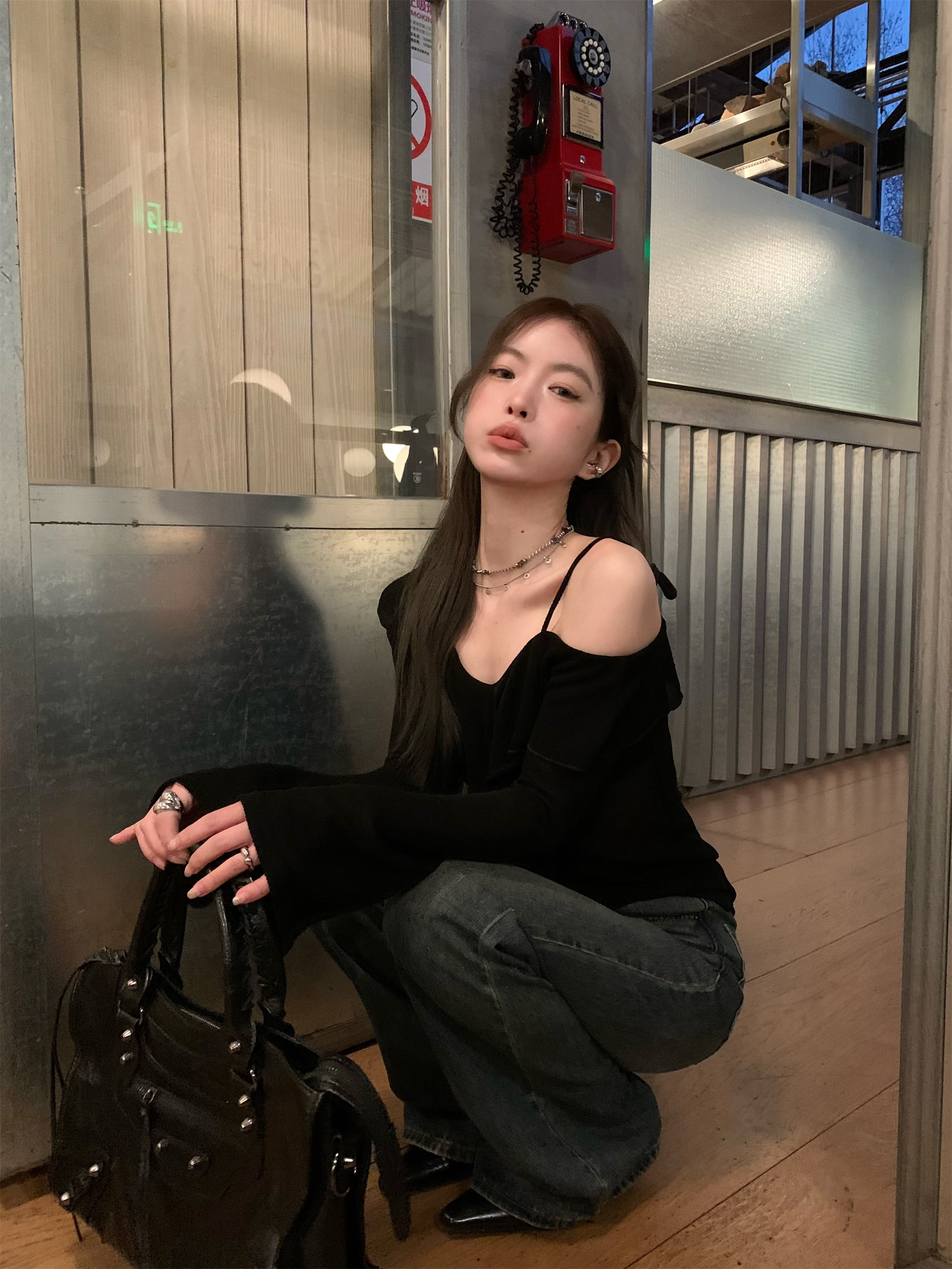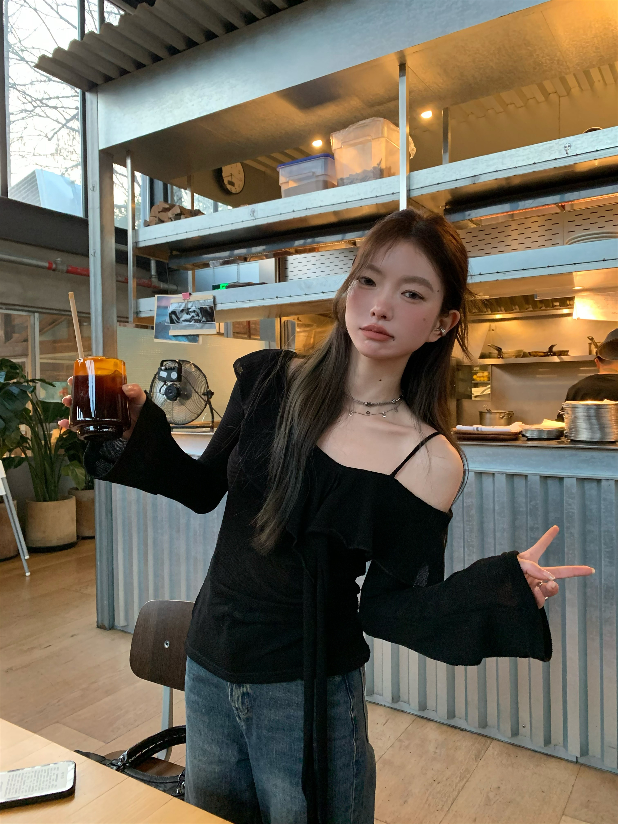 西遇长袖针织衫女春夏新款黑色露肩微喇袖口设计吊带上衣SS150309