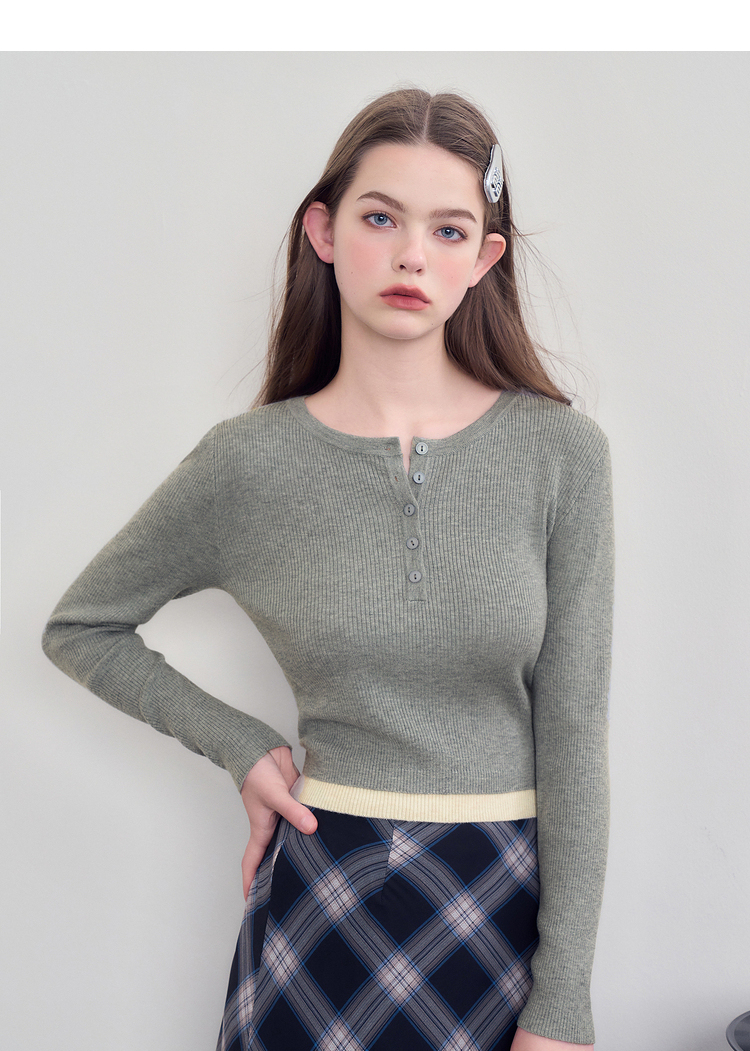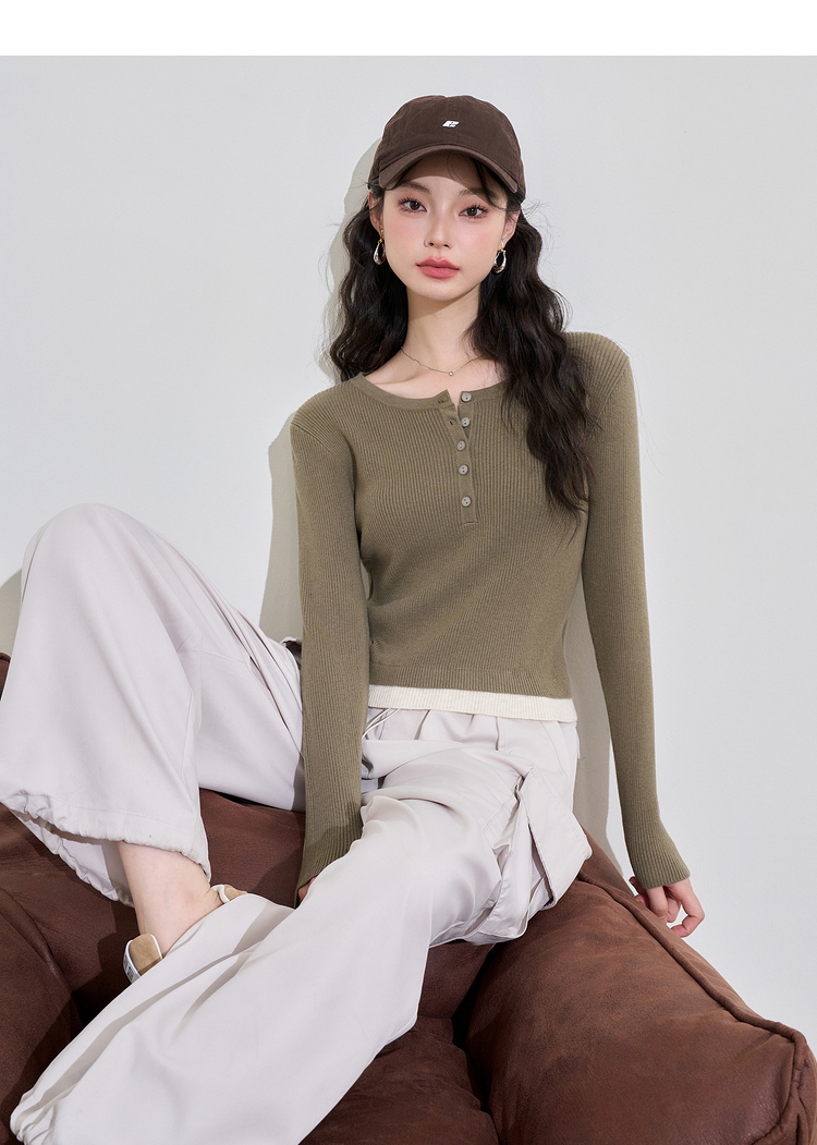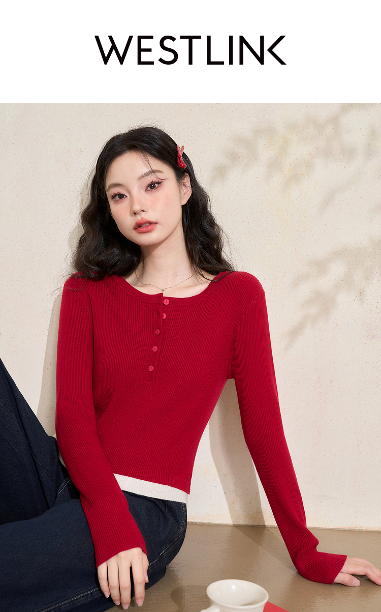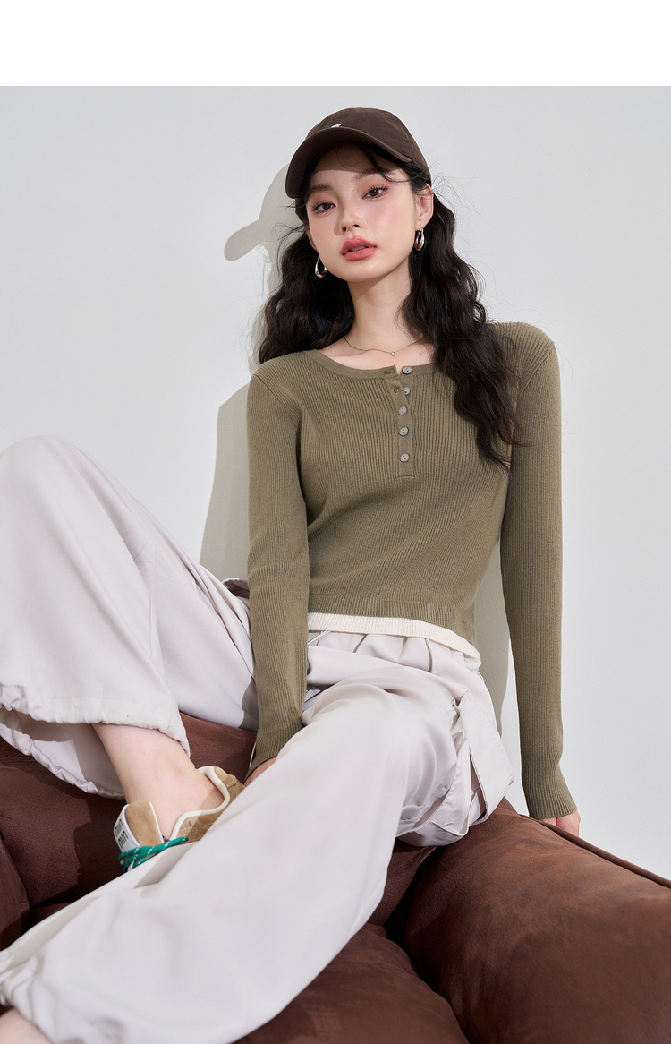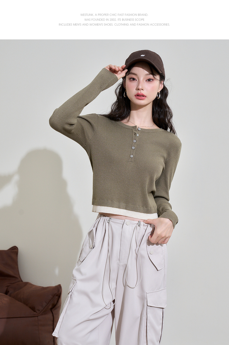 西遇长袖修身针织衫女新款薄款显瘦假两件短款上衣D3342260