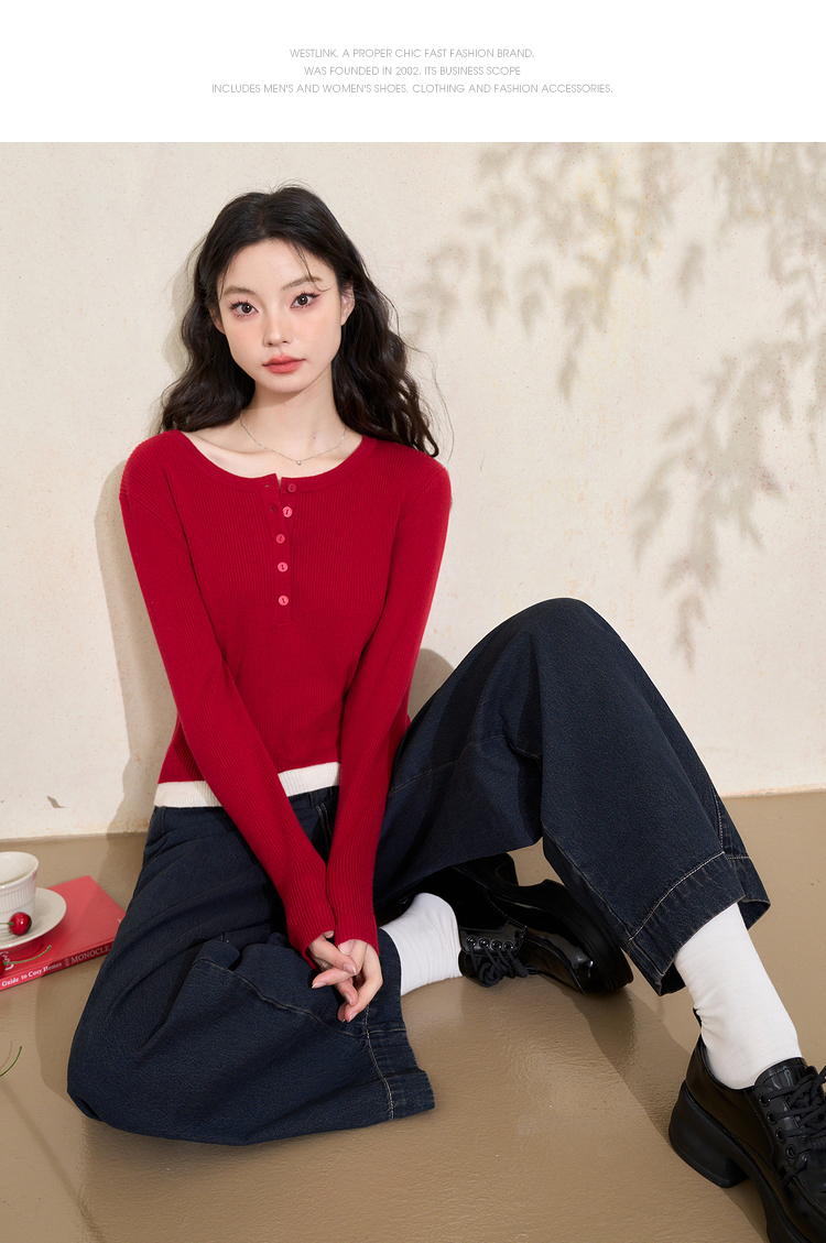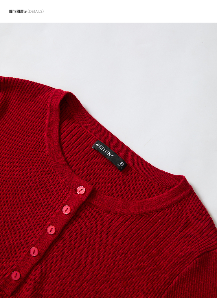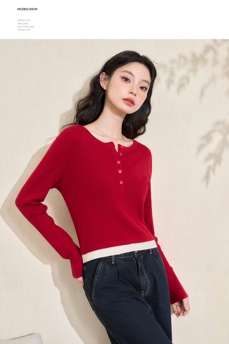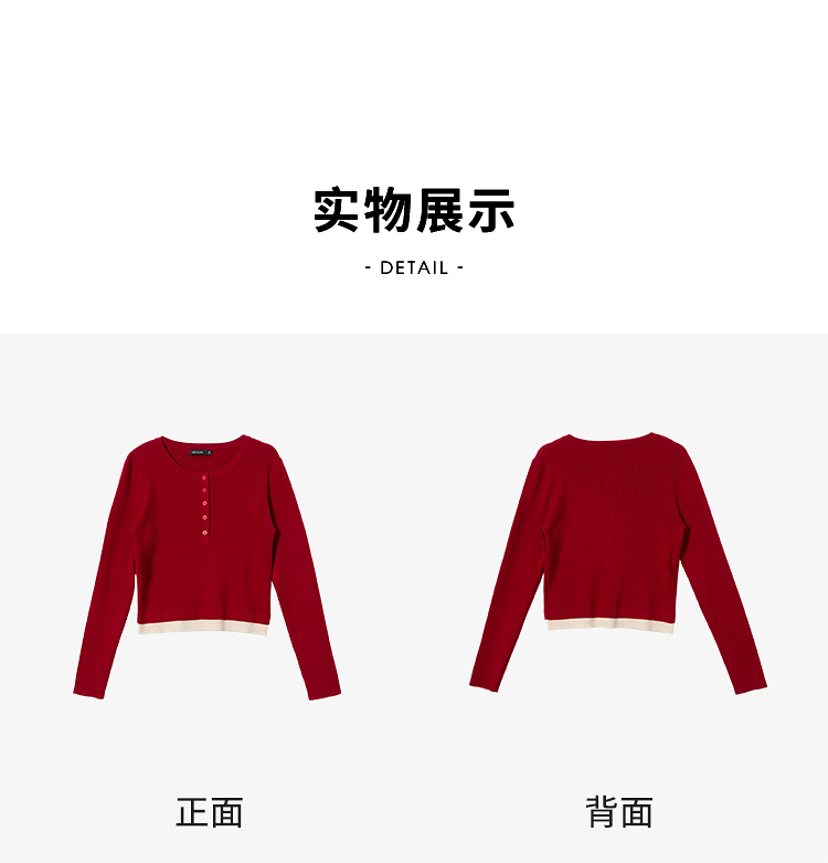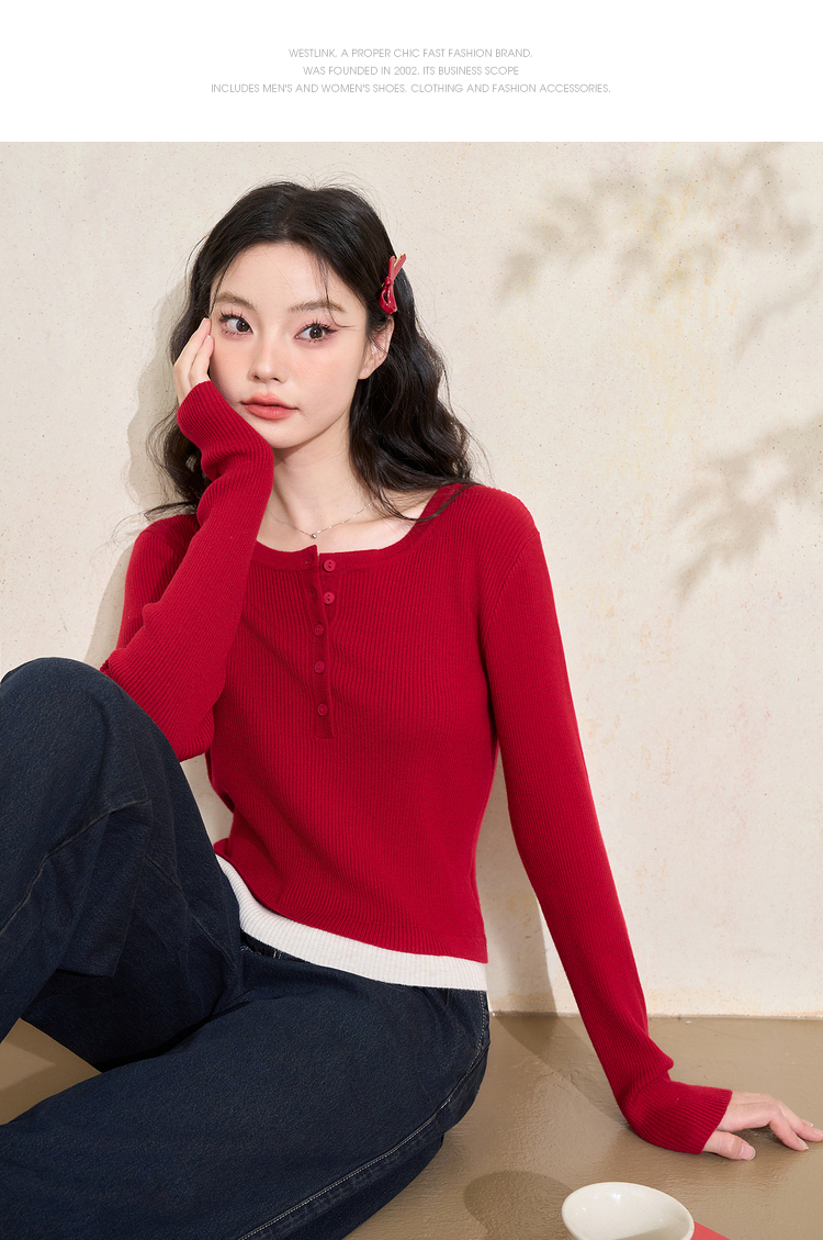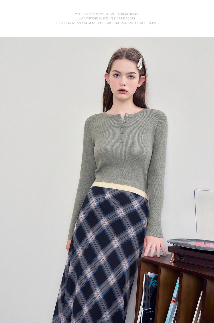 西遇长袖修身针织衫女新款薄款显瘦假两件短款上衣D3342260