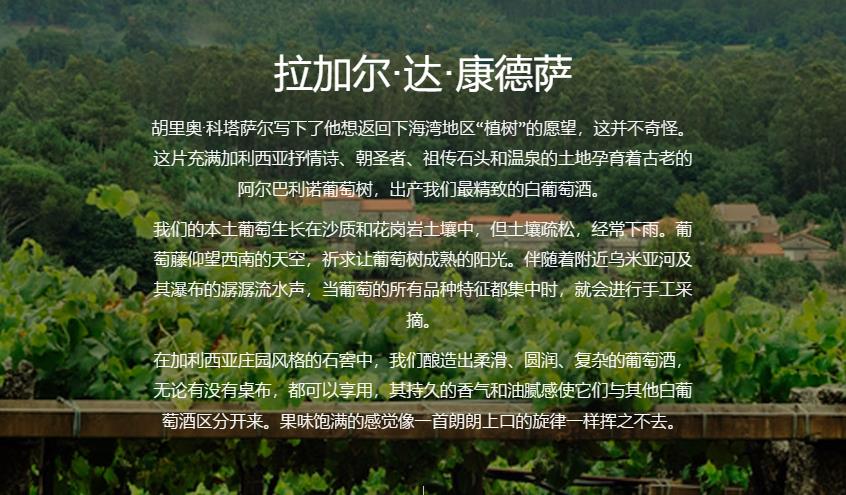 拉加尔·达·康德萨 Lagar da Condesa 由 Gil 家族于 2013 年创立。位于 Rías Baixas 的 Val do Salnés 地区,是该地区最凉爽、最潮湿的地区,拥有最长的大西洋海岸线,也是阿尔巴里尼奥 (Albariño) 的诞生地。土壤以花岗岩为主;河流和支流留下了粘土、淤泥、沙子和砾石的冲积沉积物;矿物质含量也很高——这些都是阿尔巴利诺的理想条件。该地区被称为“绿色西班牙”,全年气温适中,海洋薄雾缭绕,降雨量是该国其他地区平均降雨量的三倍。2,200 小时的日照平衡确保阿尔巴利诺充分成熟,具有良好的天然酸度和芳香特征。该酒庄是一个传统的“Pazo”,周围环绕着葡萄园,所有葡萄园都安装在离地面约 5 英尺的凉棚(或“parral”)上,以确保充足的通风以应对潮湿的气候。收获是在 15 公斤(33 磅)的篮子中手工完成的。
