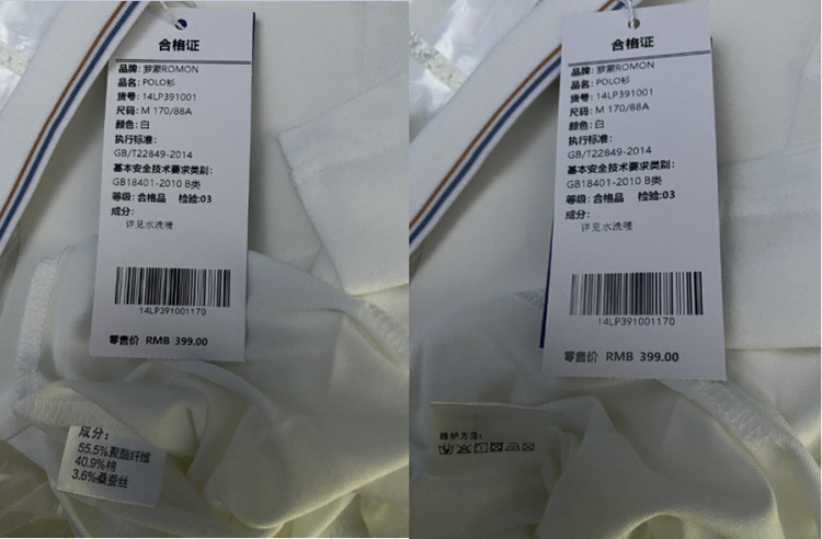 面料:55.5%聚酯纤维 40.9%棉 3.6%桑蚕丝
