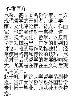作者简介:尼采,德国著名哲学家,西方现代哲学的开创者,语言学家、文化评论家、诗人、作曲家,他的著作对于宗教、道德、现代文化、哲学、以及科学等领域提出了广泛 的批判和讨论。他的写作风格独特,经常使用格言和悖论的技巧。尼采对于后代哲学的发展影响极大,尤其是在存在主义与后现代主义上。