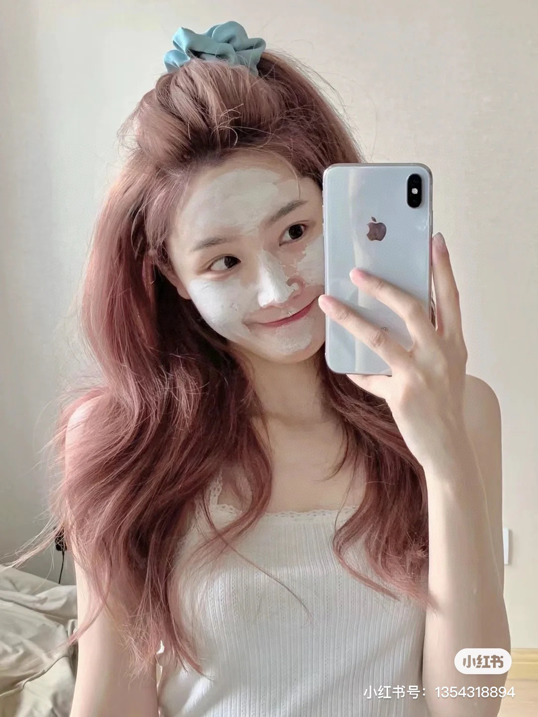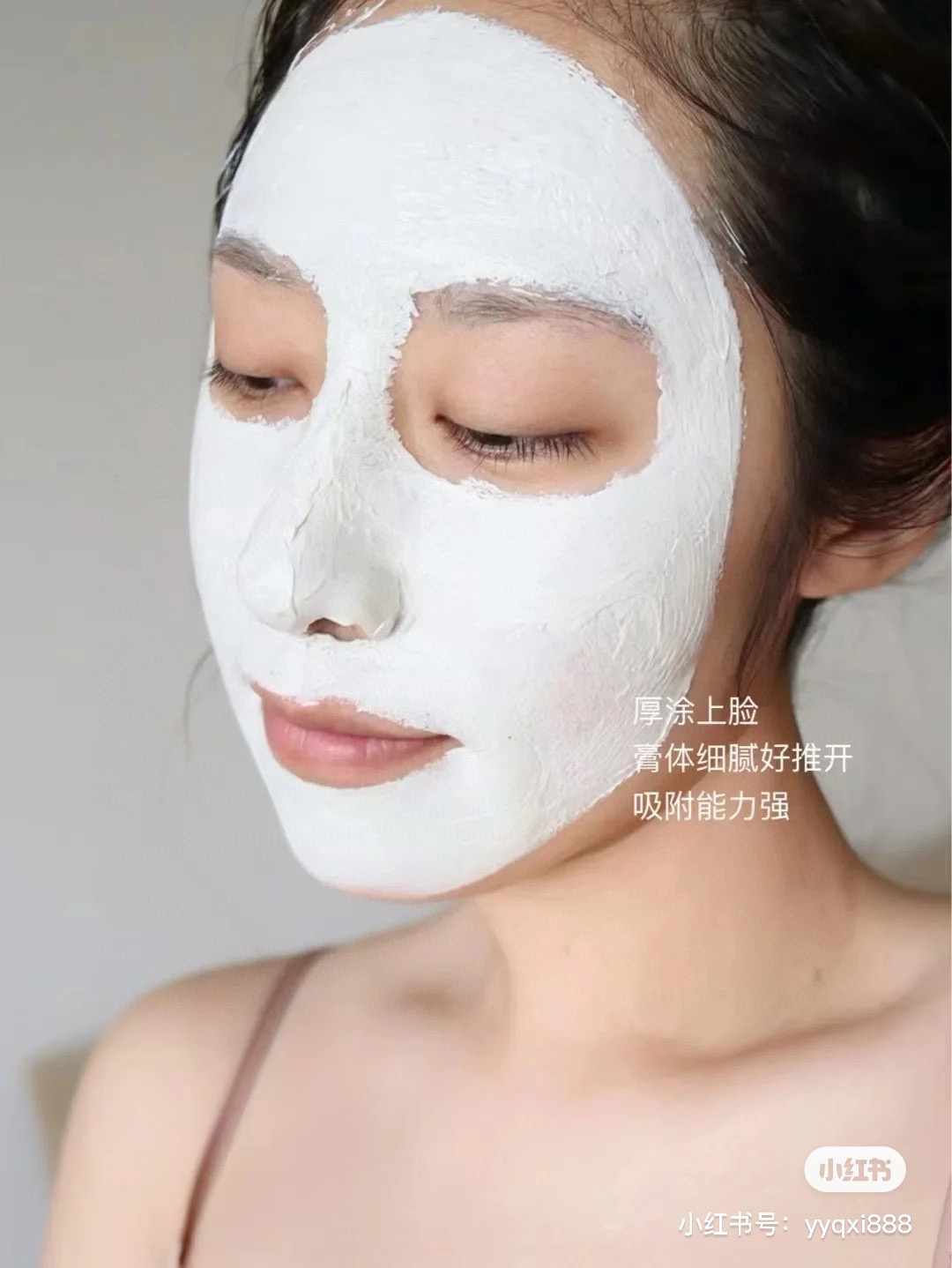 接着再把白泥厚敷在脸上,油皮可以敷全脸,干皮就只需要用在T区。大家记得厚度要遮得住肤色和毛孔,千万不要薄涂,不然容易拔干,清洁效果也会大打折扣。