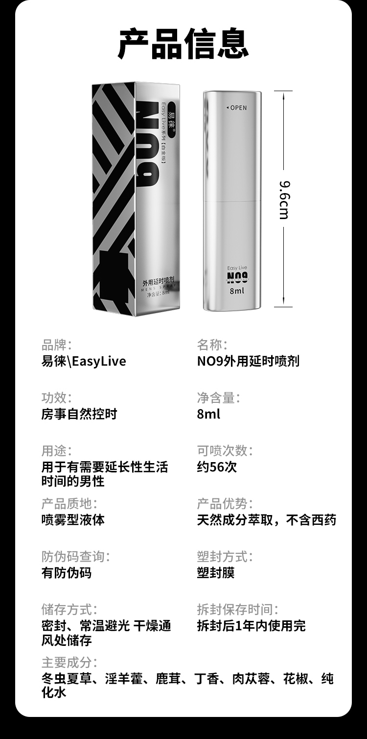 【S-森泽佳奈力荐】EasyLive×易徕 NO9外用延时喷剂 白金版 8ML(极速私密发货)