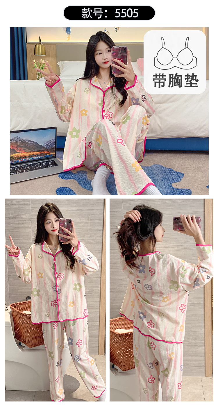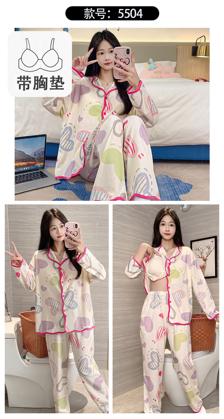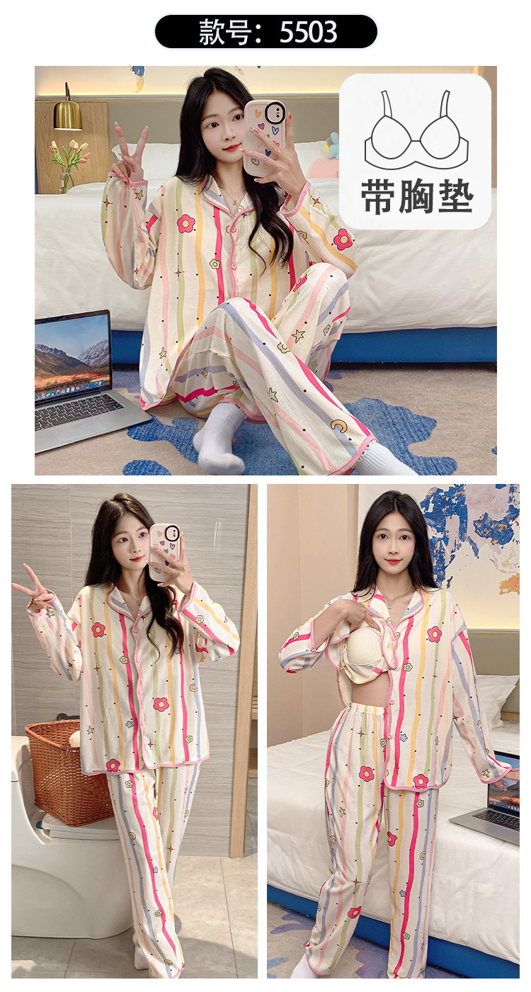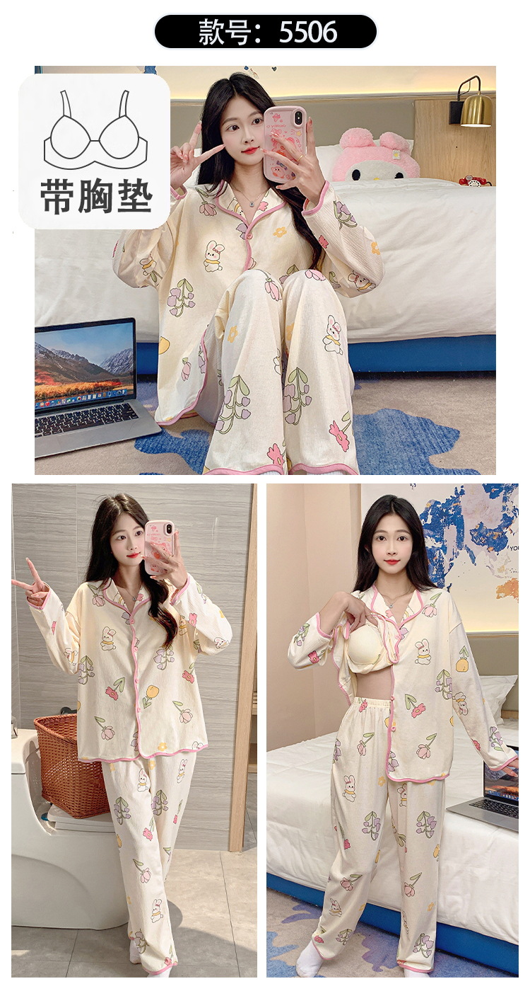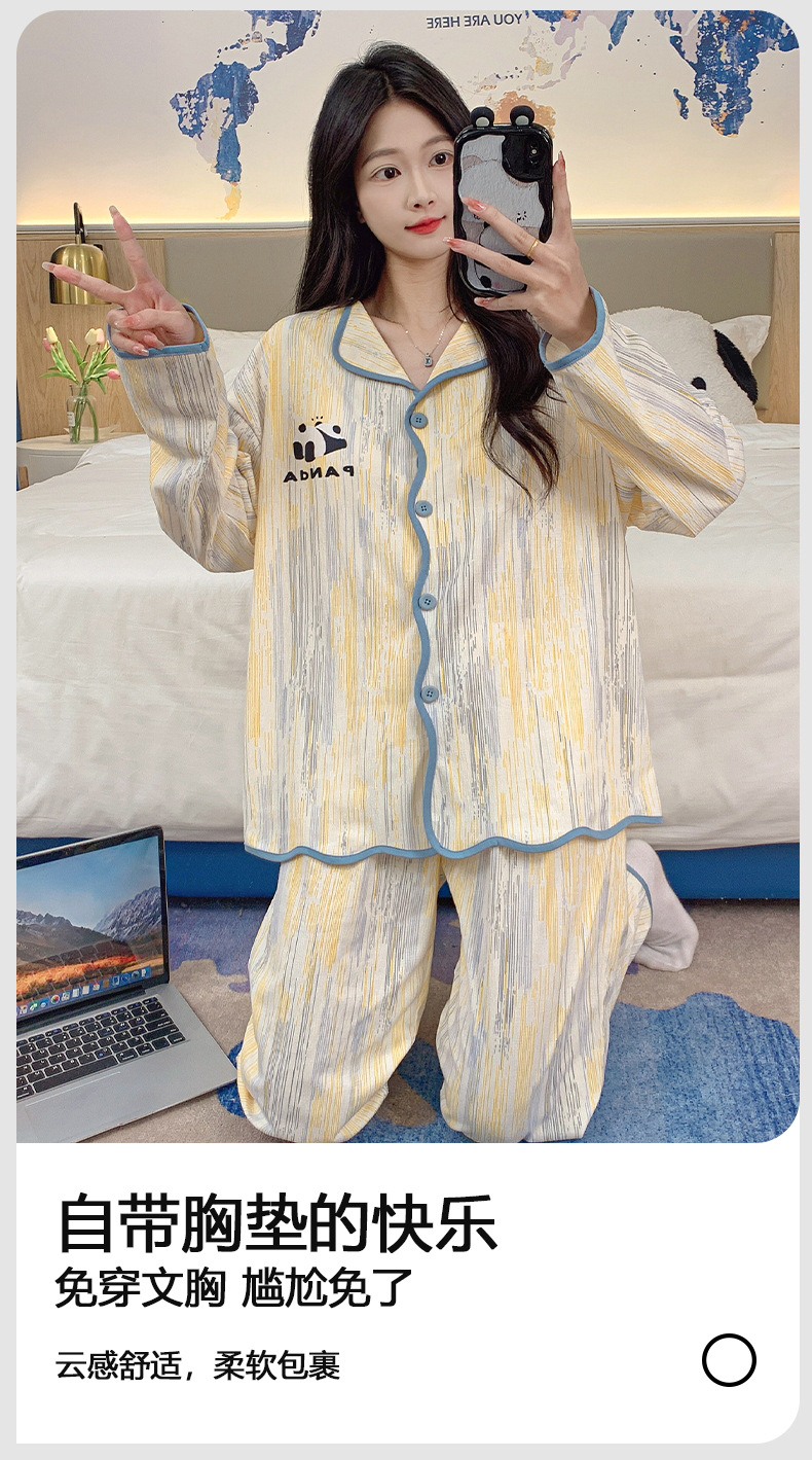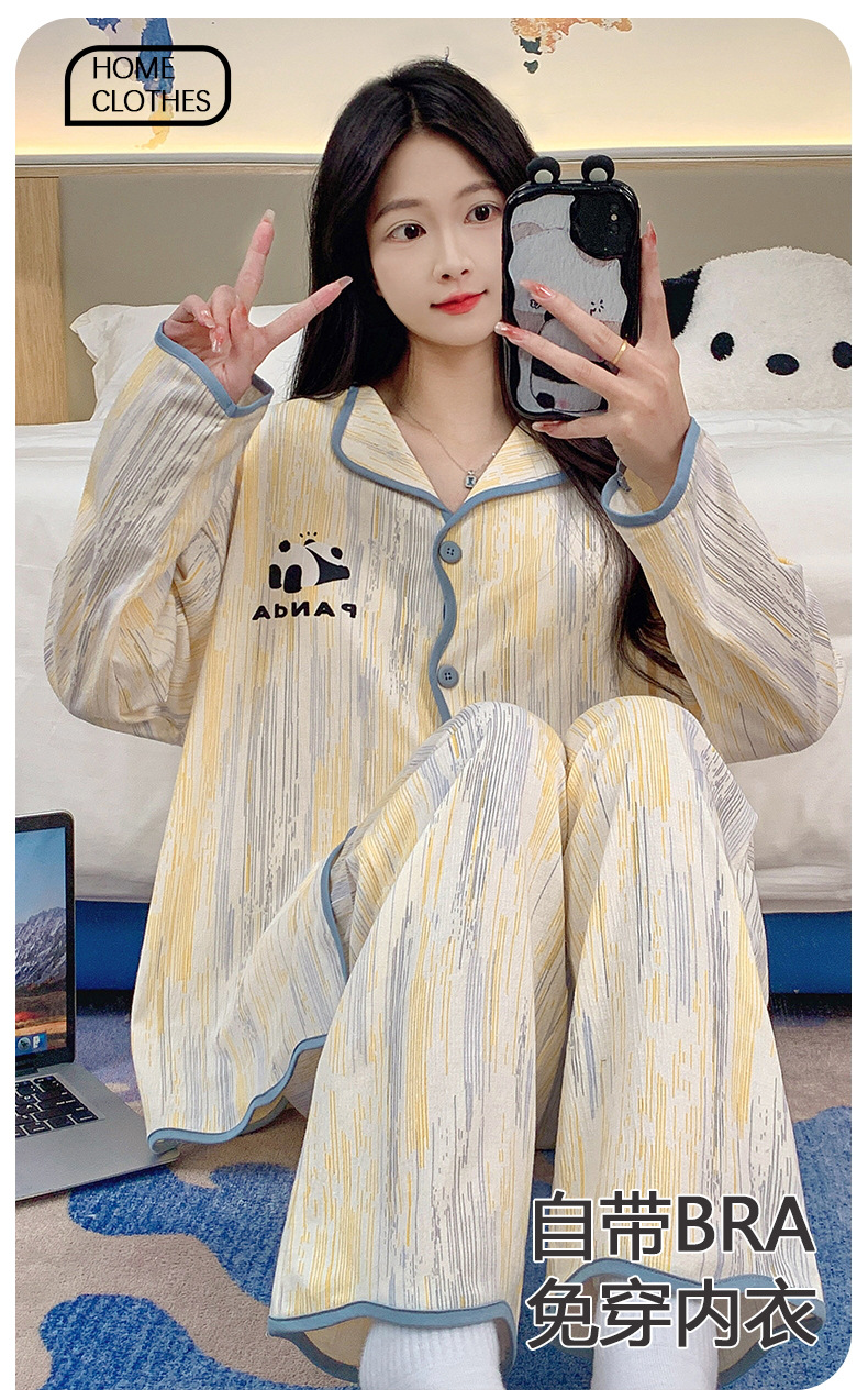 新款秋季家居服翻领长袖睡衣女秋季卡通可爱棉质带胸垫家居服可外穿春冬套装