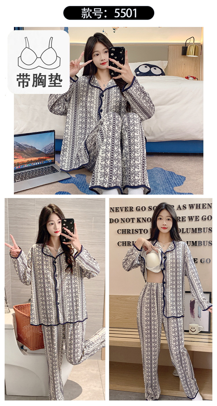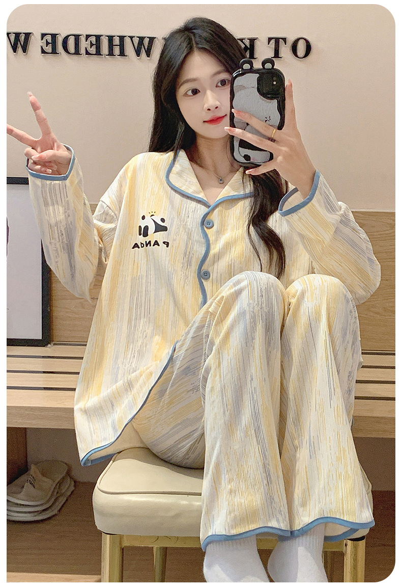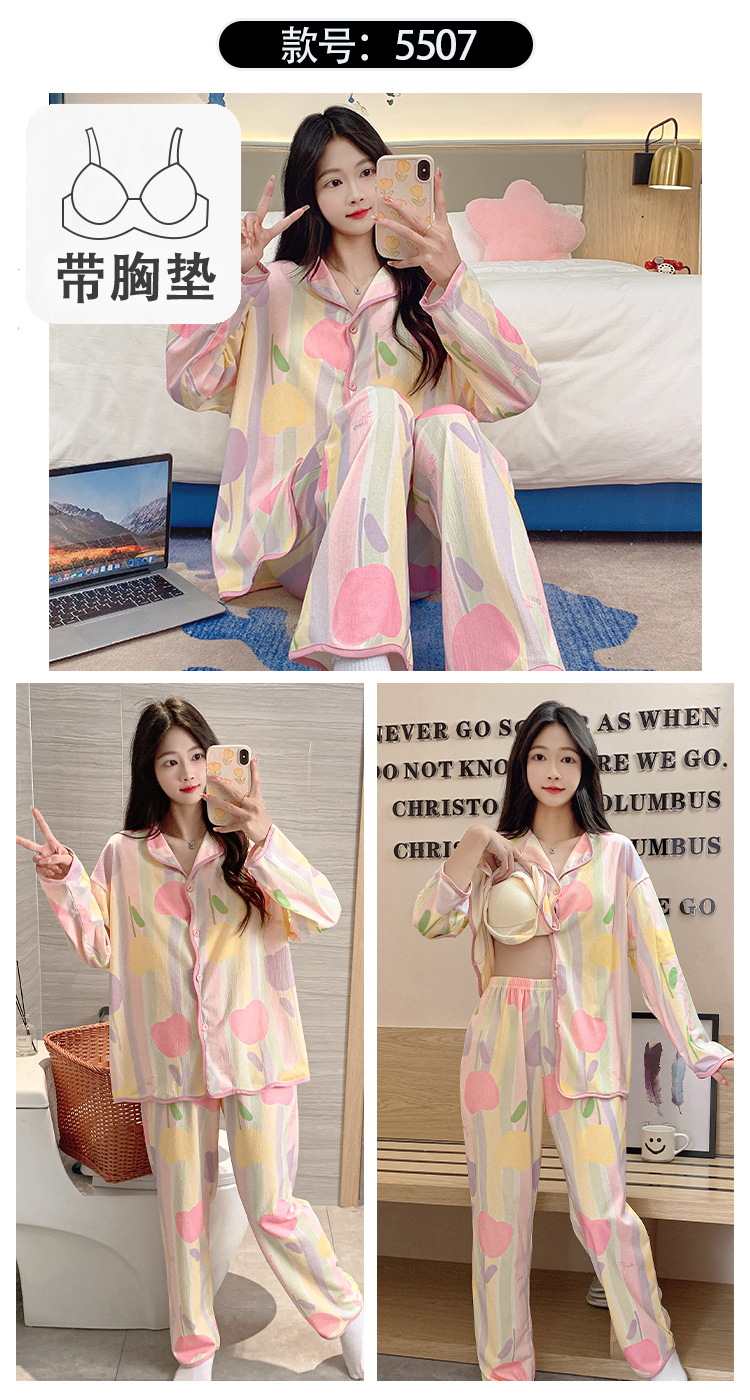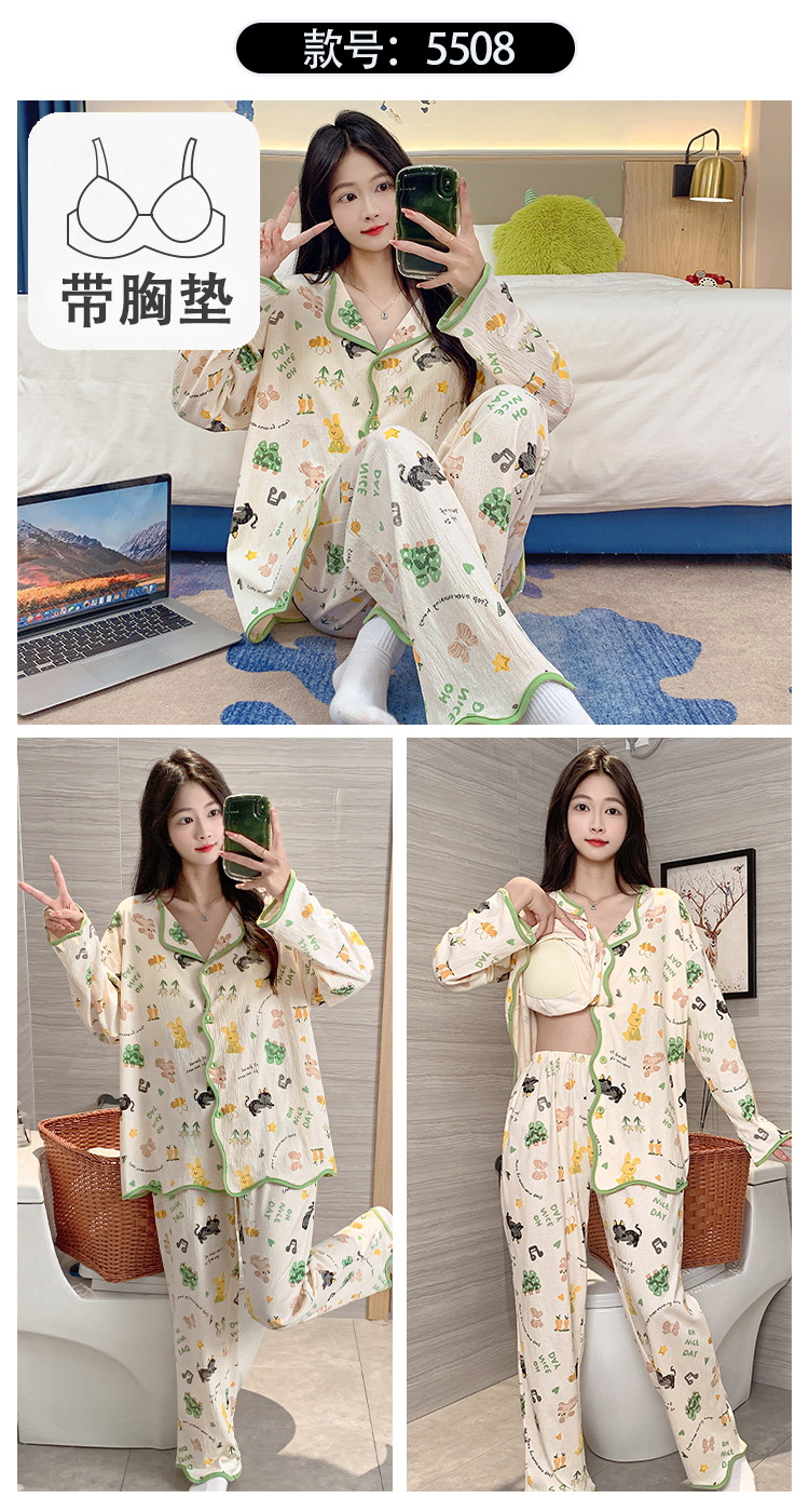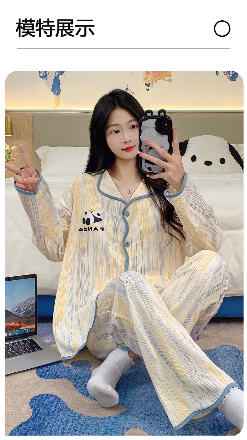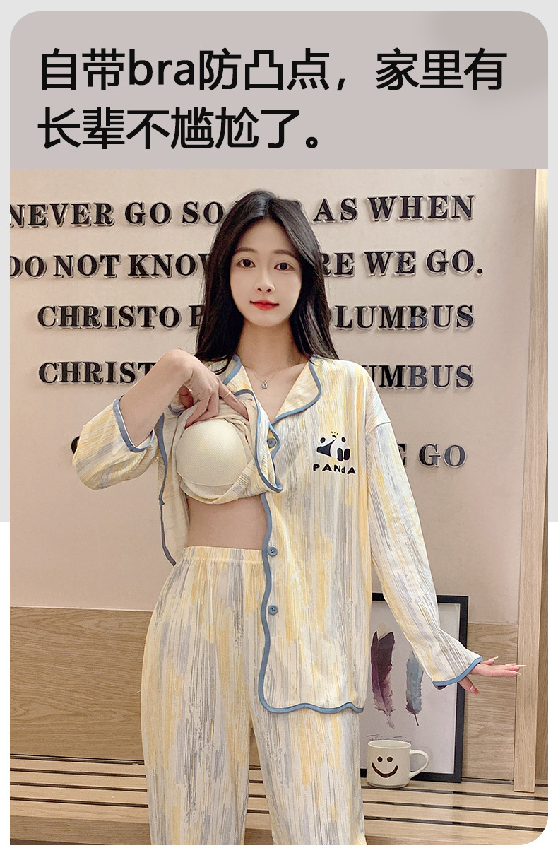新款秋季家居服翻领长袖睡衣女秋季卡通可爱棉质带胸垫家居服可外穿春冬套装