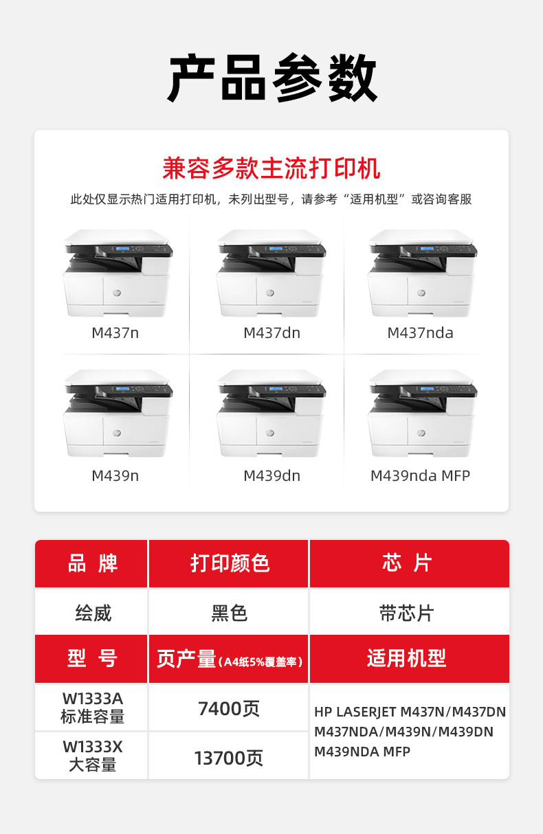 绘威臻享版 W1333X粉盒 黑色带芯片 适用惠普/HP M437n M437dn M437nda M439n M439dn M439nda MFP Prntr