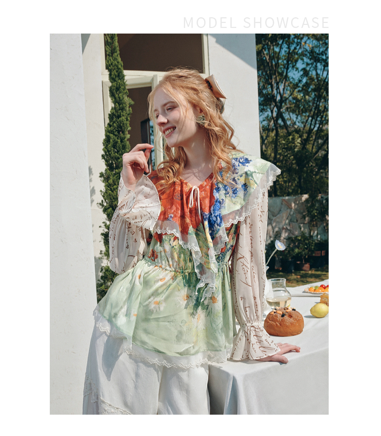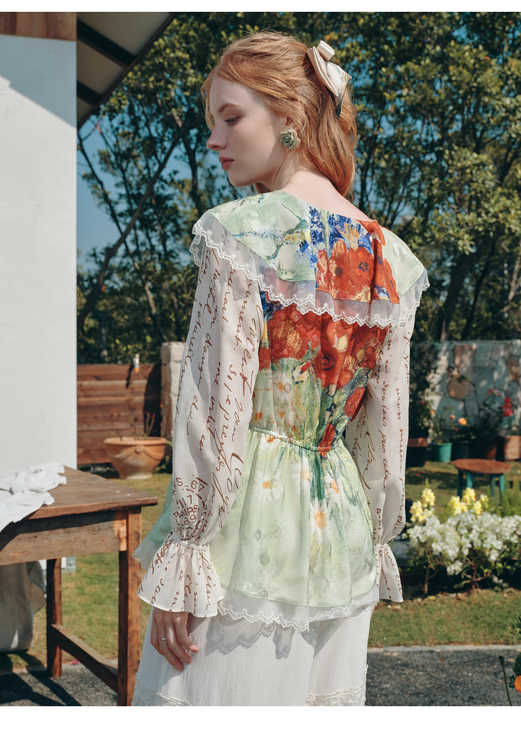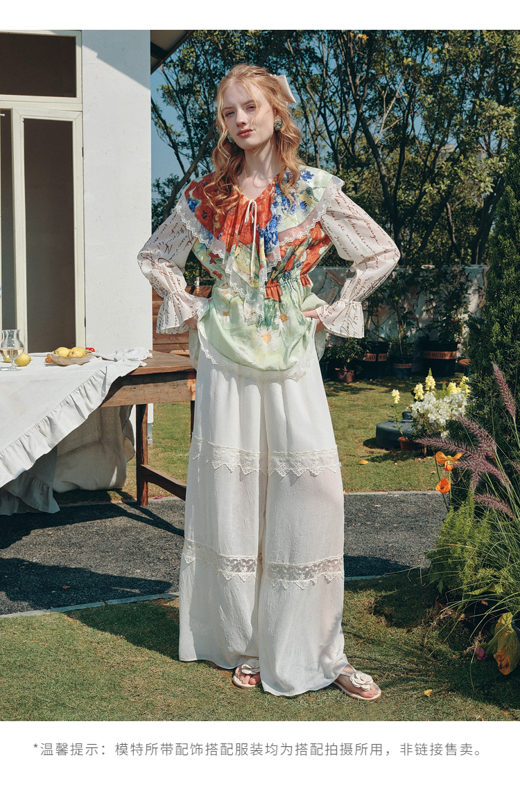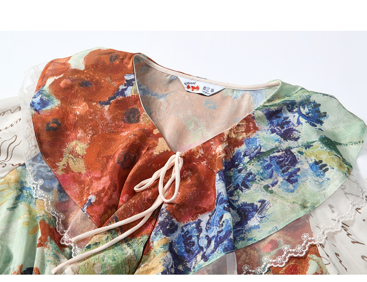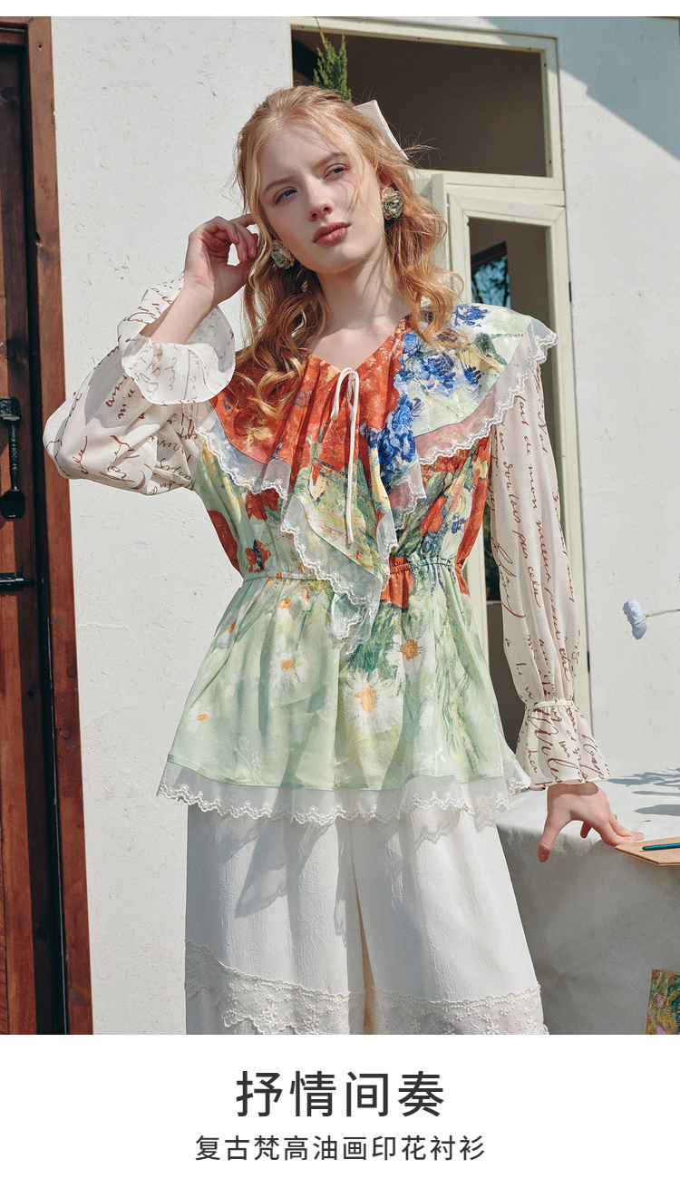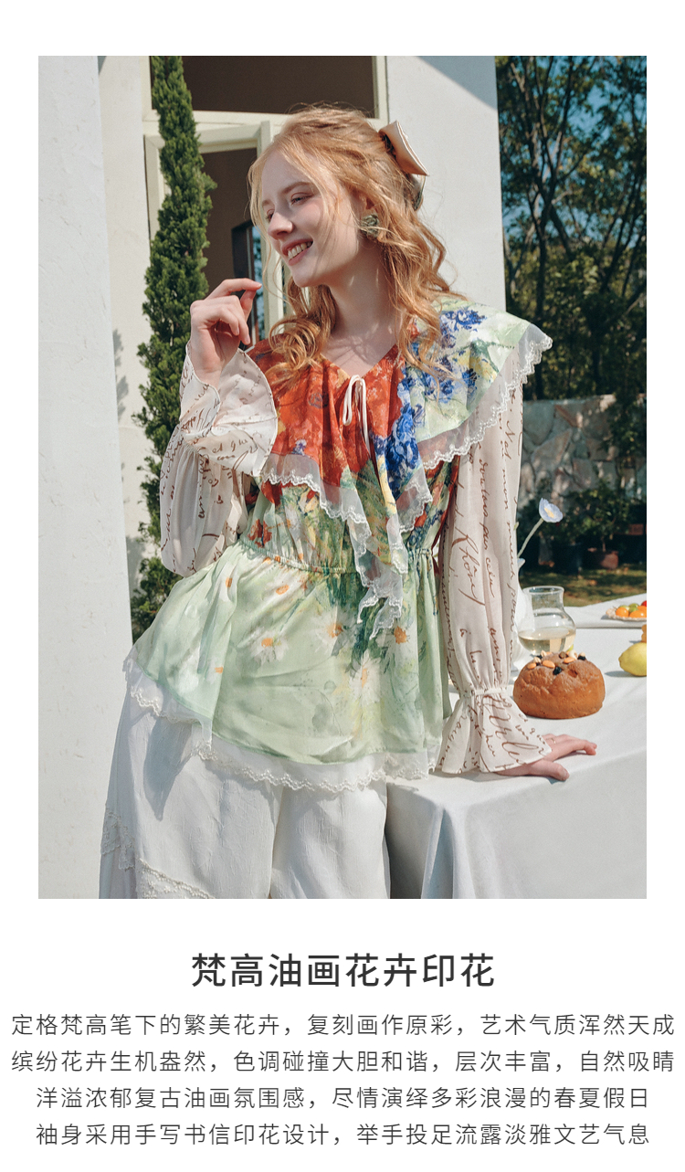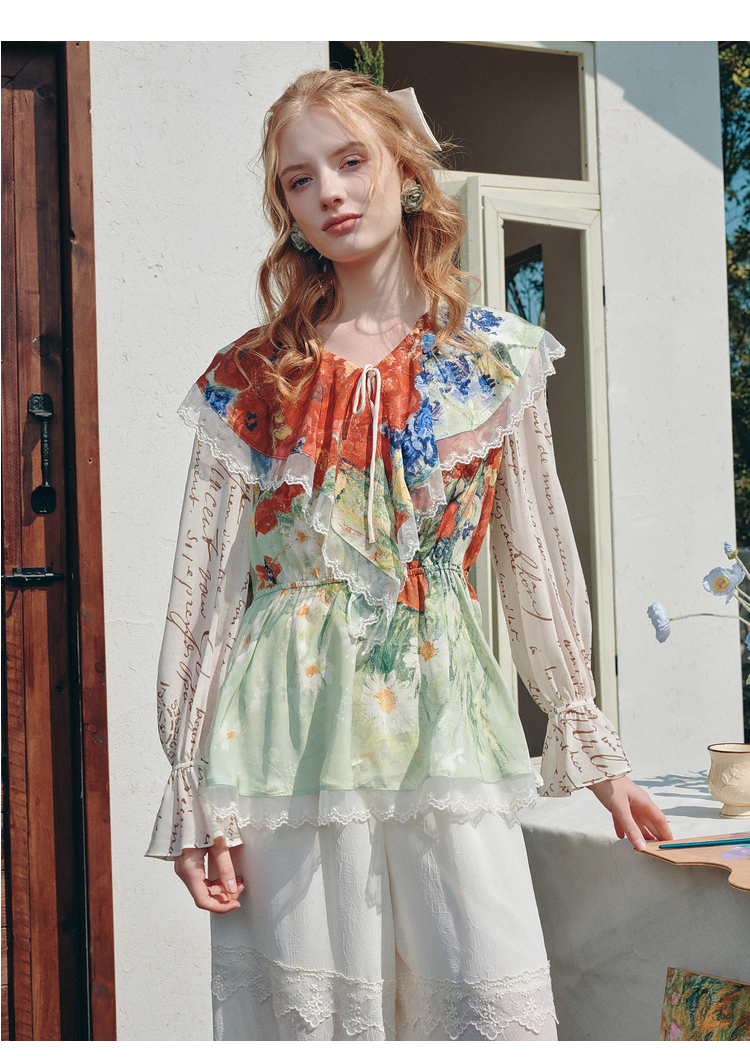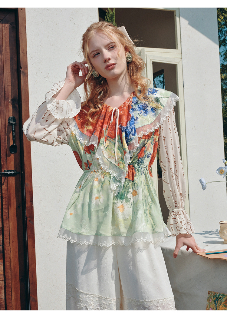 两三事梵高文艺抒情间奏2026夏季新款蕾丝拼接荷叶边领印花雪纺衫