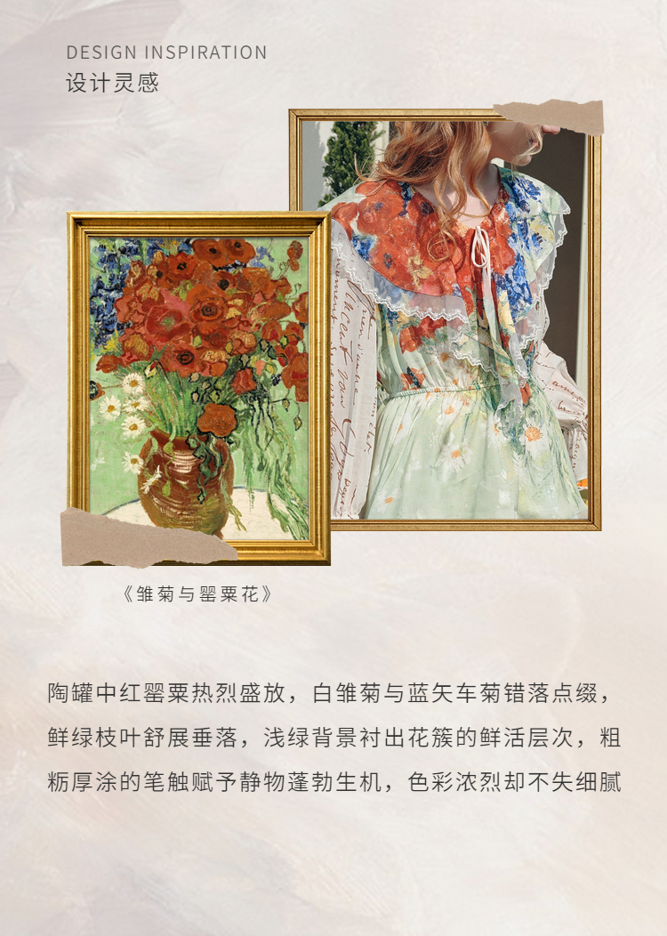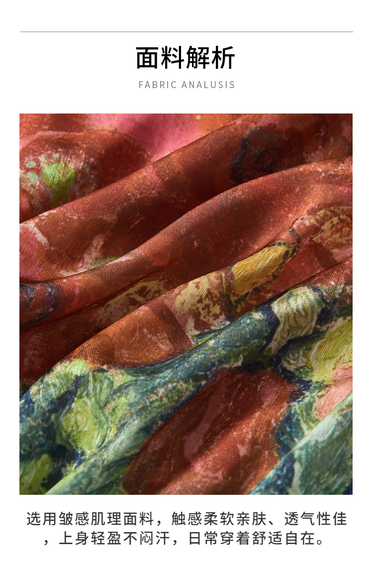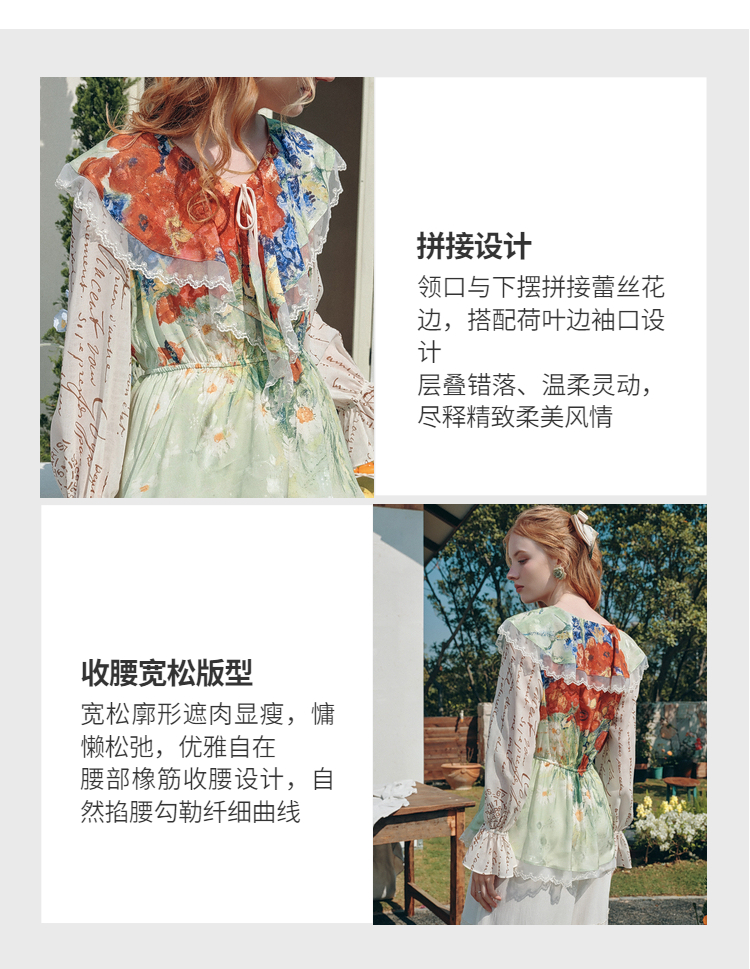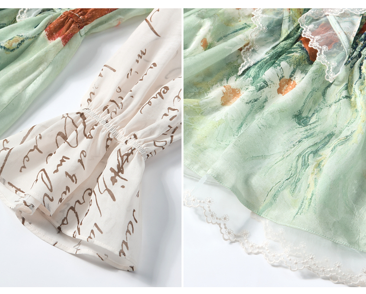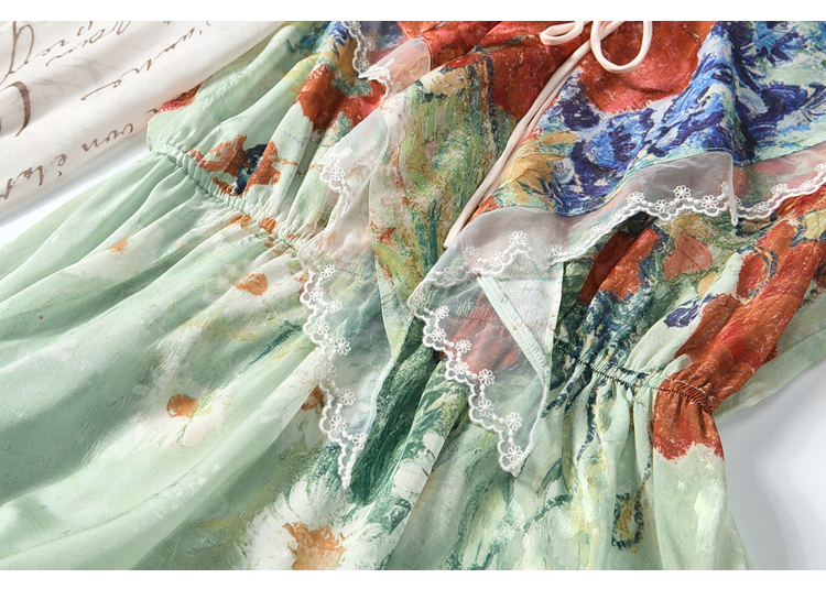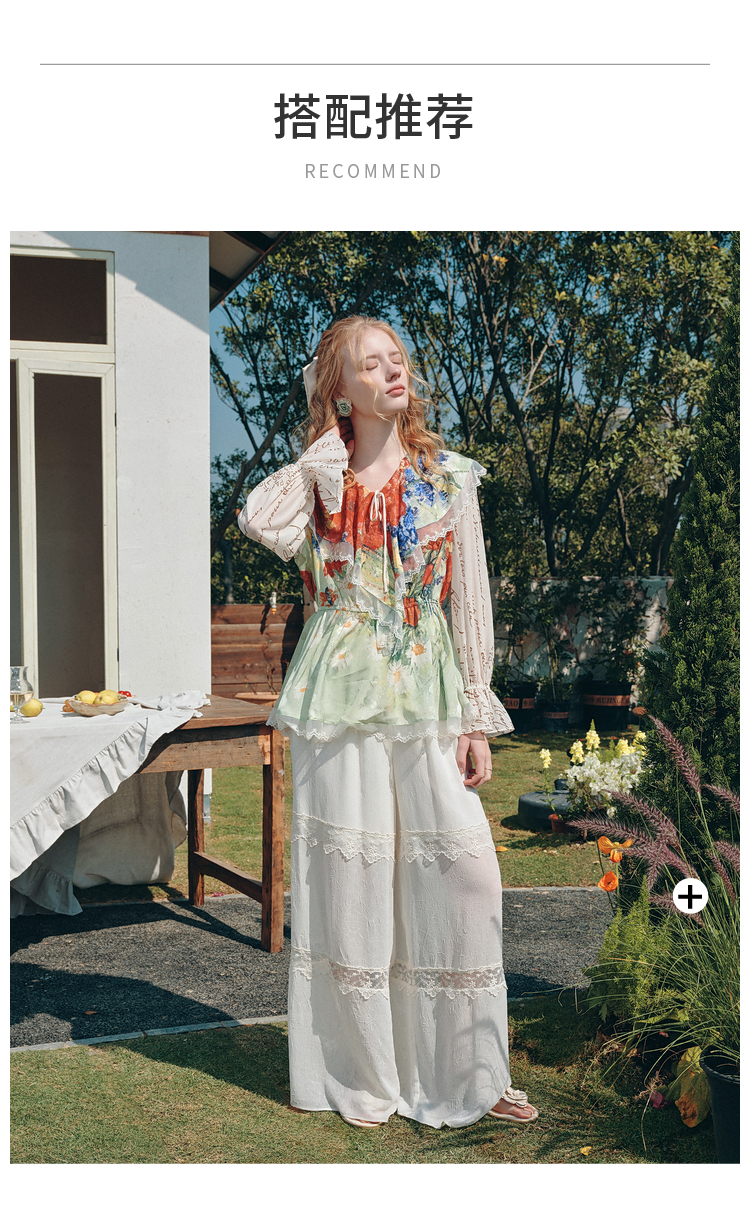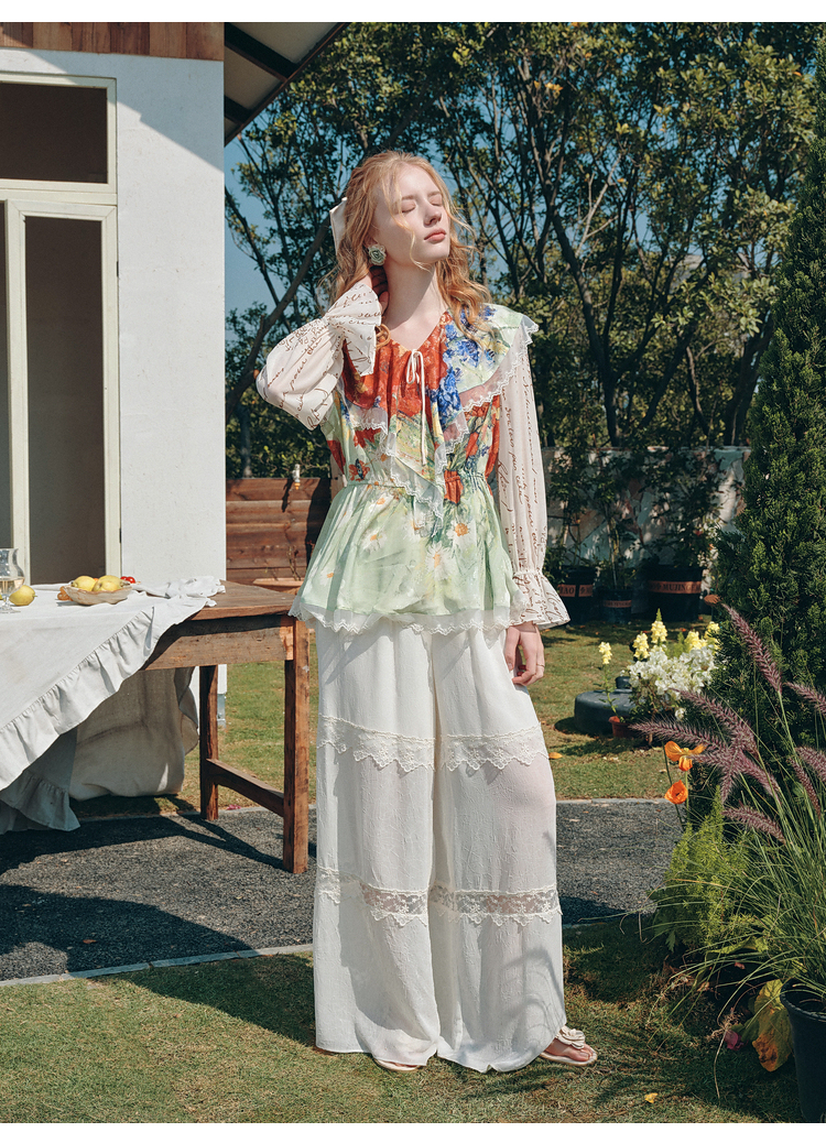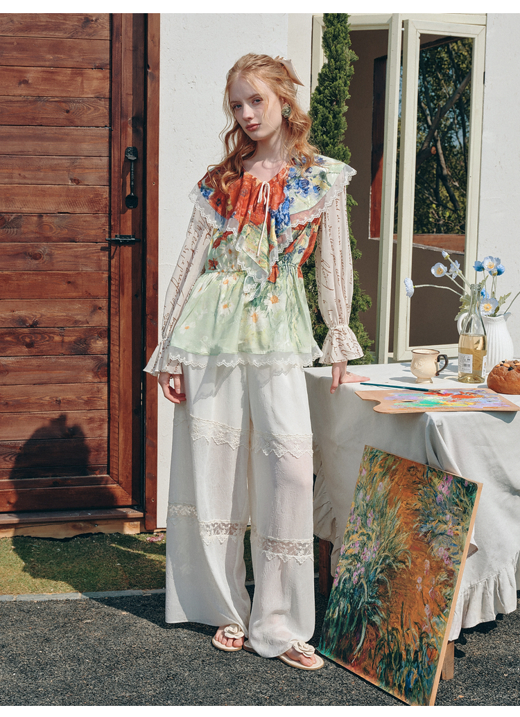 两三事梵高文艺抒情间奏2026夏季新款蕾丝拼接荷叶边领印花雪纺衫