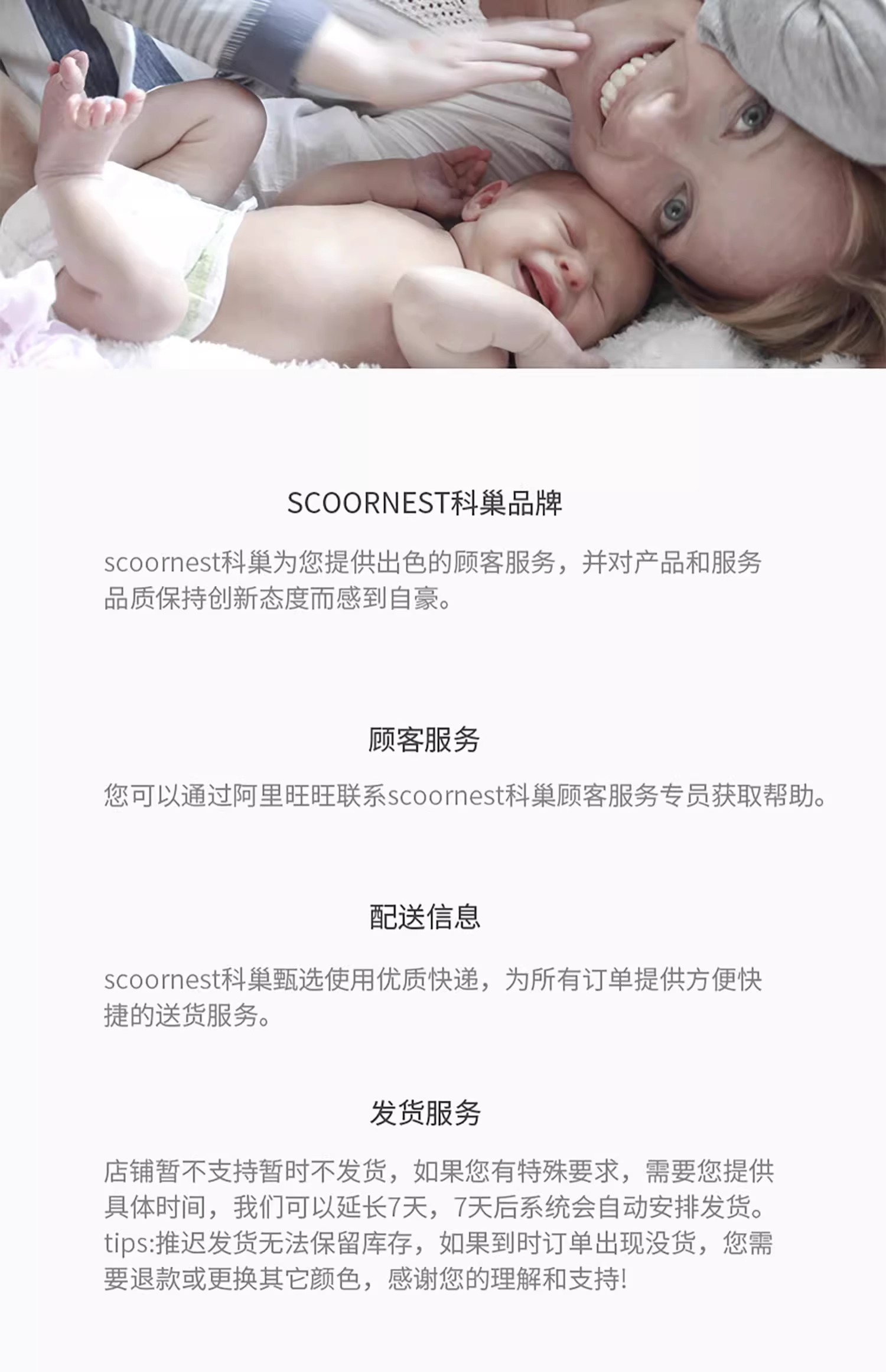 - Scoornest始终秉承给每一位宝宝送去科学的、关心的、创新的成长体验,通过提供商品和服务,使顾客形成守护、发展、巩固这种弥足珍贵的亲情的爱。