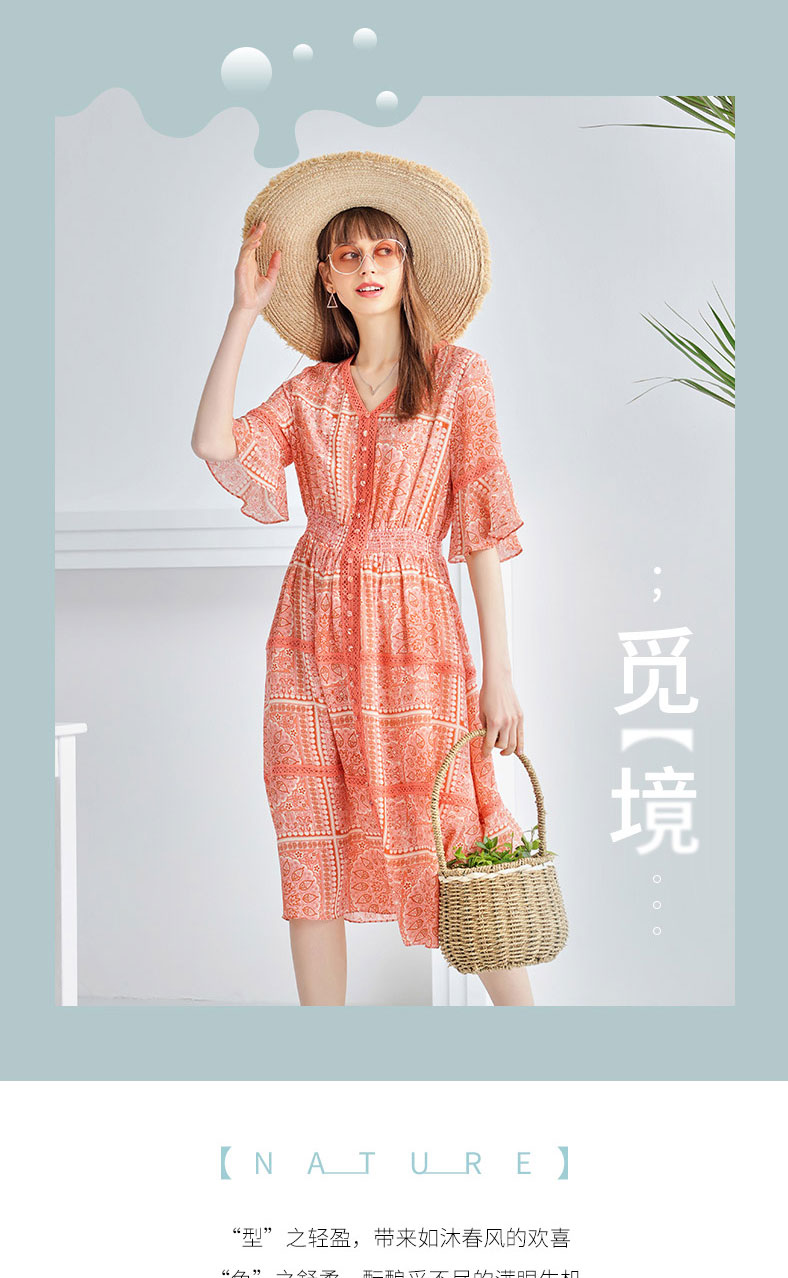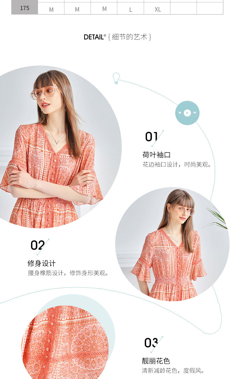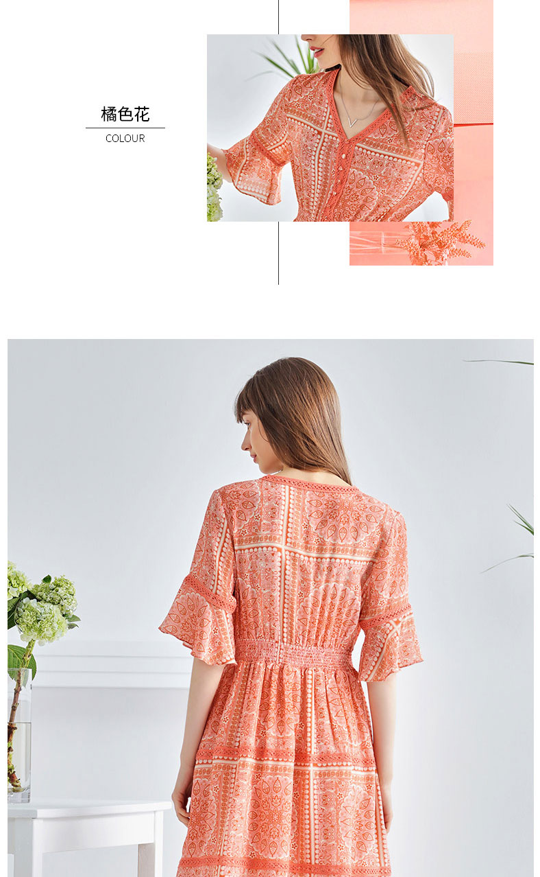 科蒙博卡夏季荷叶袖V领真丝裙 靓丽印花桑蚕丝中袖修身连衣裙KXPKKMLY27R1