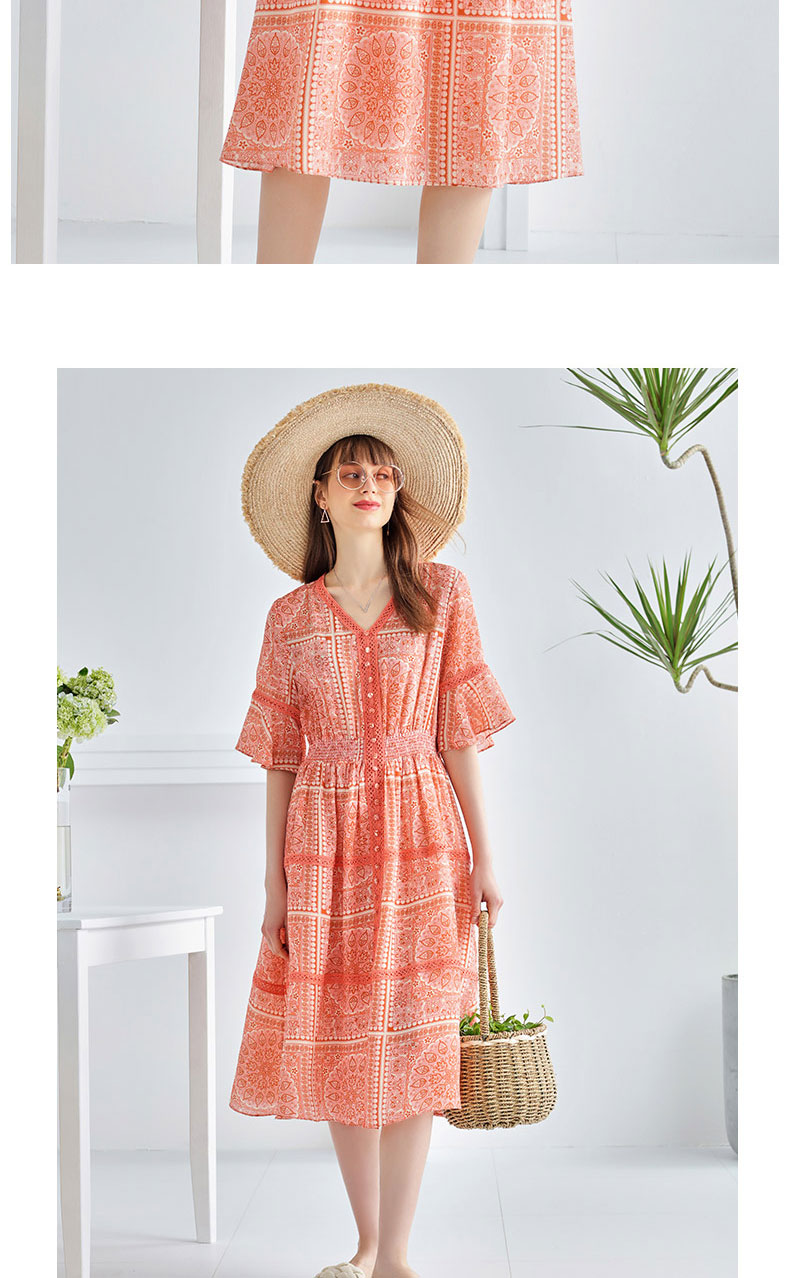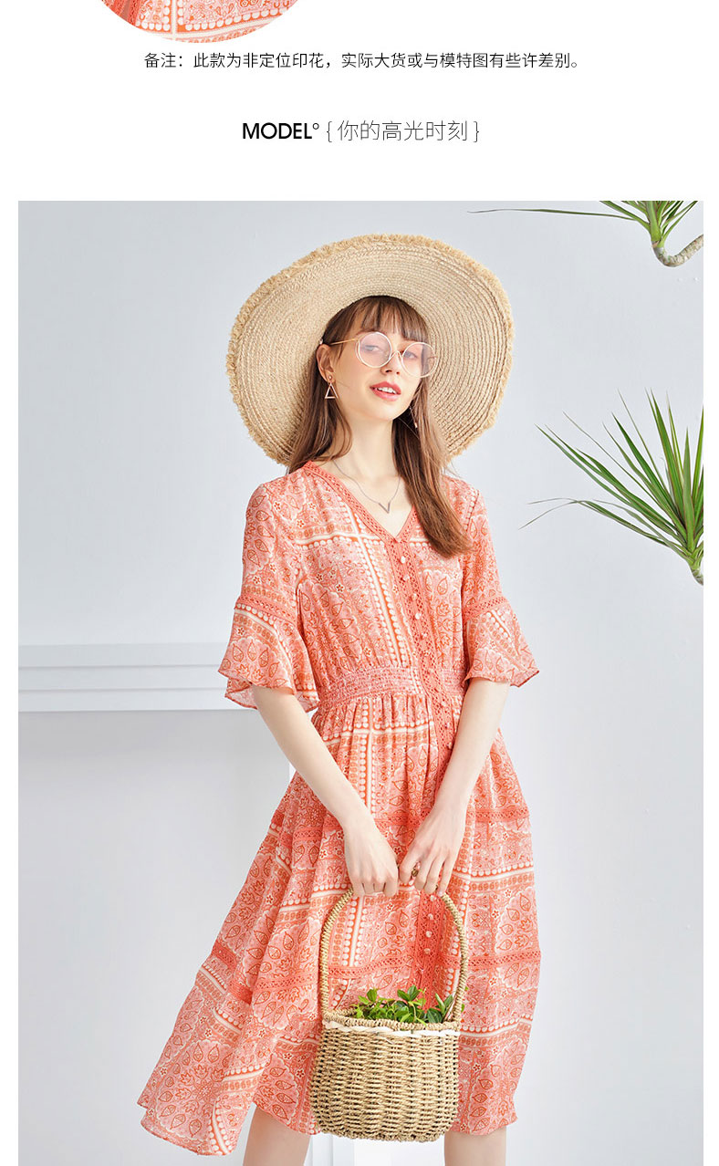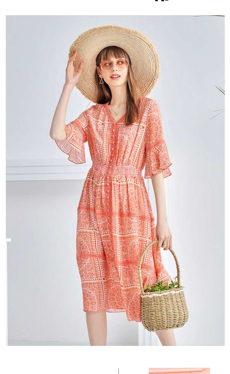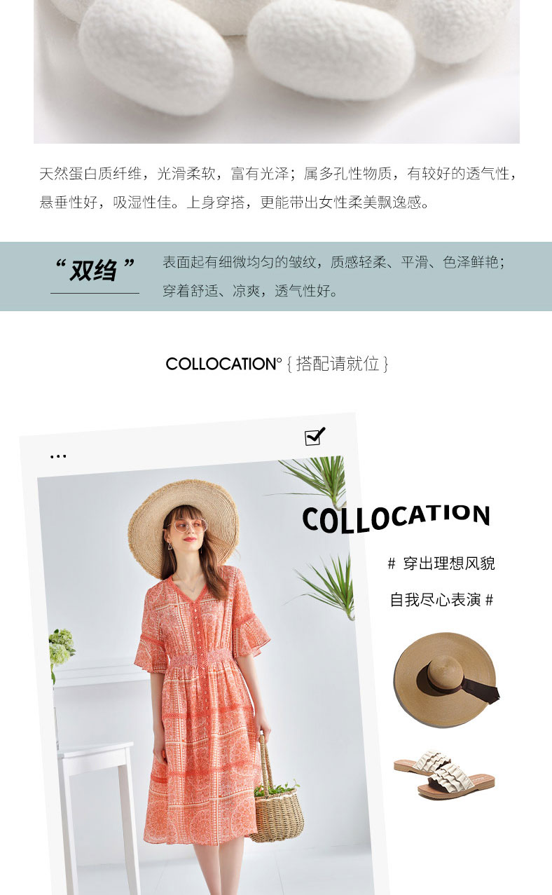 科蒙博卡夏季荷叶袖V领真丝裙 靓丽印花桑蚕丝中袖修身连衣裙KXPKKMLY27R1