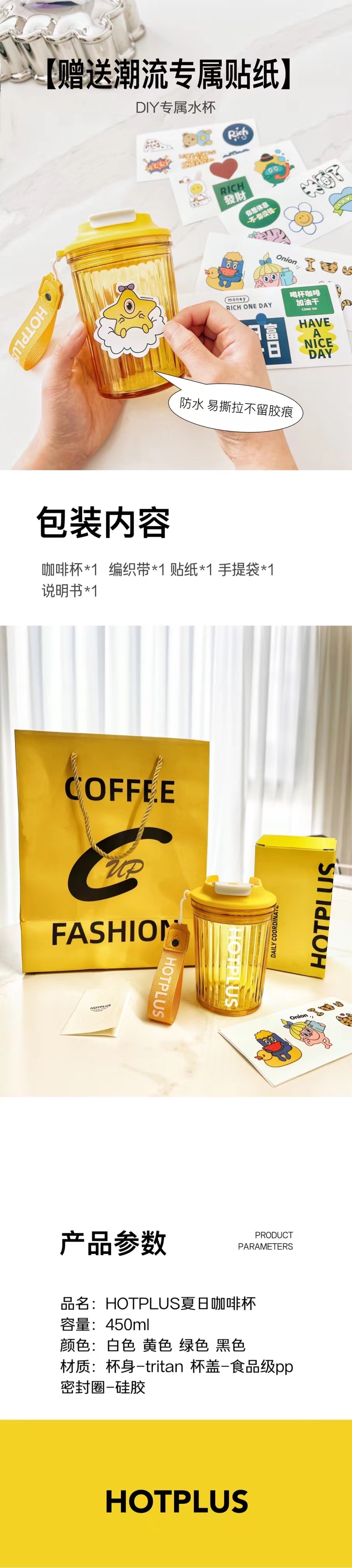 Tritan材质 杯体食品级材质 不含双酚A 安全防摔 易清洗 | HOTPLUS 夏日咖啡杯子 便携随手水杯450ML(不支持无理由退换)[福利品]
