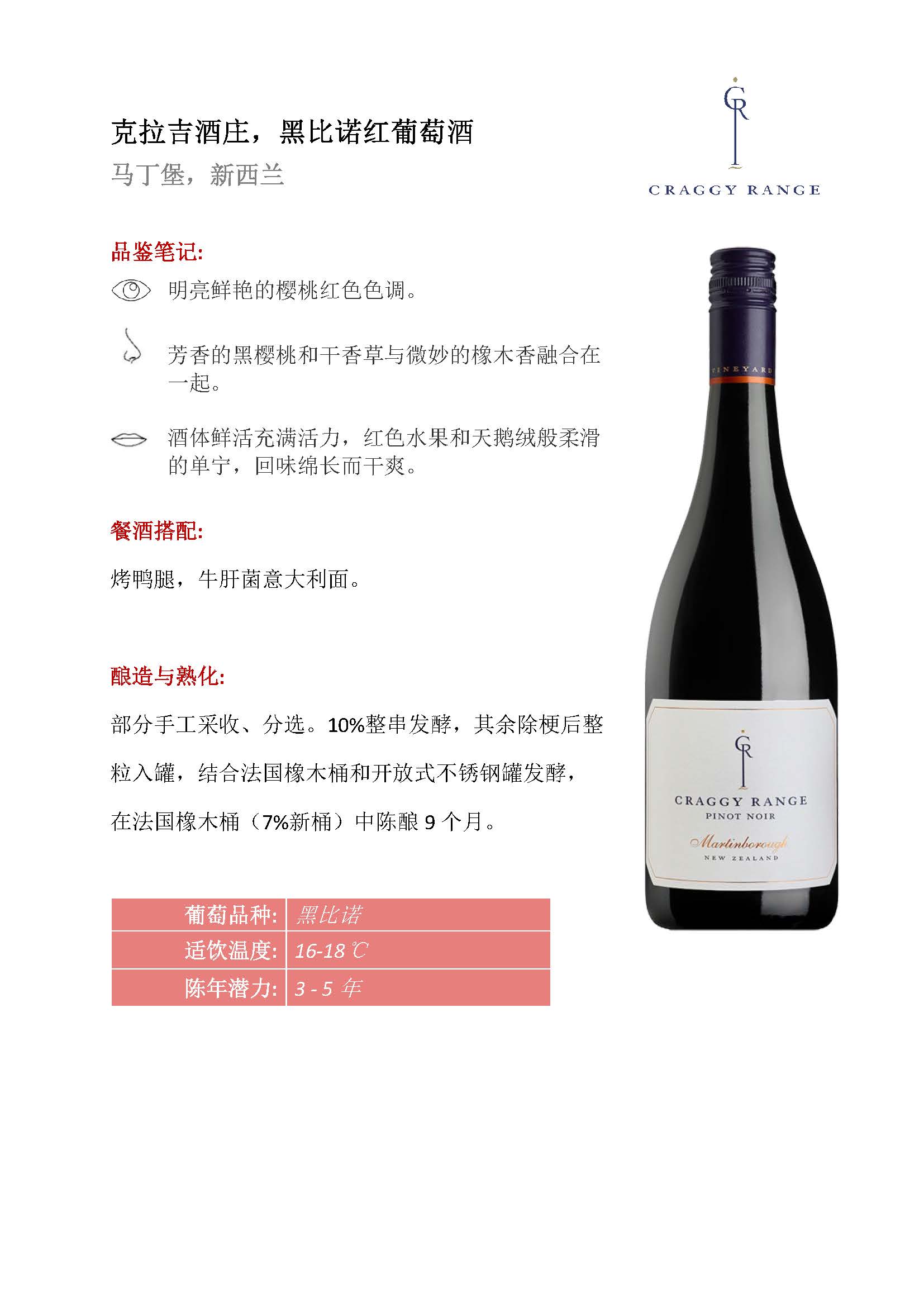 克拉吉酒庄黑比诺红葡萄酒