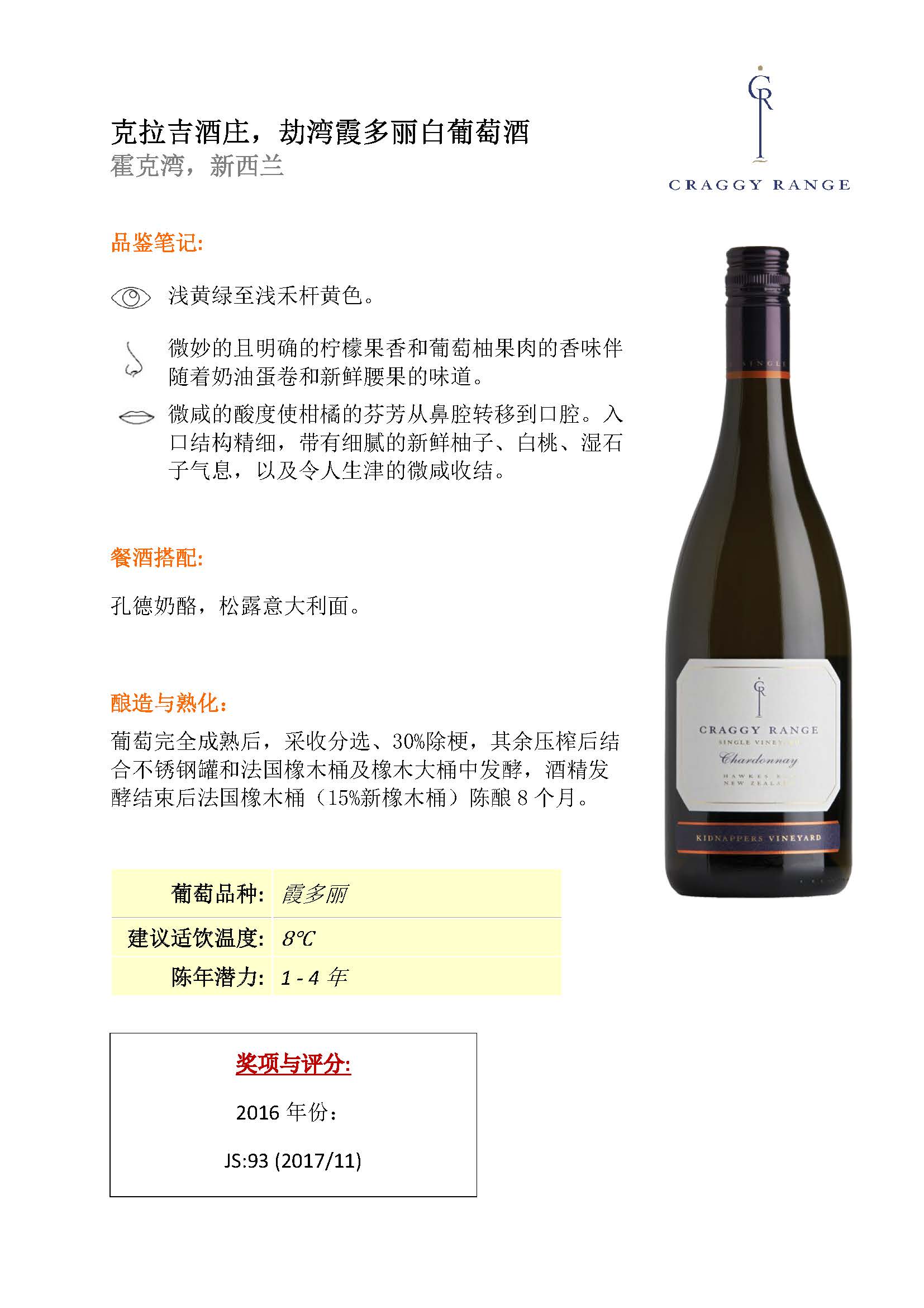 克拉吉酒庄劫湾霞多丽白葡萄酒