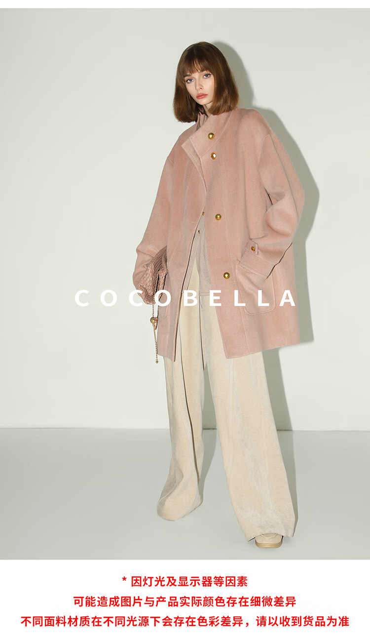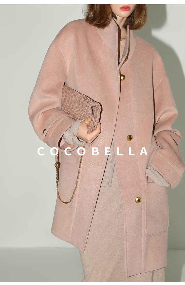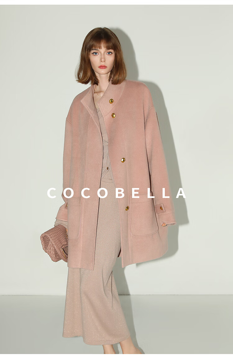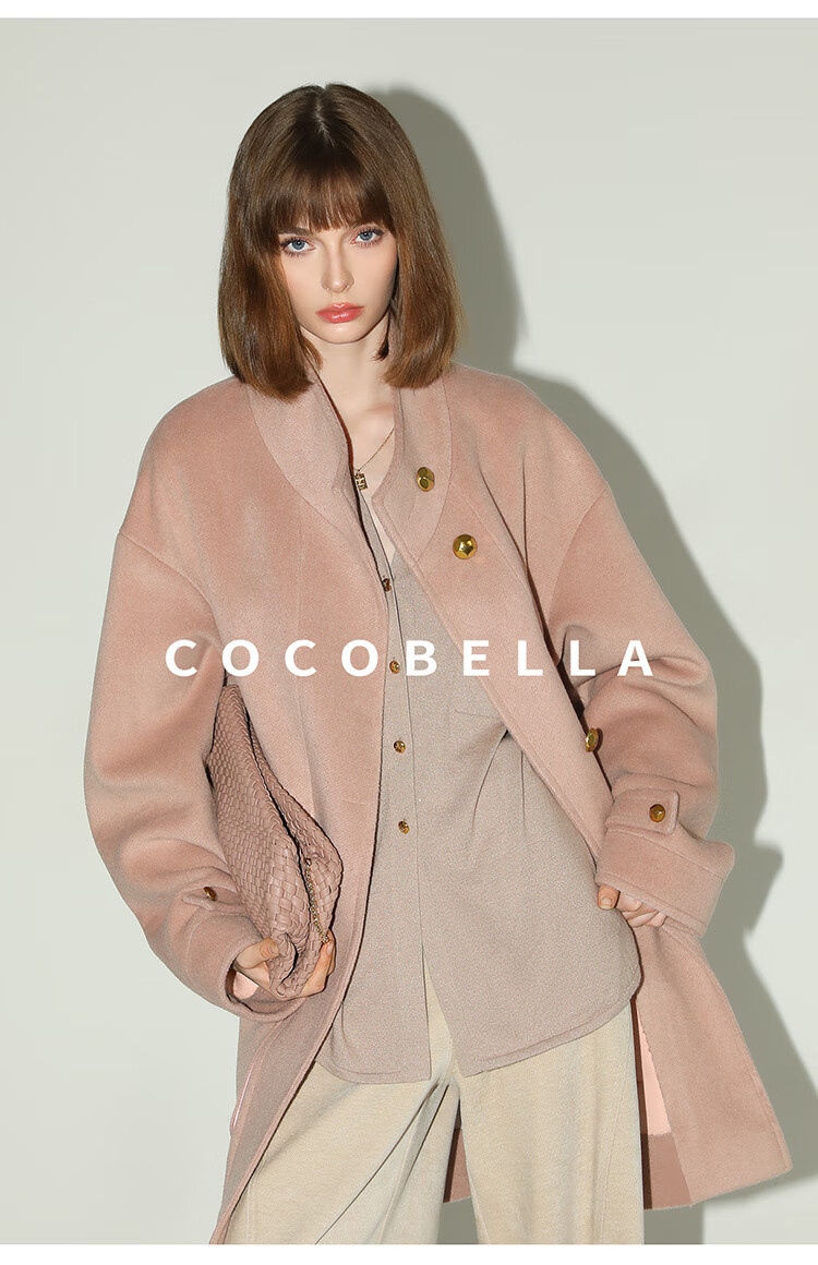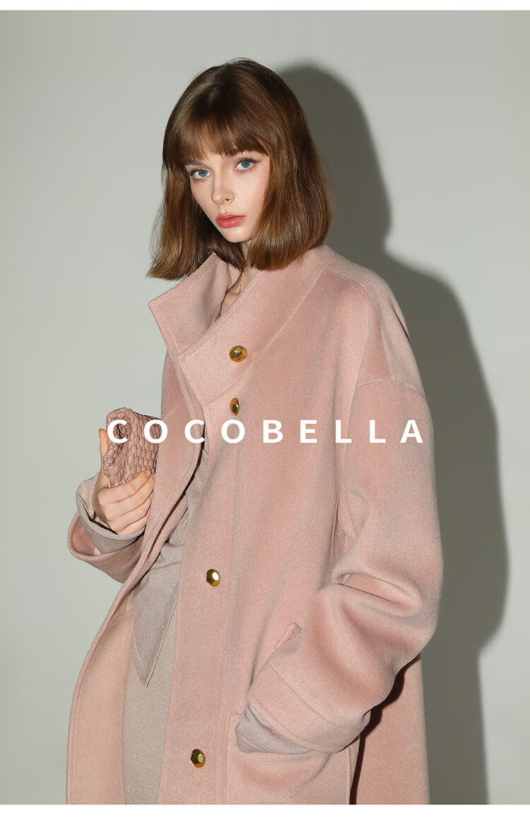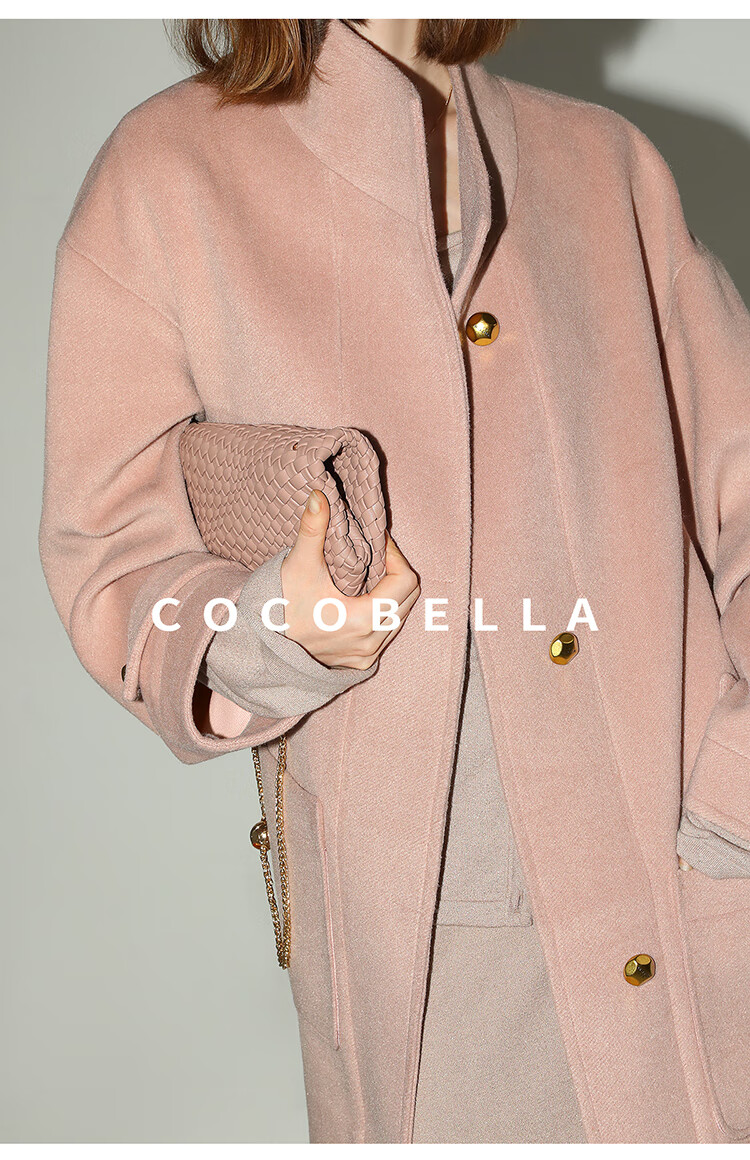 COCOBELLA气质粉温柔风毛呢外套质感金属扣中长款大衣WL7063