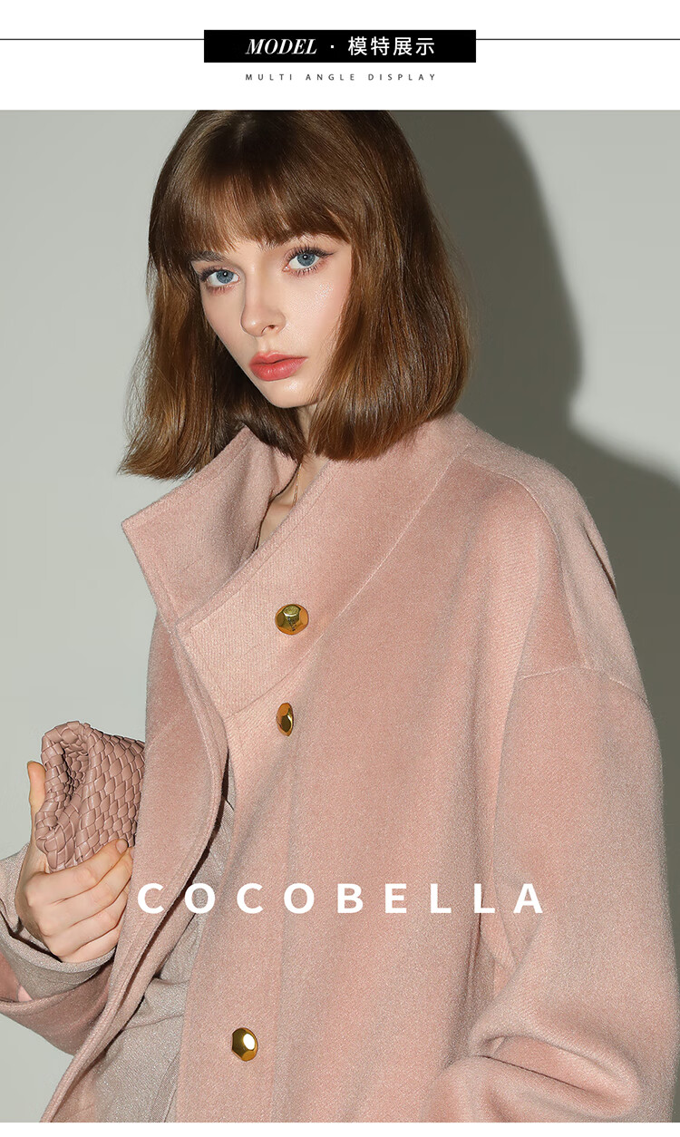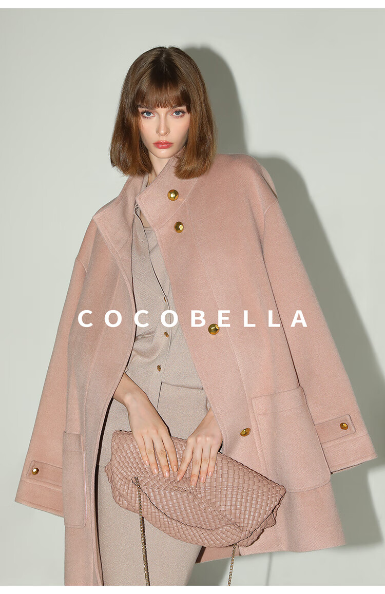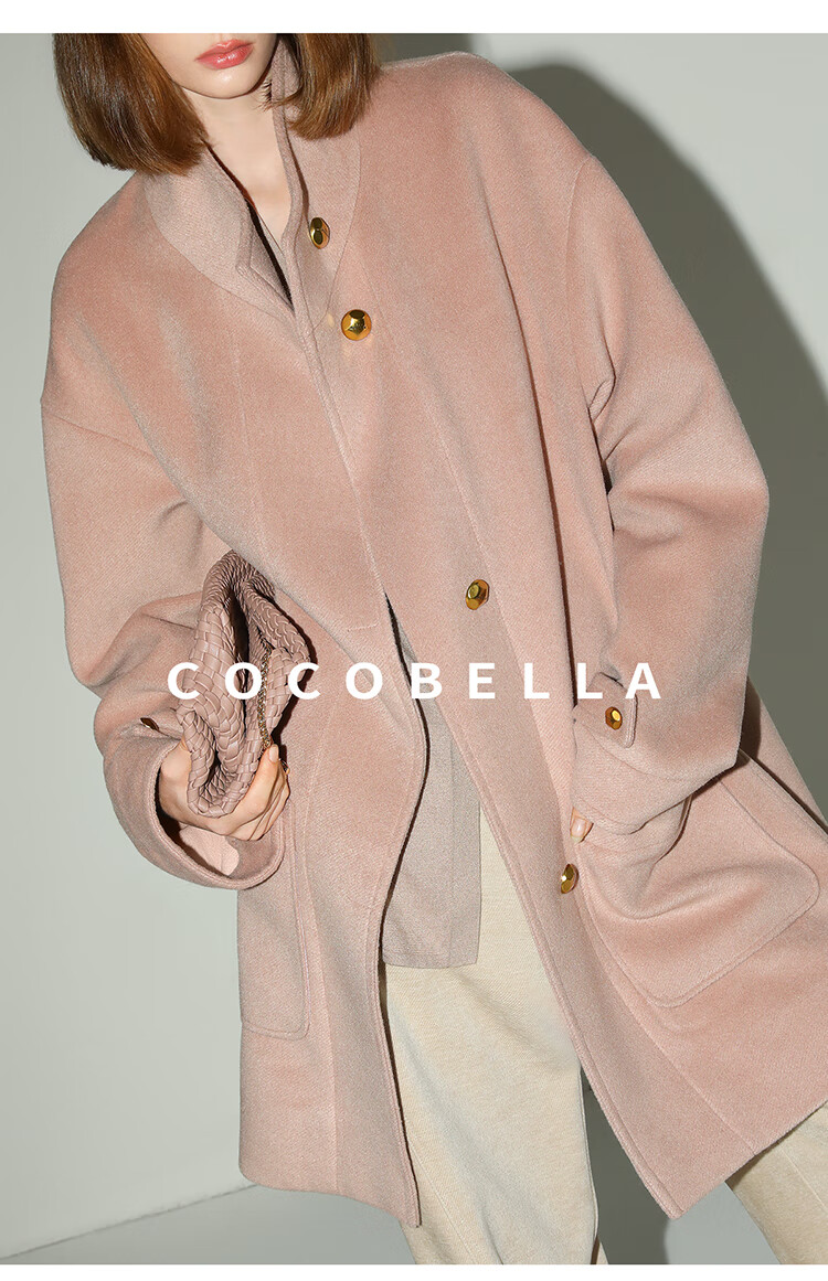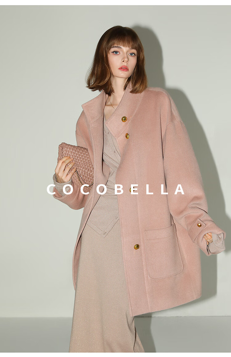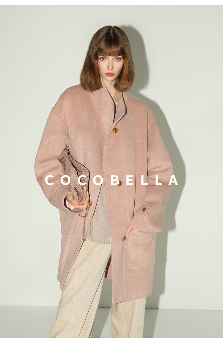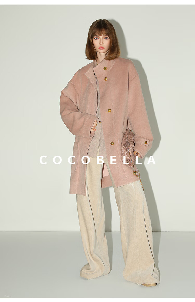 COCOBELLA气质粉温柔风毛呢外套质感金属扣中长款大衣WL7063