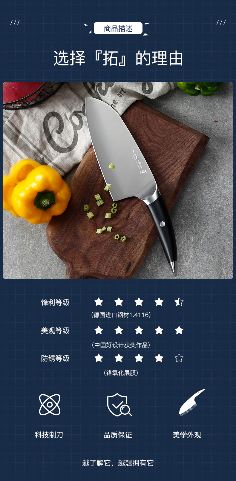 “拓”牌刀具为广东拓必拓科技股份有限公司旗下品牌,一直专注于研究、生产、销售专业厨房刀具,并与欧美、日本、台湾地区等多家知名品牌刀具进行合作,产品行销欧洲、美洲、日本等三十几个国家和地区。