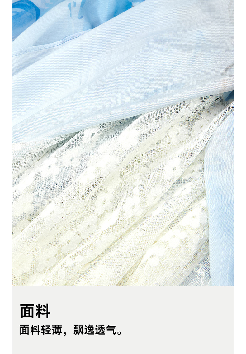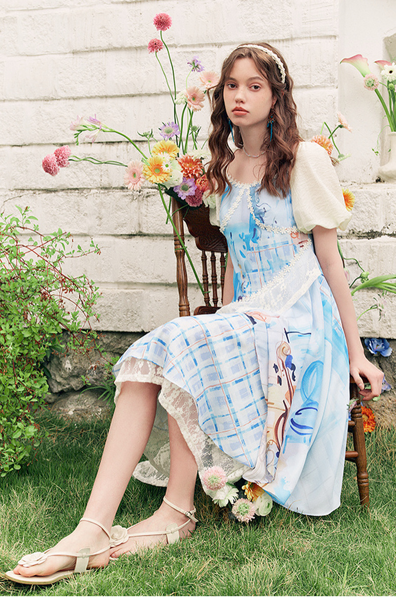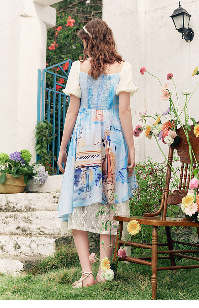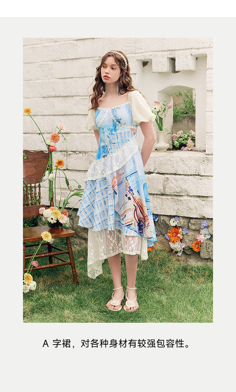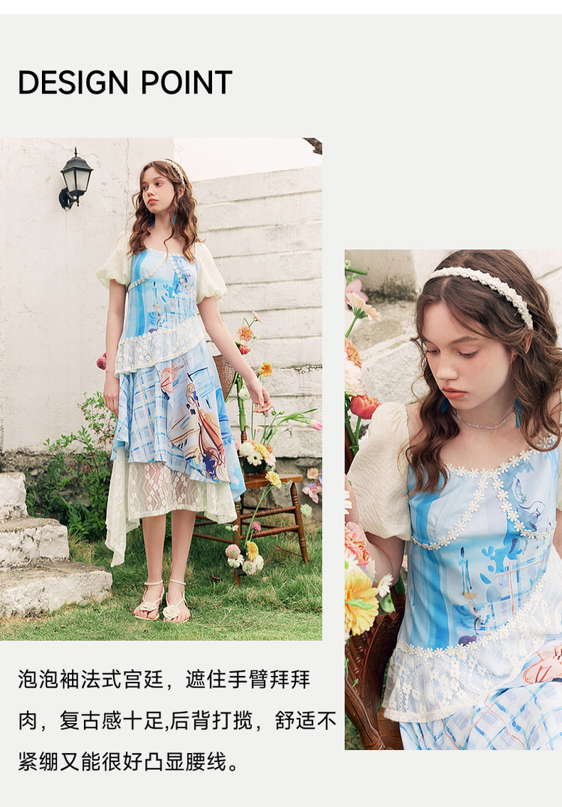 两三事 海风祈愿 2025夏季新款宫廷风蕾丝拼接印花泡泡袖连衣裙