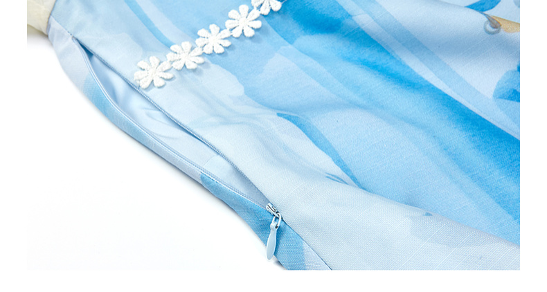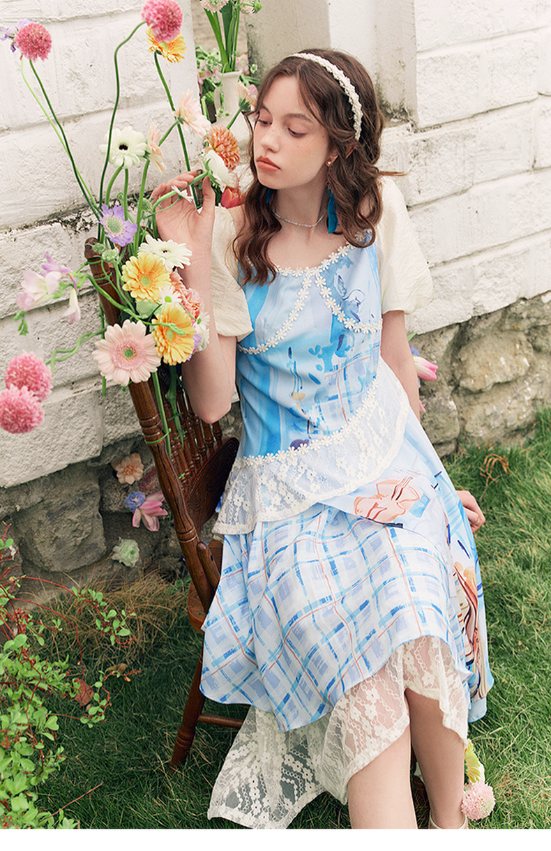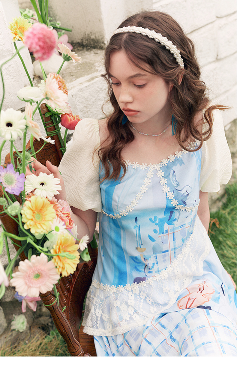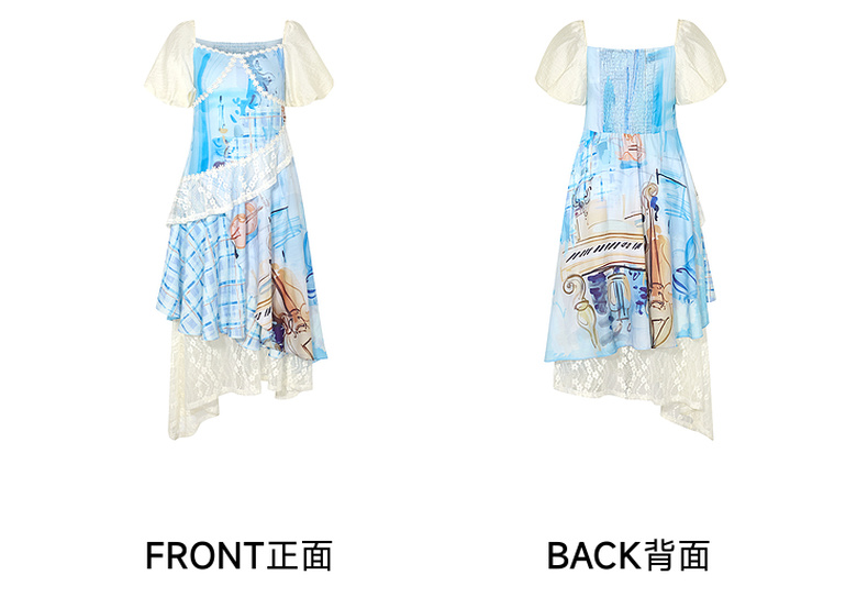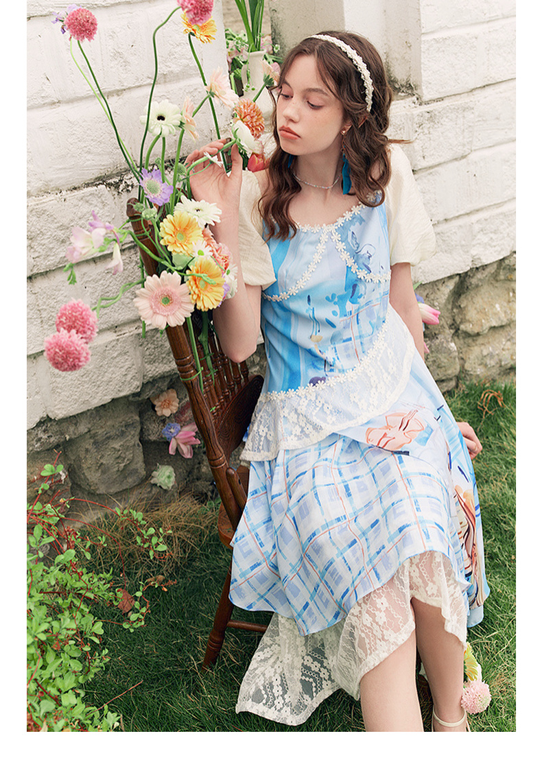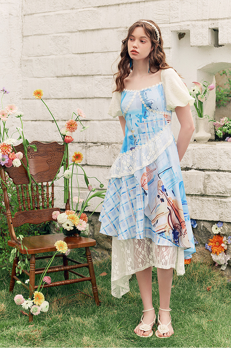 两三事 海风祈愿 2025夏季新款宫廷风蕾丝拼接印花泡泡袖连衣裙