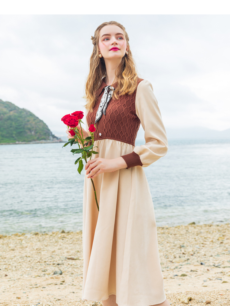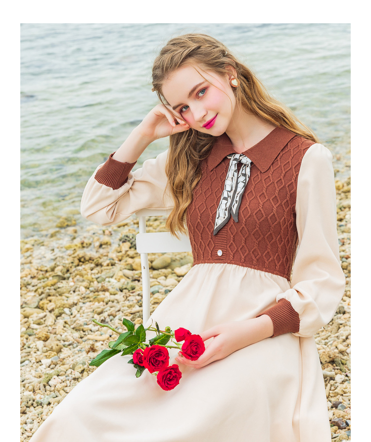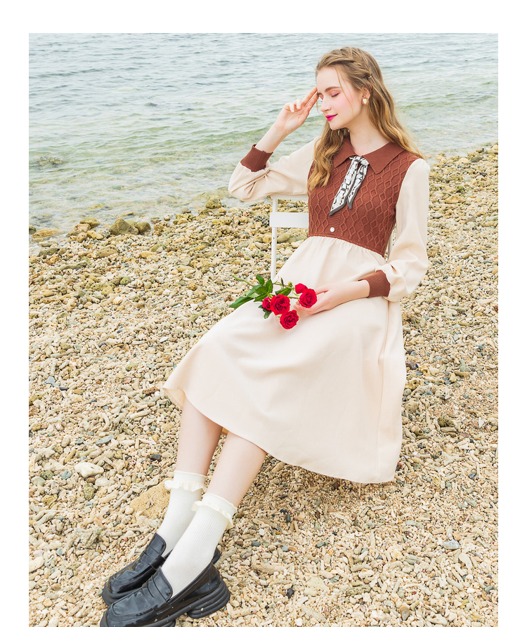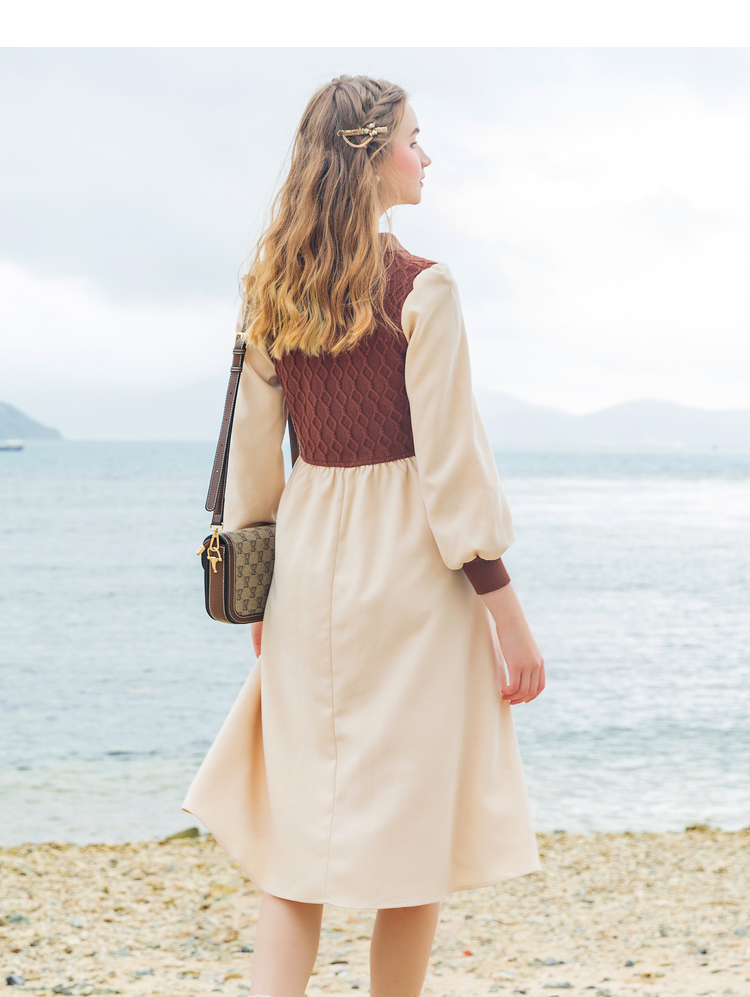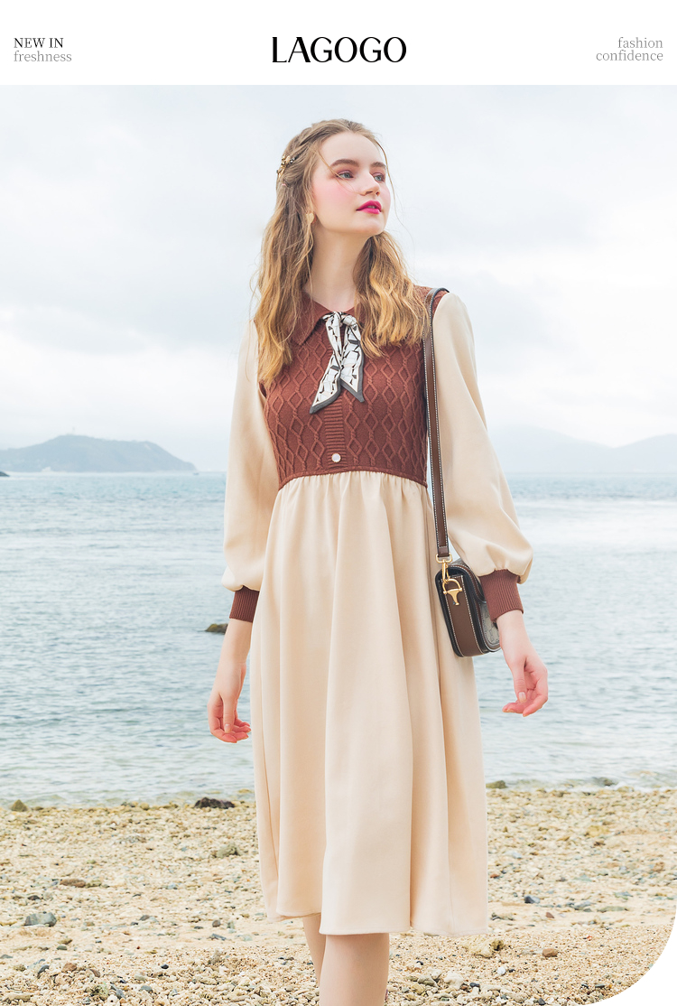 Lagogo拉谷谷2022年春季新款高腰撞色拼接复古气质连衣裙女学院风LALL751C62