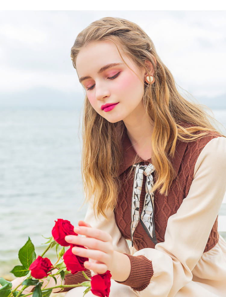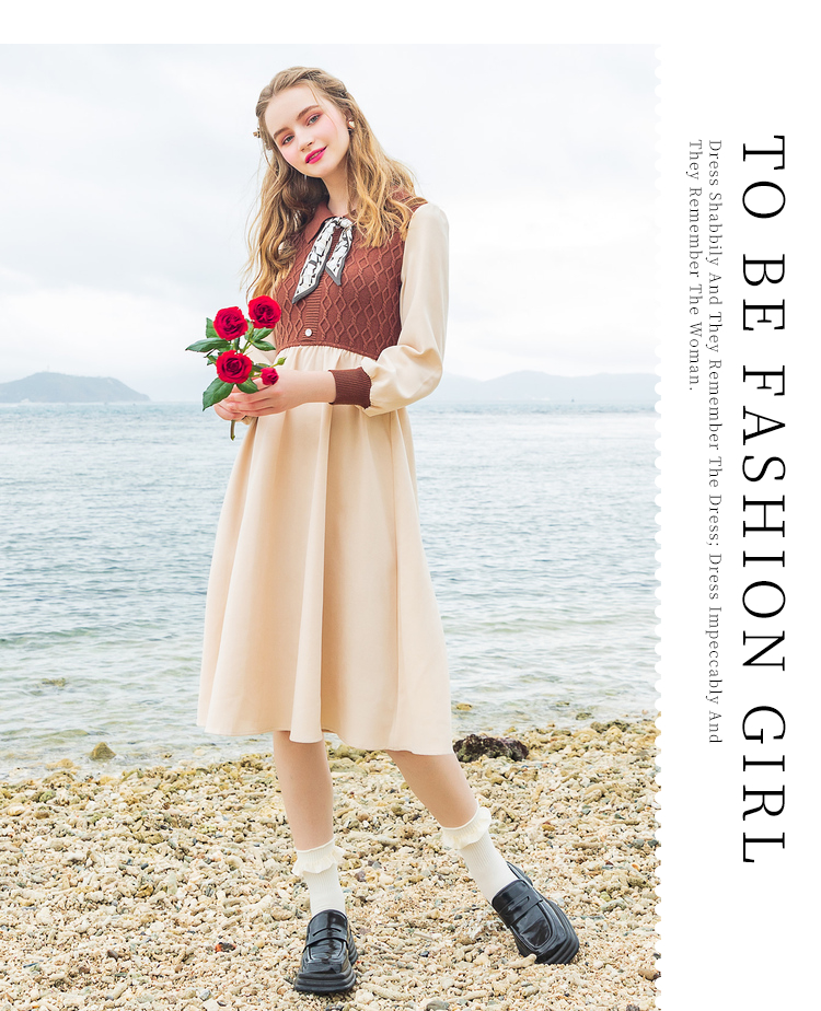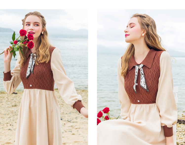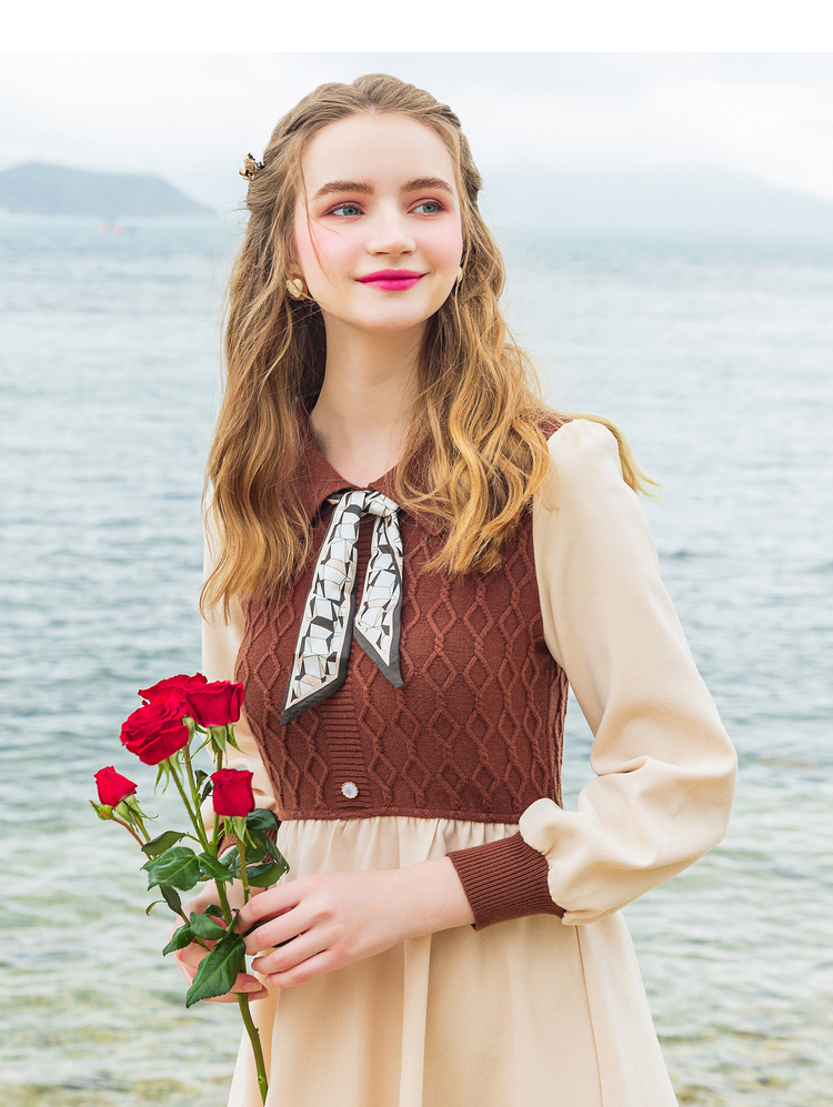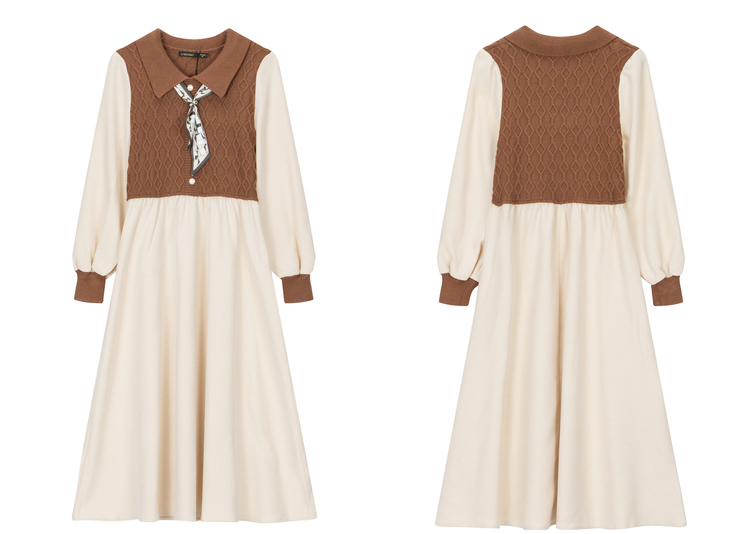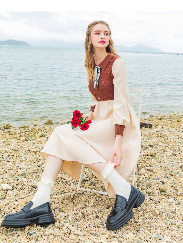 Lagogo拉谷谷2022年春季新款高腰撞色拼接复古气质连衣裙女学院风LALL751C62