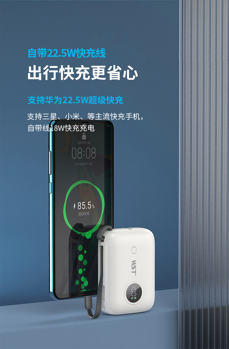 【出行必备】10000 毫安充电宝 快充自带线小便携 新国标 3C 认证 22.5W 轻薄便携移动电源 质保1年