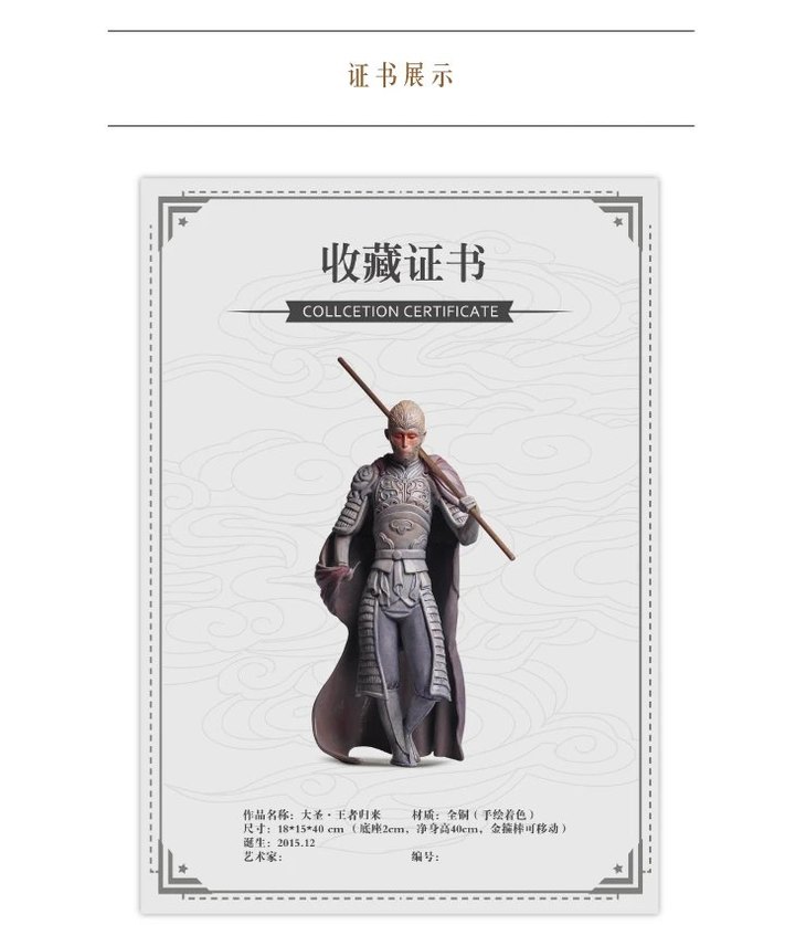 艺术家庄凯凯大圣系列雕塑《大圣·王者归来》 - 限量版艺术品作品尺寸:18 x 15 x 40cm材质:全铜版数:999版